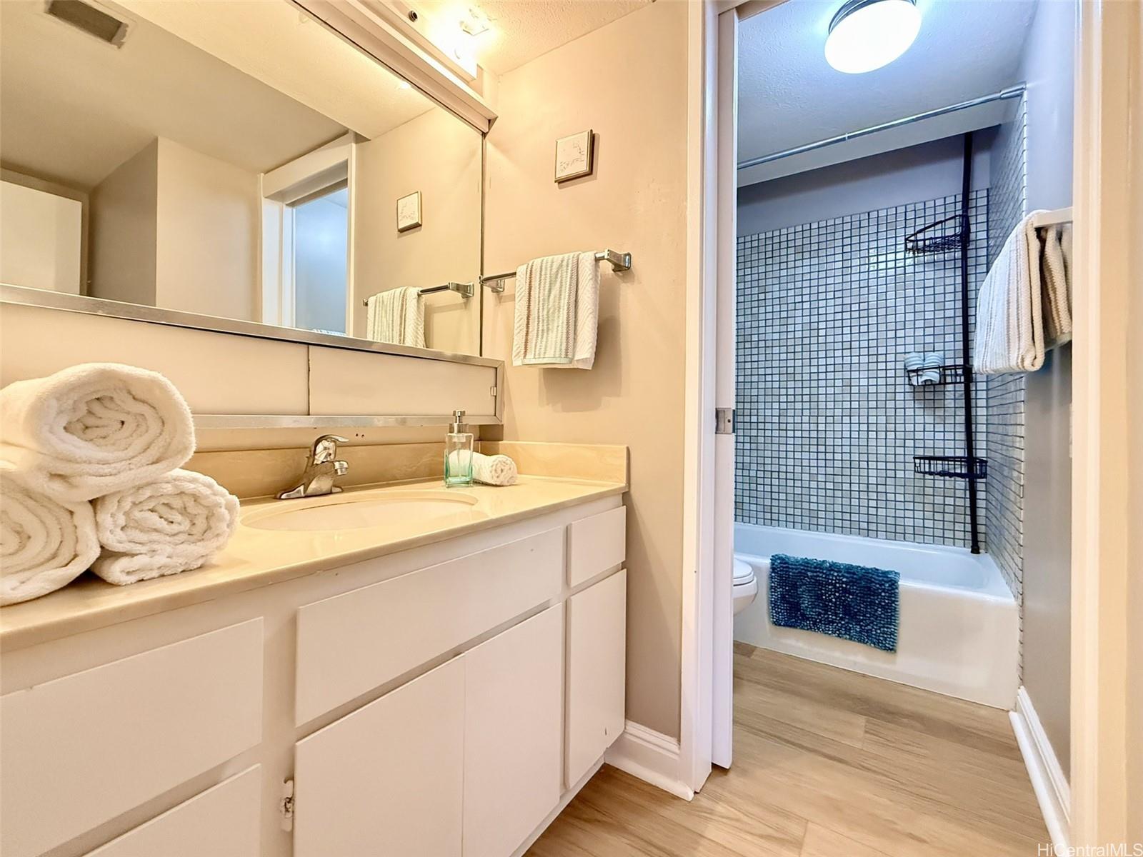 One of Kailua’s most tranquil resort-style communities, loved for its tropical landscaping, meandering koi ponds, and peaceful garden ambiance. This beautiful, well situated home offers generous space, privacy, and options for indoor-outdoor living. Welcome home to a dramatic wall of windows anchoring the main living area overlooking serene koi ponds, swaying palms, and greenery. High ceilings enhance the light-filled, treehouse-like retreat cooled by gentle tradewinds, with breathtaking floor-to-ceiling mountain views from the private lanai, kitchen, living room, and rooftop terrace. The open-concept layout is ideal for everyday living and entertaining. The primary suite downstairs boasts a large walk-in closet and ensuite bath, two bedrooms plus full bath upstairs. Ample closets and storage throughout. The rooftop lanai is perfect for relaxing or hosting against the backdrop of mountain vistas. Two covered parking stalls. Easy path to parking and Windward Harbour's exceptional amenities, pool, spa, sauna, tennis courts, BBQ areas, and rec room. Secured entry. All just minutes from famous Kailua beaches, shopping, dining, and outdoor adventures—this is island living at its best.