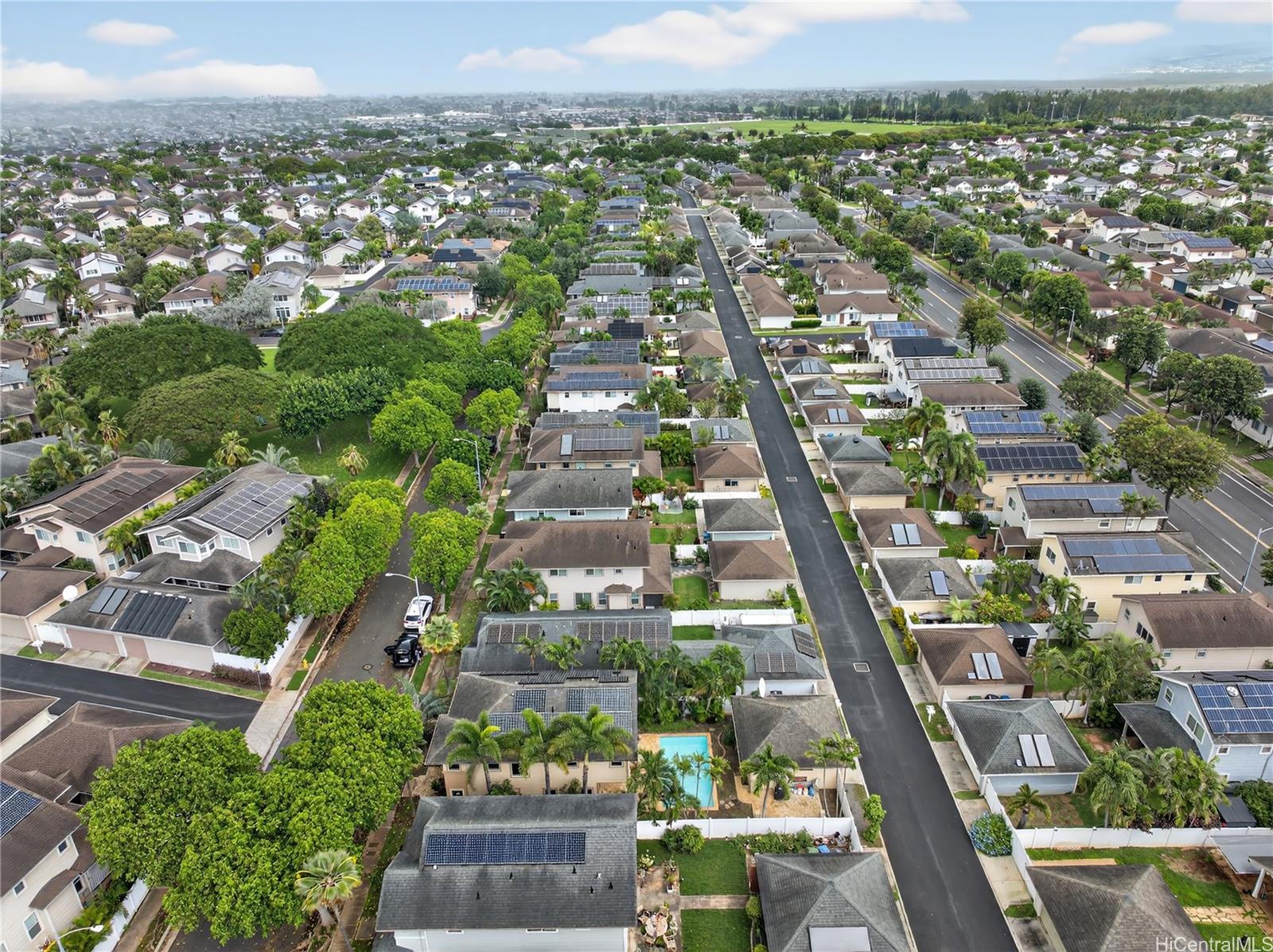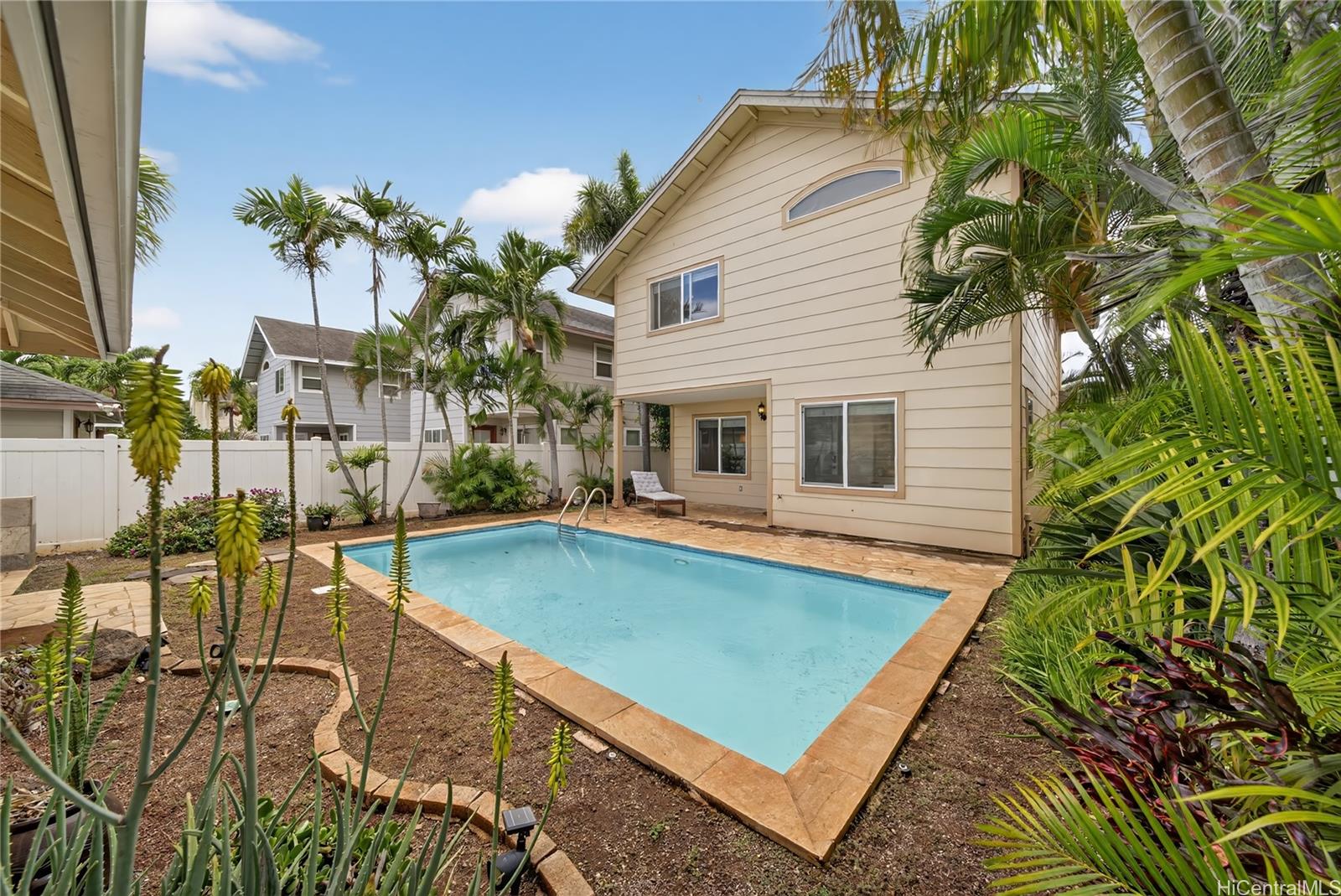 Welcome home to Ke Noho Kai in Ocean Pointe — one of Ewa Beach's most sought-after communities. This well-maintained 3-bed, 2.5-bath home delivers smart, comfortable living with the kind of extras that make a real difference day to day. Inside, vaulted ceilings open up the main living area with natural light throughout. Hardwood and ceramic tile flooring run through the home, leading into a kitchen with modern appliances and solid counter space. The layout flows naturally — easy to live in, easy to entertain in. Out back, a fully fenced private courtyard features a gunite pool surrounded by lush tropical landscaping. It's the kind of backyard you actually want to spend time in. Energy costs? Handled. A 31-panel owned PV solar system and central AC keep this home efficient and comfortable year-round. You also get a 2-car garage plus an extended driveway — extra parking that's hard to find in this neighborhood. Location puts you minutes from the Wai Kai waterfront, Ka Makana Ali'i for shopping and dining, and some of West Oahu's best beaches. This is a lot of home for Ocean Pointe. Don't sleep on it.