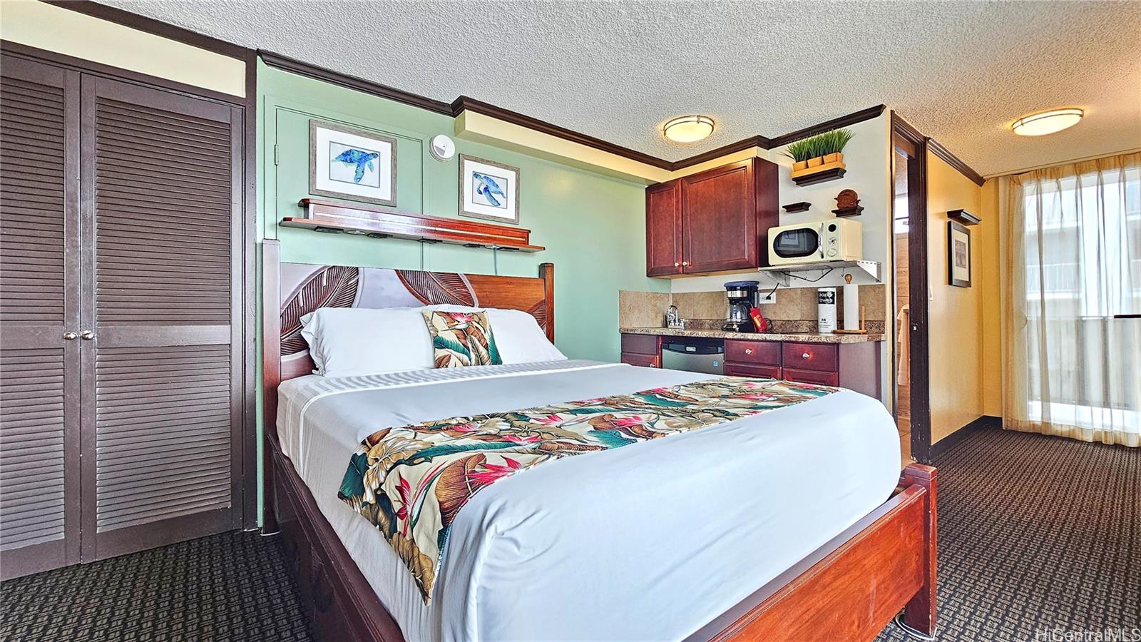 ワイキキの中心部に位置するバンブーホテル(住所:2425 Kuhio Ave #1001)の合法的なバケーションレンタルです。ワイキキビーチ、レストラン、インターナショナルマーケットプレイスまで徒歩圏内です。改装済みの10階クイーンスタジオからはトロピカルプールが一望でき、山、街の夜景、そして一部オーシャンビューを楽しめる3つの大きなプライベートラナイを備えています。ワイキキのスタジオとしては珍しい屋外スペースで、朝のコーヒー、爽やかな島のそよ風、夜の街の夜景を楽しむのに最適です。室内は快適さと利便性を追求した設計で、静かなスプリットエアコンと、自然光を取り込みながらも静かな空間を保つ大きな遮音スライドガラスドアが設置されています。簡易キッチンには、IHクッキングヒーター、電子レンジ、コーヒーメーカー、小型冷蔵庫が備わっており、滞在中に簡単な食事を簡単に準備できます。バスルームは広々としたウォークインシャワーにアップグレードされ、一般的なバスタブレイアウトに比べて清潔でモダンな雰囲気です。ゲストは、海水プール、ホットタブ、緑豊かなヤシの木が茂るバンブーホテルのリラックスできるトロピカルコートヤードをご利用いただけます。ビーチチェアとタオルが備え付けられているので、わずか1ブロックほど先のビーチへは手軽に行くことができます。