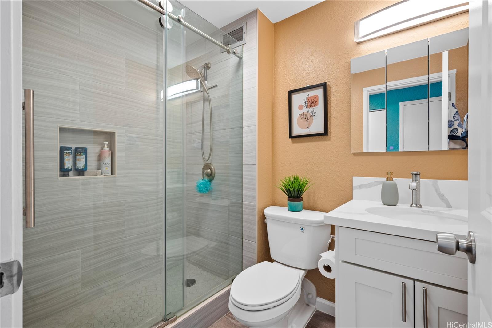 Nearly $100,000 in upgrades to this move-in ready unit! There are upgraded picturesque living room windows at a cost of $17,942.89 done in January 2021. This window system replaced the 49-year-old, single-paned window that most units still have. The new window system utilizes modern, dual-pane, low e, 1" insulated glass which is substantially quieter and reflects much more of the sun's heat (infrared radiation) and damaging rays (ultra violet radiation). The Class I clear anodized aluminum extrusions are also much thicker for increased wind load capacity meeting modern requirements. The bedroom window was also recently replaced with a double paned slider. Also in 2021, a full unit renovation was done, including removal of the popcorn ceiling, luxury vinyl plank flooring added, and interior painting. Kitchen design is unique, with the sink in the rounded corner, soft close cabinets and quartz counter tops. Shower has a cute sliding barn door. All furniture is included (purchased from Ashley Honolulu), including a sofa that can be converted into a queen size bed. For the past 5 yrs, this unit has been used as a second vacation home so it's hardly been used and in excellent condition.