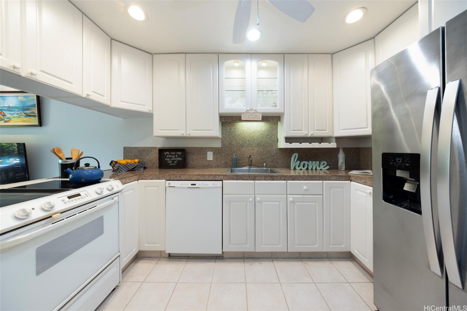 Experience refined island living at Napua Point #17, a spacious two-story townhome blending modern elegance with an inviting layout. Upon entering, a well-designed floor plan unfolds into the primary living space, which features a dedicated dining area and a spacious living room. The main living area extends outside to a private lanai shrouded in lush island landscaping, enjoying peek-a-boo ocean views. The adjacent kitchen offers a highly functional culinary space. Accommodations begin with a downstairs guest bedroom and half-bath, while upstairs reveals two large bedrooms, highlighted by an elegant primary suite featuring a walk-in closet, double-vanity ensuite, and partial Pacific Ocean views. Napua Point is a boutique oceanfront townhome of just 18 residences located along a quiet cul-de-sac in Hawaii Kai. Amenities include an extra-large swimming pool, a full-size tennis court, canoe storage, and rare sandy beach frontage. Located in Hawaii Kai near Kuliouou Beach Park, this residence is the ideal island retreat in a uniquely private setting.