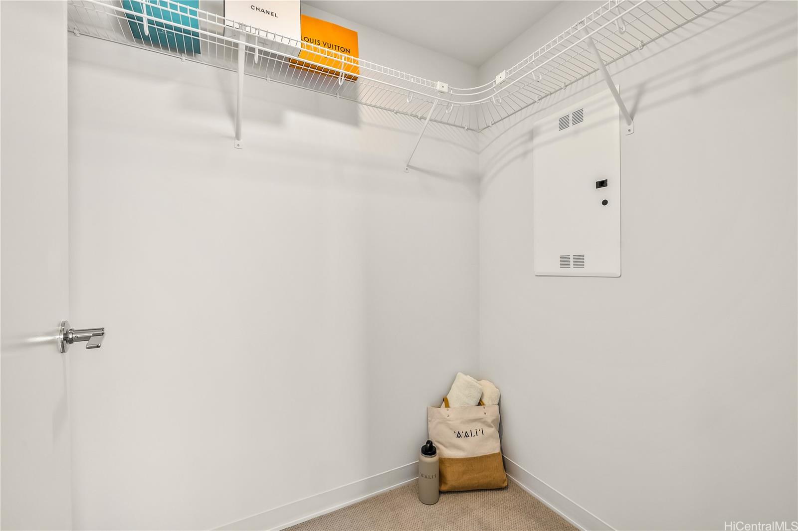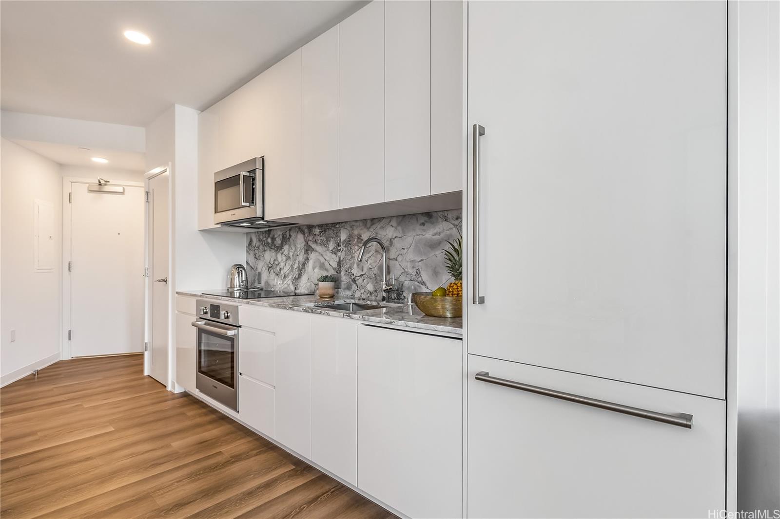 This gorgeous and immaculate high floor residence comes with more than $100,000 of upgrades including its own EV Outlet for the unit’s parking stall, specious Walk-in Storage Room (approx. 44 sq ft), two storage lockers all on level 6 conveniently located near the elevator, and Developer's original Turn-Key Package crafted by renowned interior designer Lauren Rottet at Rottet Studio! Enjoy cool breezes, panoramic mountains, and city views. The fresh vibrant interior features contemporary elegant finishes throughout. Natural stone countertops with full-height backsplashes, Bosch kitchen appliances, beautiful flooring in the living room and walk-in closet in the bedroom. Stylish amenities include a rooftop Sky deck with breathtaking ocean view, fitness center, Yoga room, resort style pools, jacuzzi, private cabanas, BBQ areas, indoor/outdoor lounge, dog park, children's play area and more. It is Pet friendly! Close to the Whole Foods market, restaurants, shops, parks, Kewalo boat harbor and Ala Moana Beach Park.