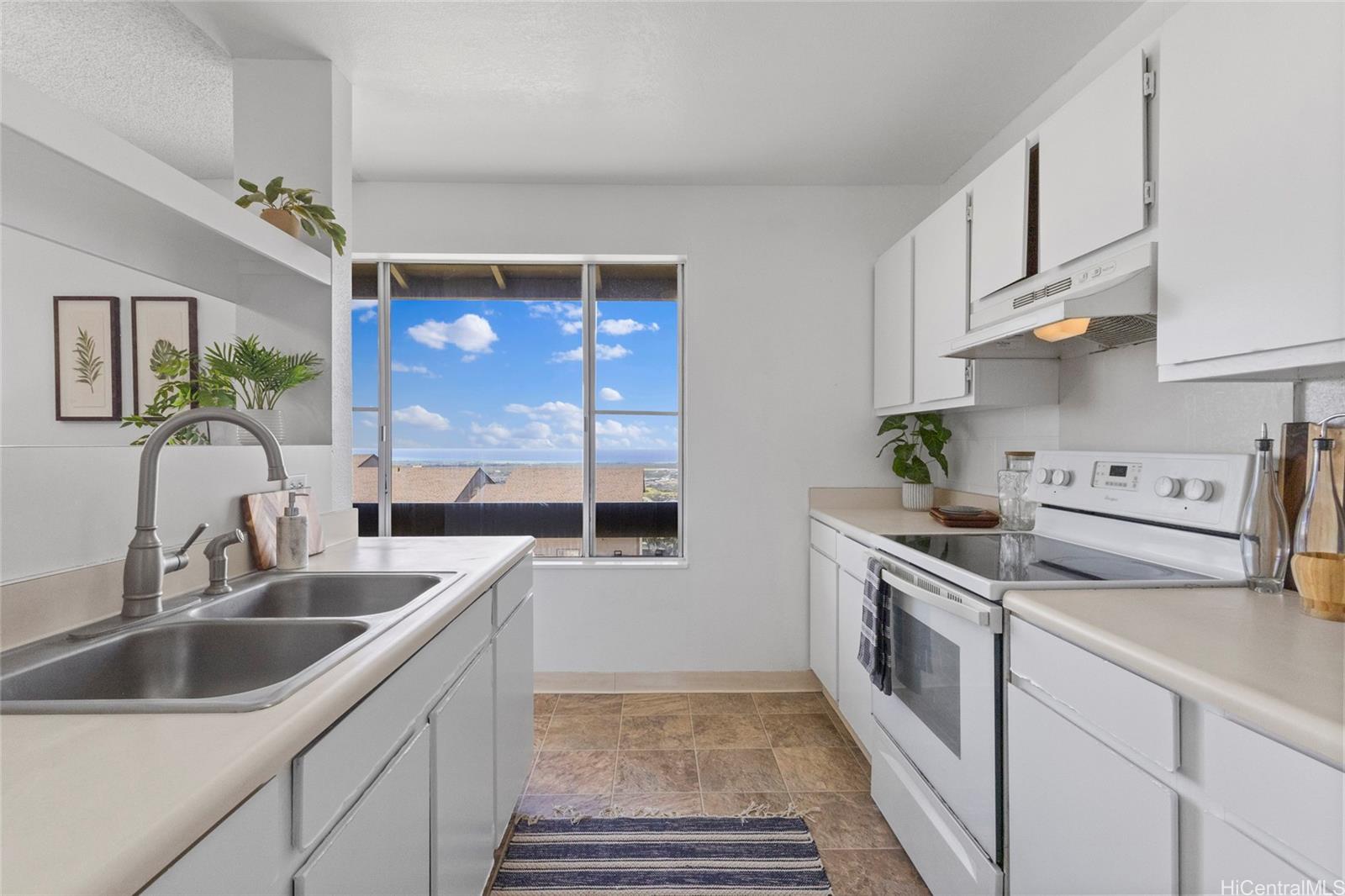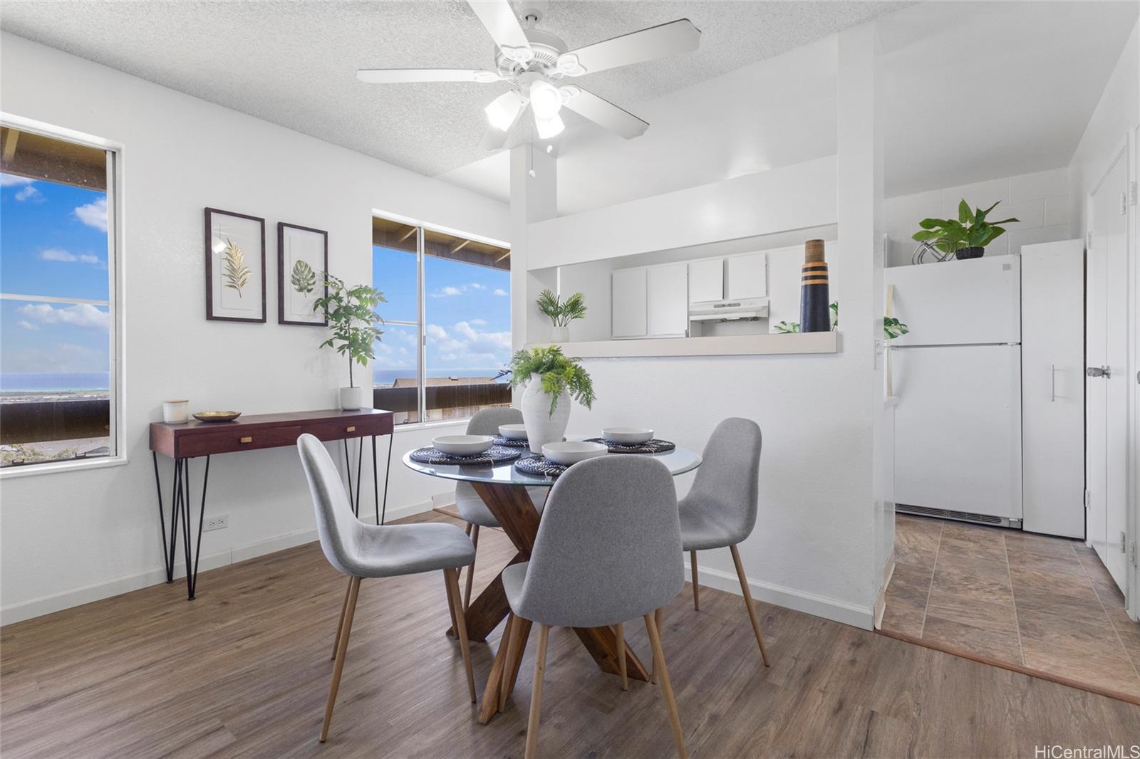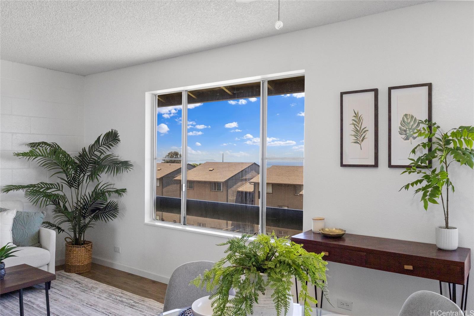 Welcome home to this move-in-ready 2-bedroom, 1-bath townhouse with 2 parking stalls in the breezy Palehua Villas community in Makakilo. This desirable end unit captures refreshing trade winds and offers beautiful Diamond Head and ocean views—creating a comfortable and inviting place to call home. Did I mention it’s pet-friendly too! Recently remodeled in 2025, the interior showcases a clean, modern design ideal for everyday living. Fresh interior paint brightens the space, while luxury vinyl plank flooring flows throughout the main living areas and bedrooms, offering both style + durability. New water heater + enjoy the added convenience of an in-unit washer + dryer. Perfect for first-time buyers or investors, this home also benefits from Makakilo’s cooler hillside climate and peaceful surroundings. Conveniently located just minutes from freeway access, shopping, dining, schools, golf courses + beaches.