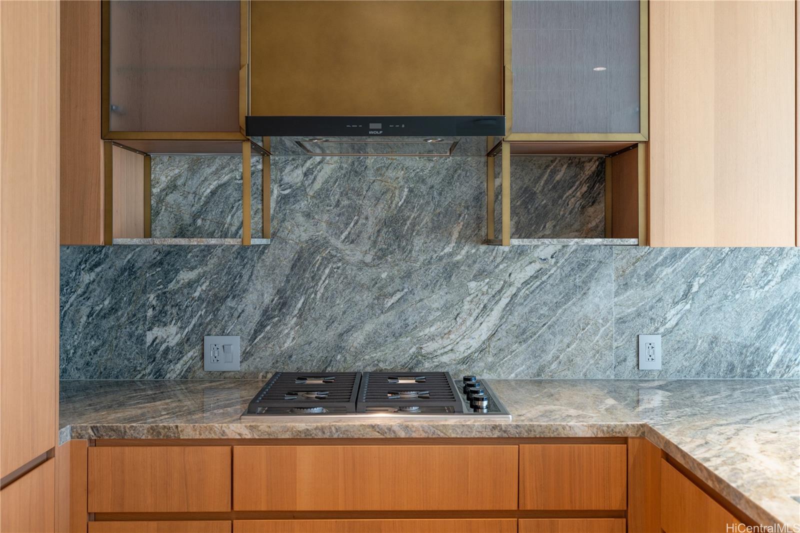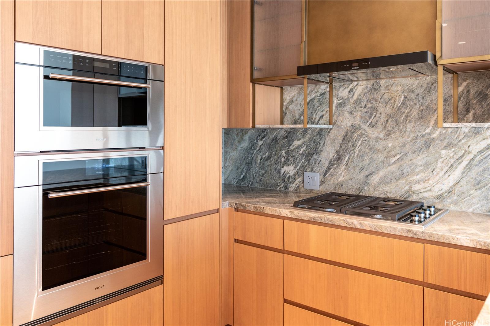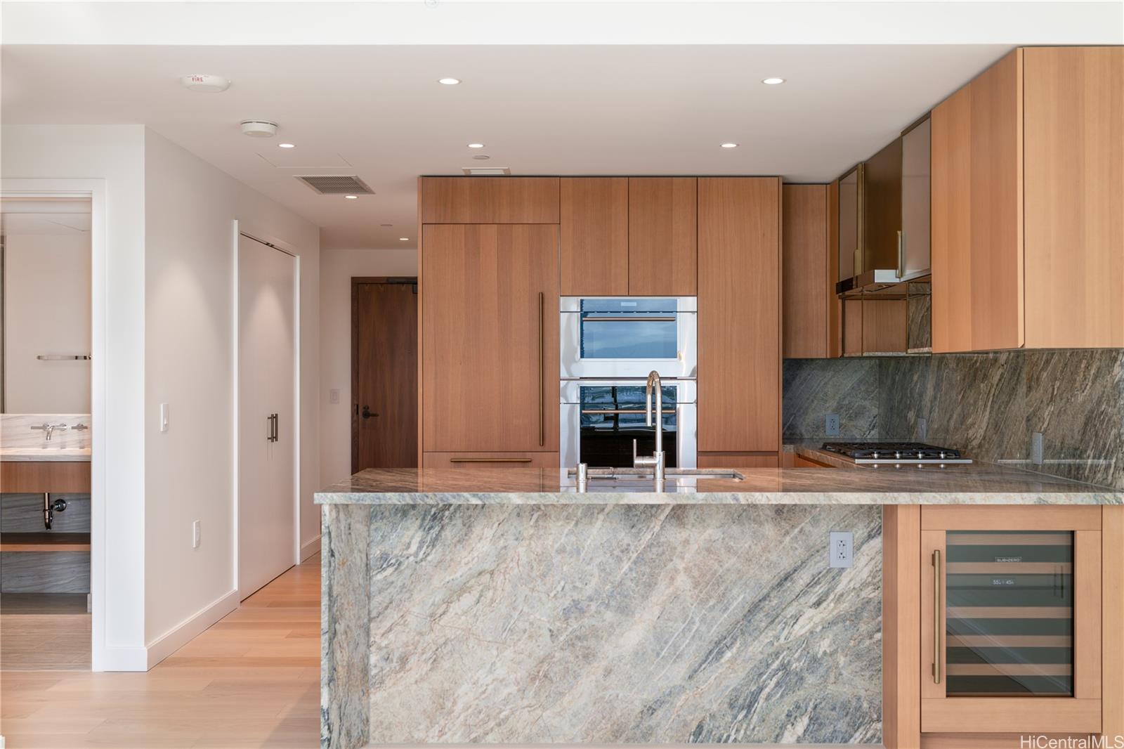 This exquisite 1-bedroom, 1-bath unit, 1 parking boasts Ocean and Kewalo Boat Harbor view and Beautiful sunset every day. The open-concept kitchen features sleek light wood cabinetry and textured glass accents, top-of-the-line Subzero appliances and a Wolf gas cooktop and oven.