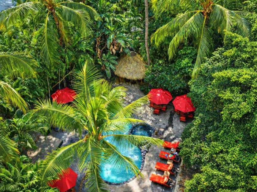 階下には、竹に囲まれたトロピカルなプール中庭が広がり、昼はリラックス、夜はロマンチックな雰囲気に。