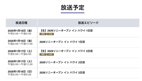 日本でソニーオープンの放映や配信は以下の通り