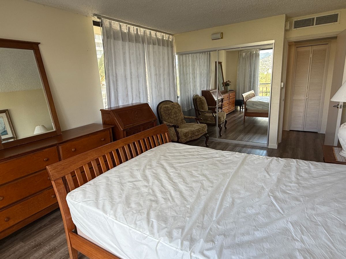 1ベッドルーム、1バス、家具付き、駐車場1台分付き(場所指定、屋根付き)但し小型車のみ(狭い急坂)