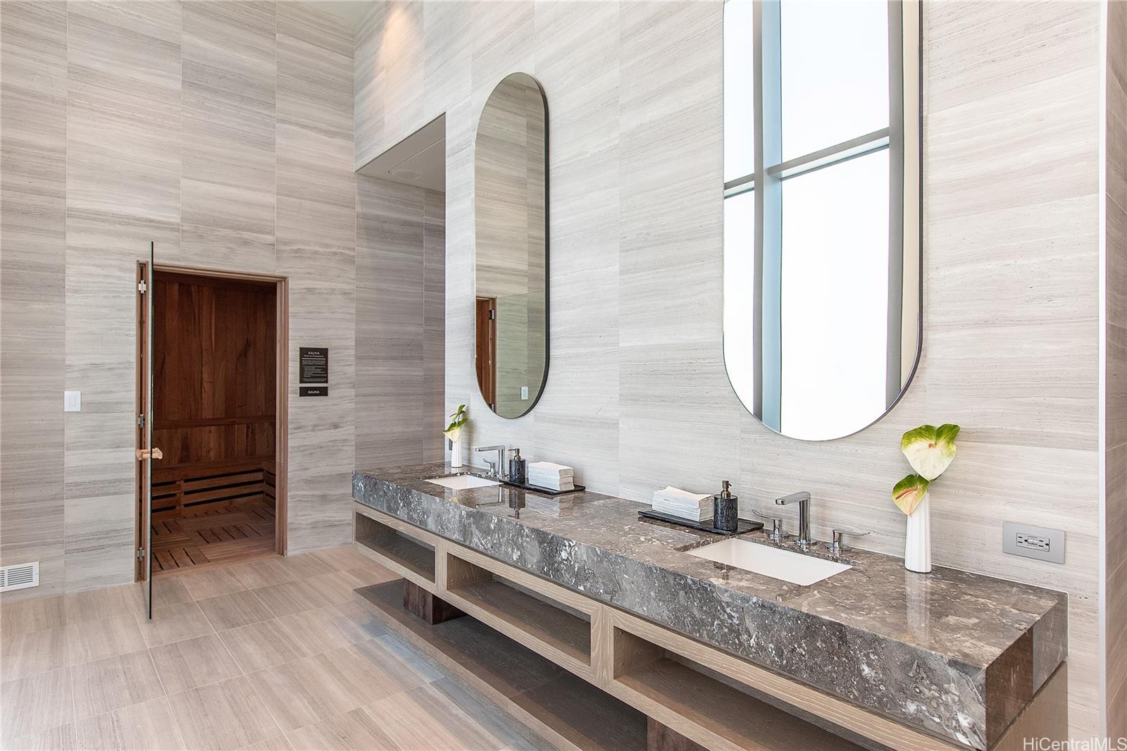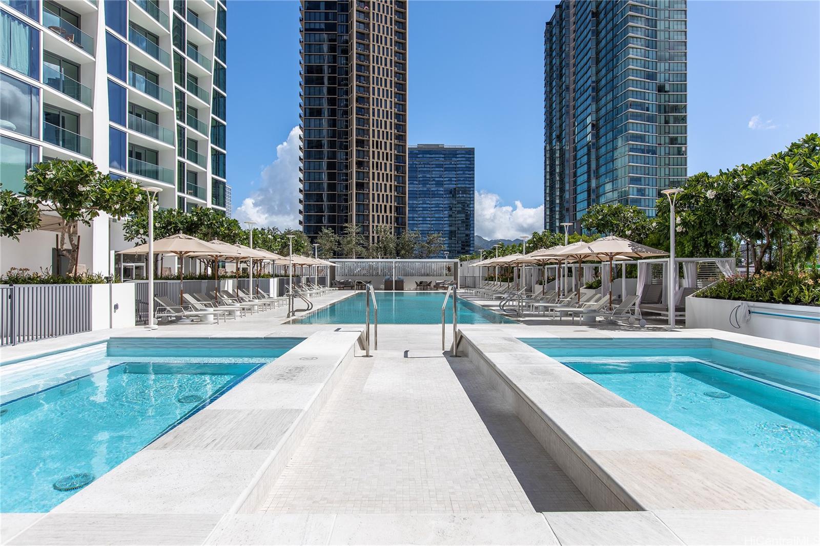 2つのラナイを備えた、大変魅力的な角部屋です。ラナイから吹き抜ける爽やかな海風をお楽しみください。角部屋に位置するこの物件は、ベッドルーム2室、バスルーム2室、そして並列駐車スペース2台分を備えています。明るく風通しの良いダイニングエリアからは、雄大な山々と街の景色を一望でき、洗練されたデザイナーキッチンには、最高級ミーレの家電製品と、一枚板の石材パネルで仕上げられたスタイリッシュなアイランドテーブルが置かれています。室内は全室ハードウッドフローリングで、水回りはGroheとKohlerの高級仕様。TOTOウォッシュで2つ目のバスルームもご利用いただけます。ワードビレッジの好立地、ビクトリアパークのKoulaに位置し、ビーチパーク、食料品店、ショッピング、レストラン、アラモアナセンターまで徒歩圏内です。インフィニティプール、バーベキューエリア、パーティールーム、スパ、フィットネスセンター、ドッグパークなど、充実したアメニティをご用意しています。この貴重な楽園を所有するチャンスをお見逃しなく!