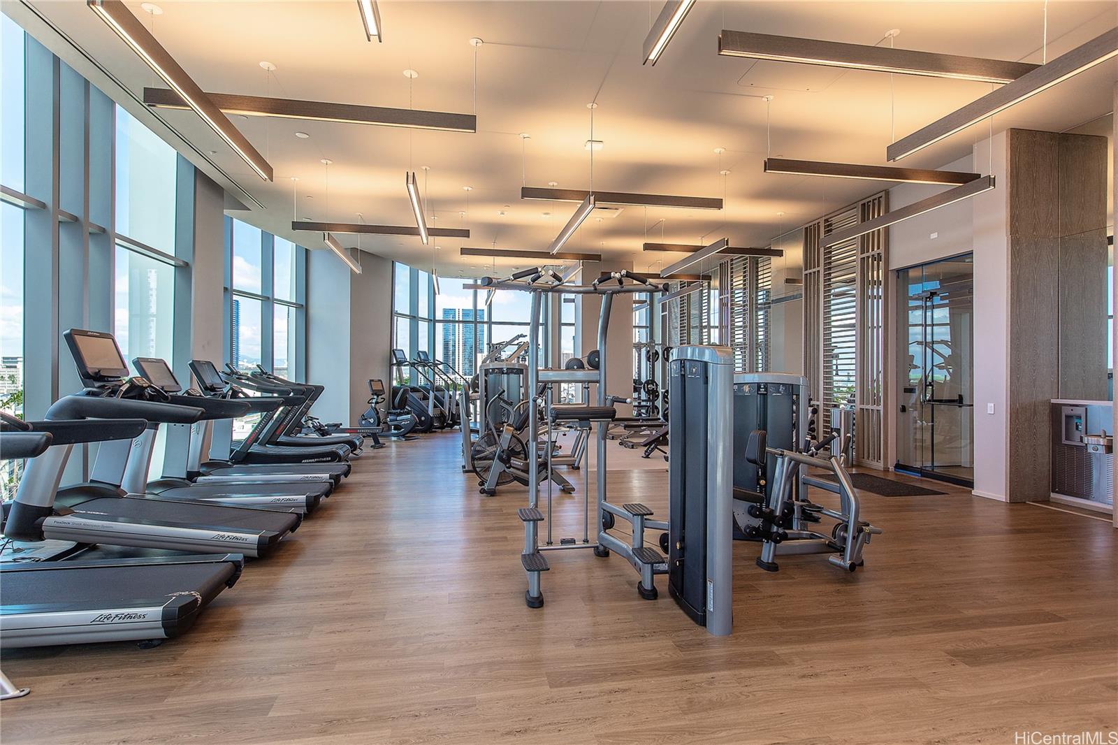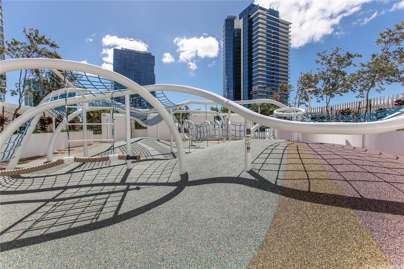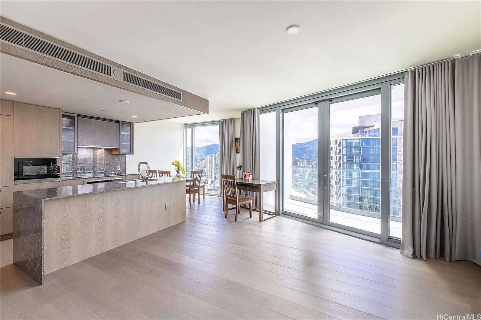 Highly desirable corner unit with two lanais! Enjoy the refreshing ocean breeze from the lanais. This corner-end unit offers 2 BD/2 BA, and 2 side by side parking spaces. The bright and breezy dining area features stunning mountain and city views, complemented by a sophisticated designer kitchen with top-of-the-line Miele appliances and a sleek island table finished with a single stone panel. The unit boasts hardwood flooring throughout and premium Grohe and Kohler plumbing fixtures. Toto Wash lets in 2nd bathroom. Located in Koula at Victoria Park, Ward Village’s prime location, it’s walking distance to the beach park, grocery stores, shopping, dining, and Ala Moana Center. Amenities include an infinity pool, BBQ areas, party rooms, spa, fitness center, dog park, and more. Don’t miss this rare opportunity to own paradise!