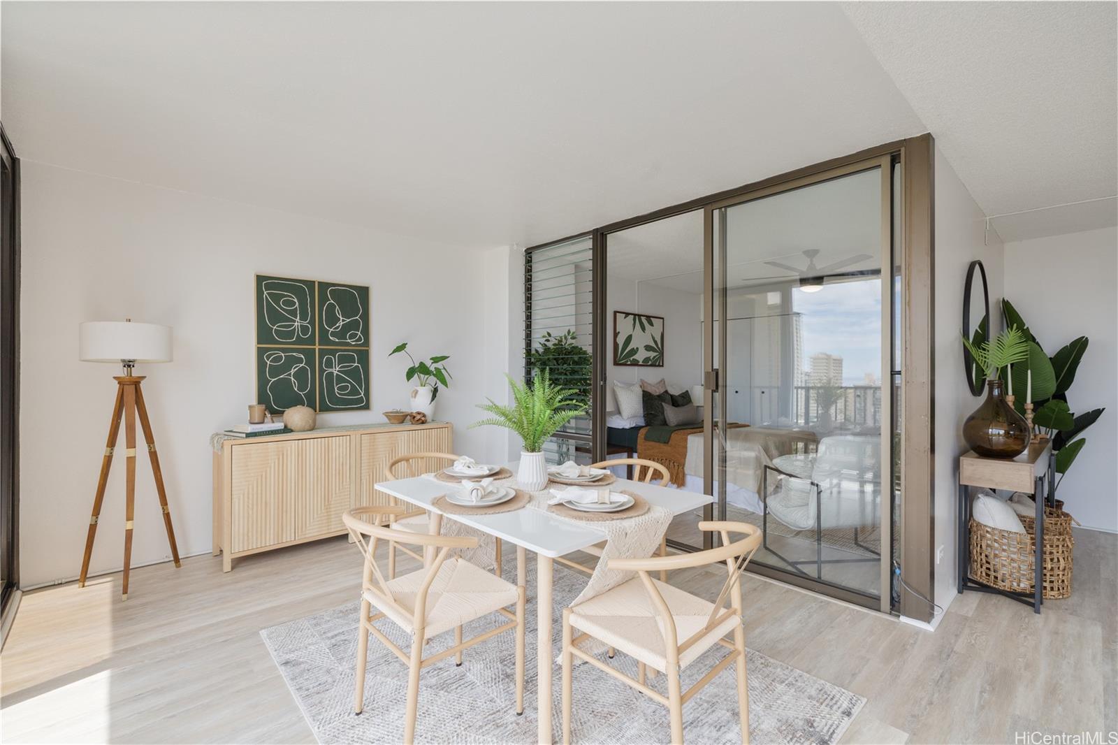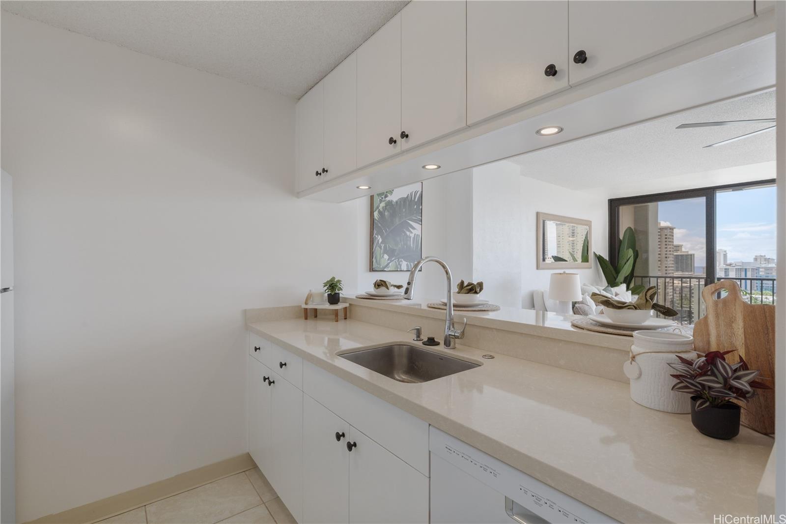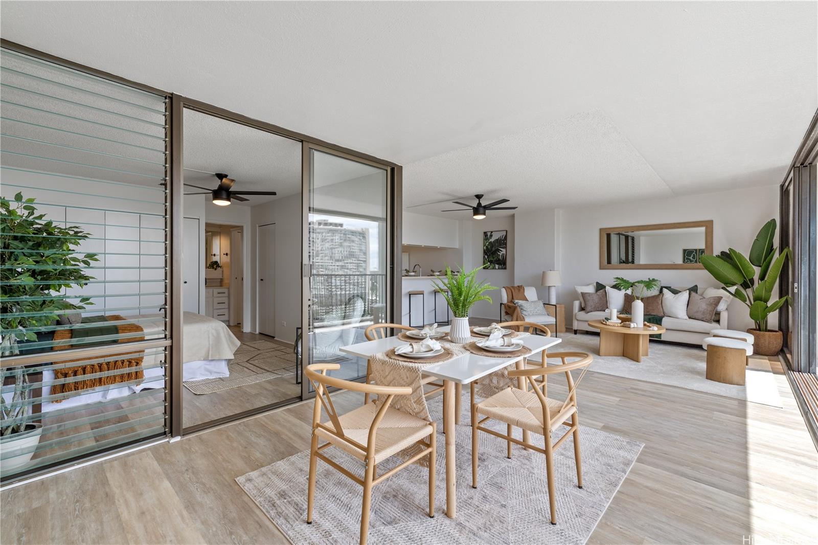 Wake up every day to the beauty of Honolulu in this captivating 1-bedroom, 1-bath home at Kaimana Lanais. With 810 sq. ft. of expanded interior space, the enclosed lanai creates an airy, open layout designed for both relaxation and entertaining. Freshly updated with luxury vinyl flooring, new light fixtures, sleek Corian countertops, and crisp paint, this residence blends modern comfort with timeless island style. Floor-to-ceiling multi-slide doors bring in dazzling views of the Waikiki’s skyline, vibrant city, ocean, Diamond Head, and spectacular sunsets—your personal postcard from paradise. The walk-in shower adds a touch of everyday luxury, while building amenities elevate your lifestyle with a pool, recreation room, surfboard racks, secure entry, and pet-friendly living. Perfectly located in Kapiolani, you’re minutes from Waikiki, Ala Wai Golf Course, UH, beaches, parks, shopping, and entertainment. Move-in ready, meticulously maintained, and waiting for you—schedule your showing today!