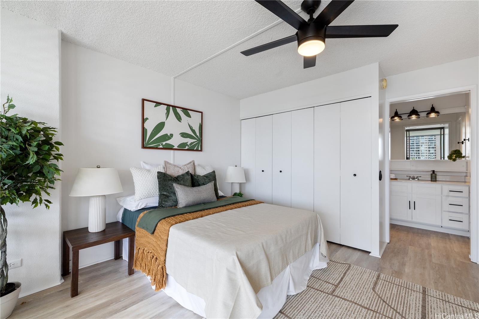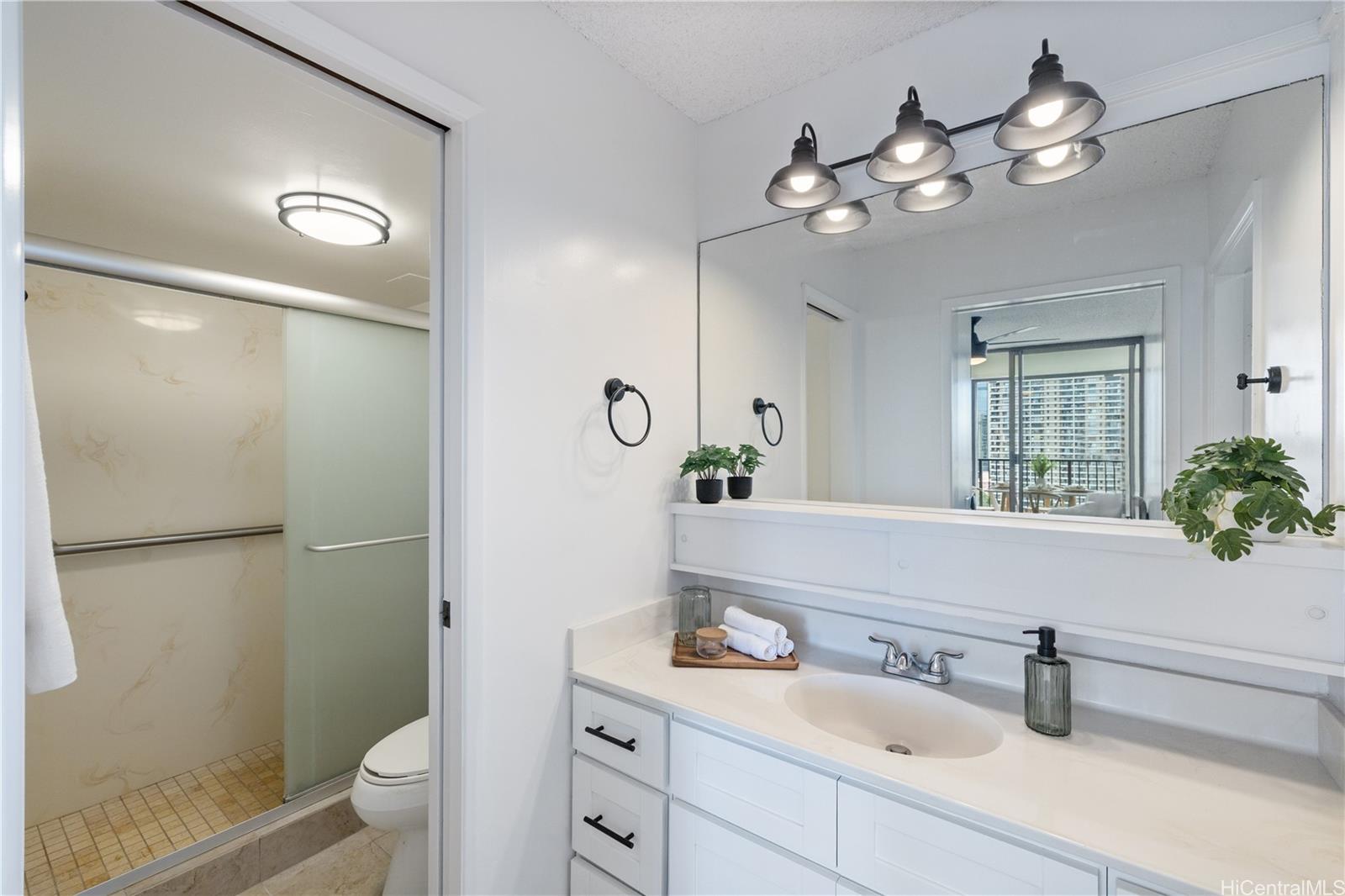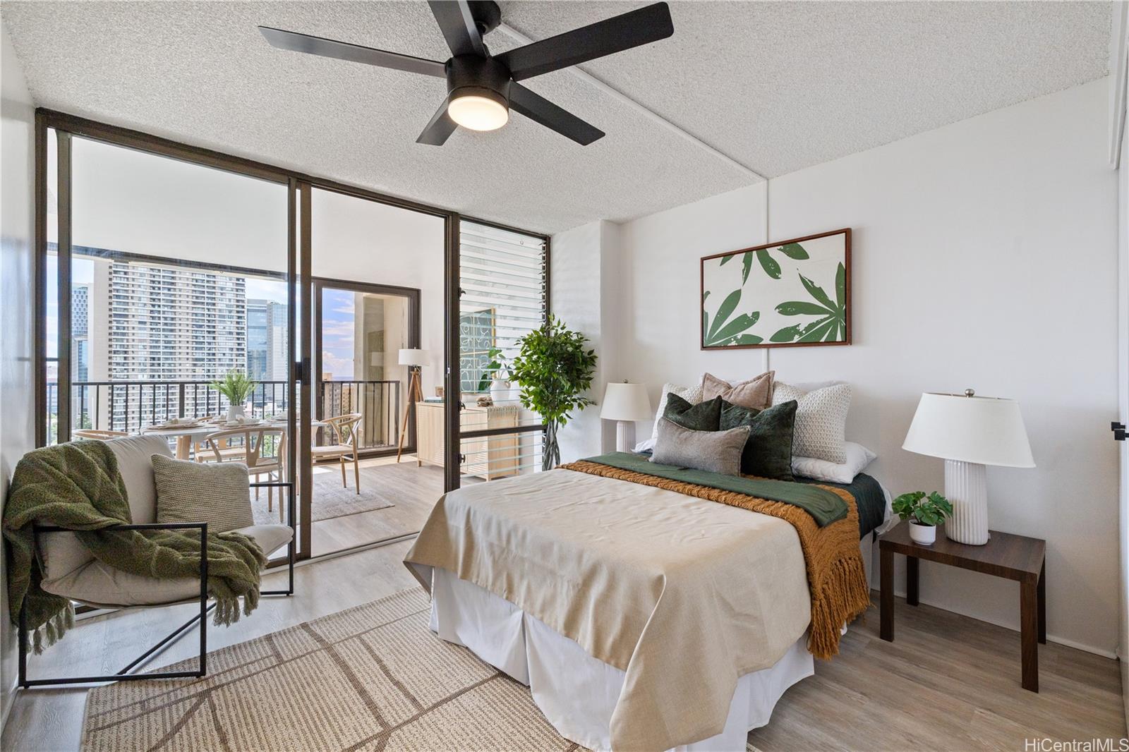 Wake up every day to the beauty of Honolulu in this captivating 1-bedroom, 1-bath home at Kaimana Lanais. With 810 sq. ft. of expanded interior space, the enclosed lanai creates an airy, open layout designed for both relaxation and entertaining. Freshly updated with luxury vinyl flooring, new light fixtures, sleek Corian countertops, and crisp paint, this residence blends modern comfort with timeless island style. Floor-to-ceiling multi-slide doors bring in dazzling views of the Waikiki’s skyline, vibrant city, ocean, Diamond Head, and spectacular sunsets—your personal postcard from paradise. The walk-in shower adds a touch of everyday luxury, while building amenities elevate your lifestyle with a pool, recreation room, surfboard racks, secure entry, and pet-friendly living. Perfectly located in Kapiolani, you’re minutes from Waikiki, Ala Wai Golf Course, UH, beaches, parks, shopping, and entertainment. Move-in ready, meticulously maintained, and waiting for you—schedule your showing today!