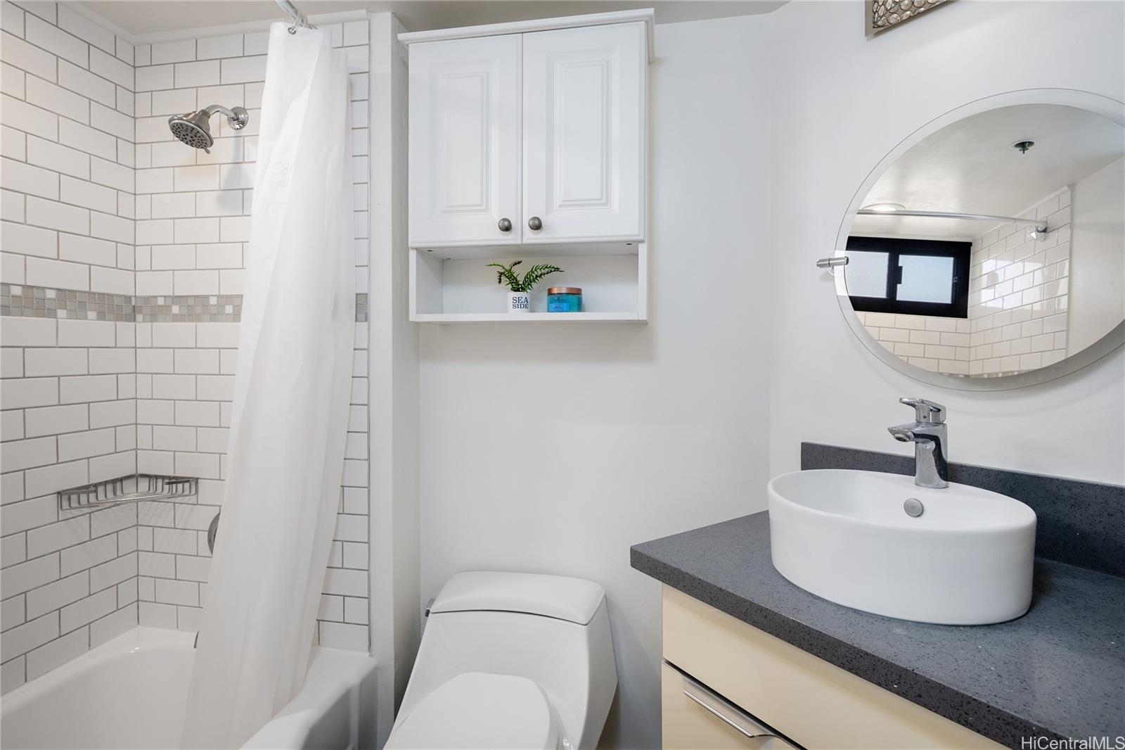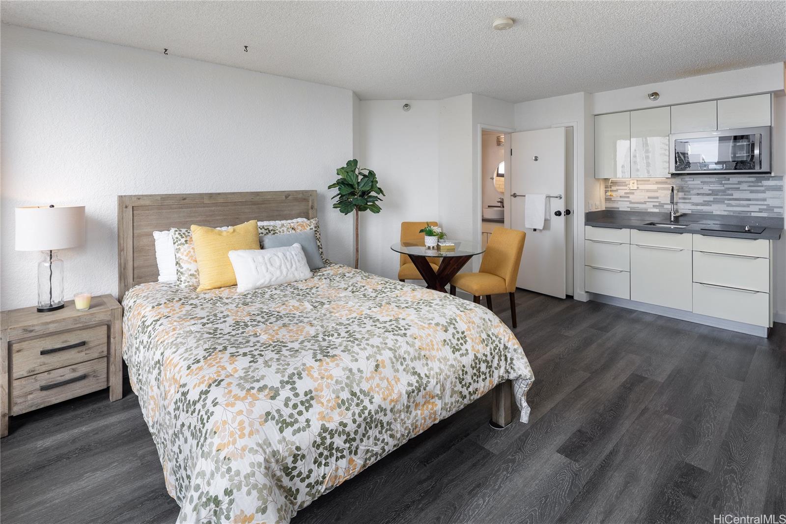 Stunning high-floor studio in the Queen Tower of Liliuokalani Gardens with ocean and Waikiki views. Nestled within award-winning tropical gardens spanning over two acres, the resort-style community offers a koi pond, pool, spa, pavilion, BBQ areas, rooftop lighted tennis and pickleball courts, and 24-hour security. Enjoy central AC, secured bike and surfboard storage, and convenient