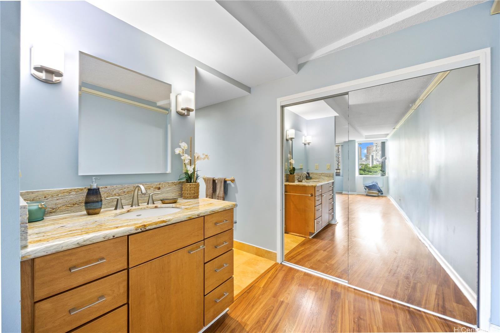 Excellent location on park setting with tropical grounds, close to famous Waikiki beaches, Ala Moana Shopping Center, restaurants and the University of Hawaii. The well maintained Marco Polo offers resort-like amenities which include a wonderful swimming pool, sauna, tennis, basketball/pickleball courts, BBQ, golf driving nets, a convenience store in the lobby, car wash area, ample guest parking, storage, 24 hour security,100% Hurricane Coverage with reasonable monthly maintenance fees. The sprinkler/fire PA alarm system has been completed throughout building. The bathroom plumbing project was recently completed. Photos have been enhanced.