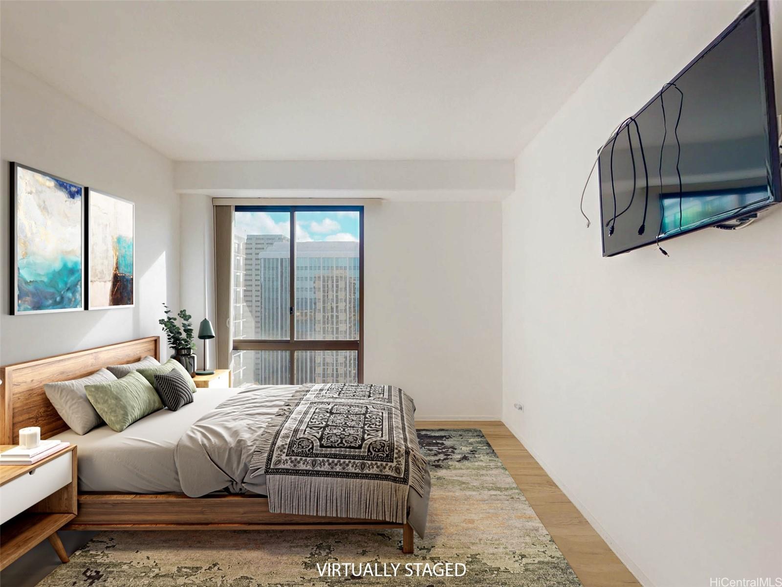 ALL UTILITIES INCLUDED. This 2-bedroom, 2-bath corner residence at Harbor Square offers ocean and mountain views in the heart of Downtown Honolulu. Recent updates include stainless steel kitchen appliances, central A/C with Smart Thermostat, a new in-unit washer and dryer, primary bath renovation and updated luxury vinyl plank flooring. The functional layout provides comfortable living for socializing or a quiet retreat. It comes with a covered end parking stall and 24/7 security. Maintenance fees INCLUDES electricity, water, sewer, cable, and internet. Enjoy spending time on the recently updated pool deck with ocean views, use of the convenient surfboard and paddle board storage, and a warm-welcoming secured lobby area. Conveniently located within walking distance of the waterfront, Iolani Palace, Aloha Tower, Kaka'ako, and a variety of dining and retail options. Ala Moana Beach Park is approximately one mile away. For qualified VA buyers, a VA assumable loan at 2.25% may be available, subject to lender approval and eligibility requirements.