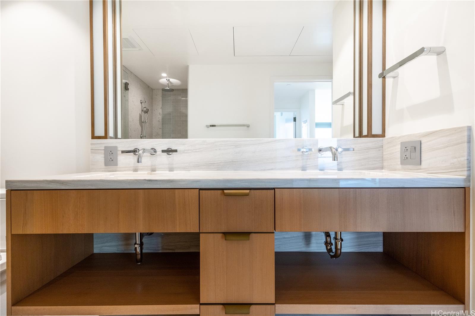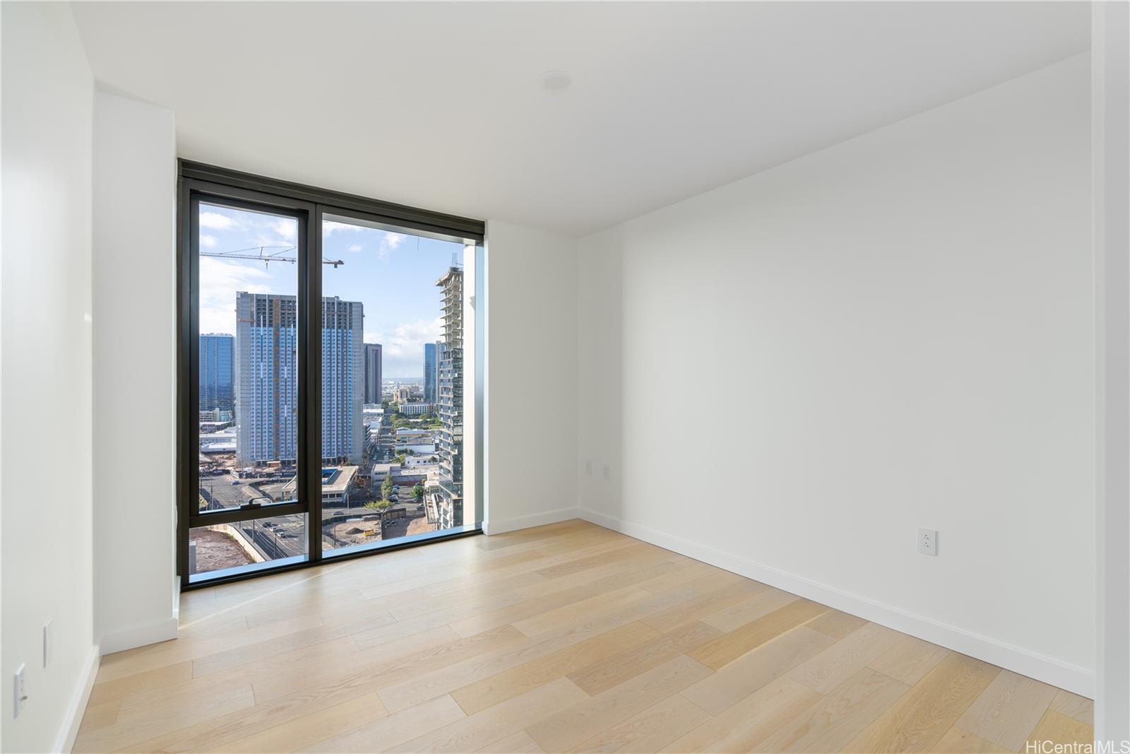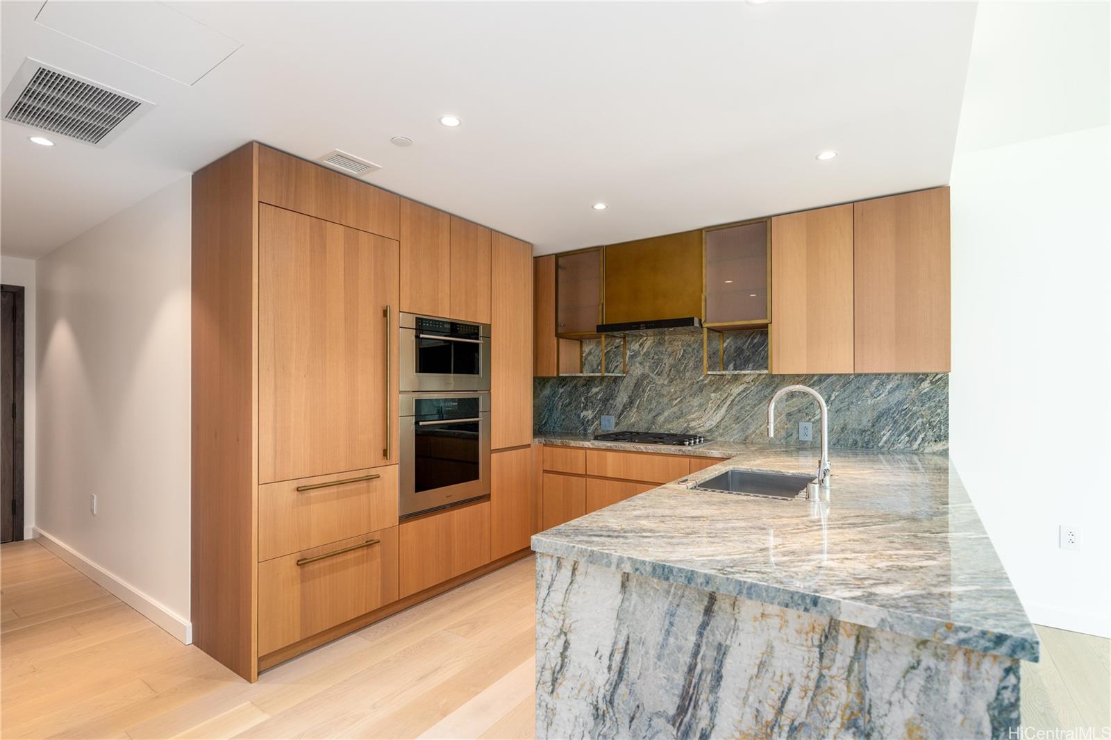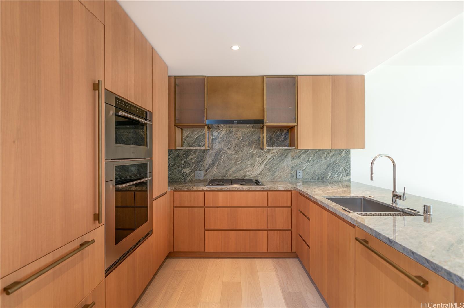 This exquisite 1-bedroom, 1-bath unit, 1 parking boasts Ocean and Kewalo Boat Harbor view and Beautiful sunset every day. The open-concept kitchen features sleek light wood cabinetry and textured glass accents, top-of-the-line Subzero appliances and a Wolf gas cooktop and oven.