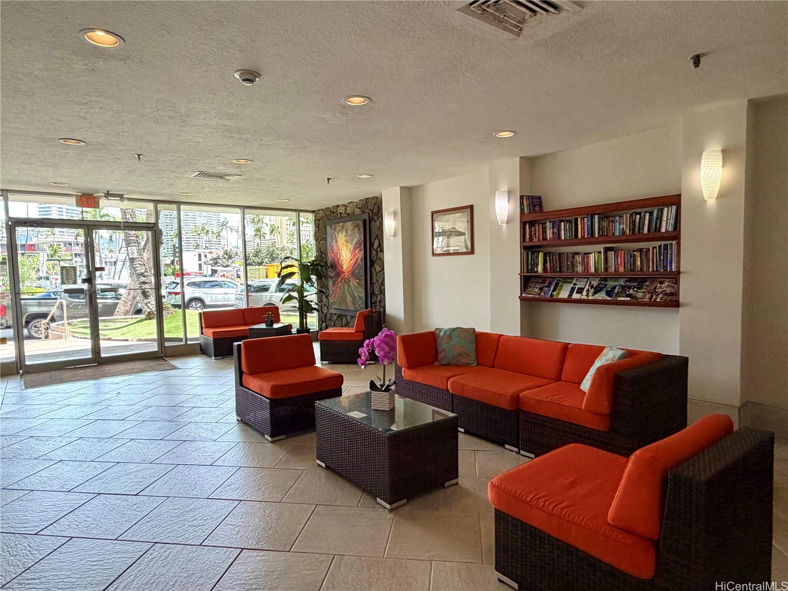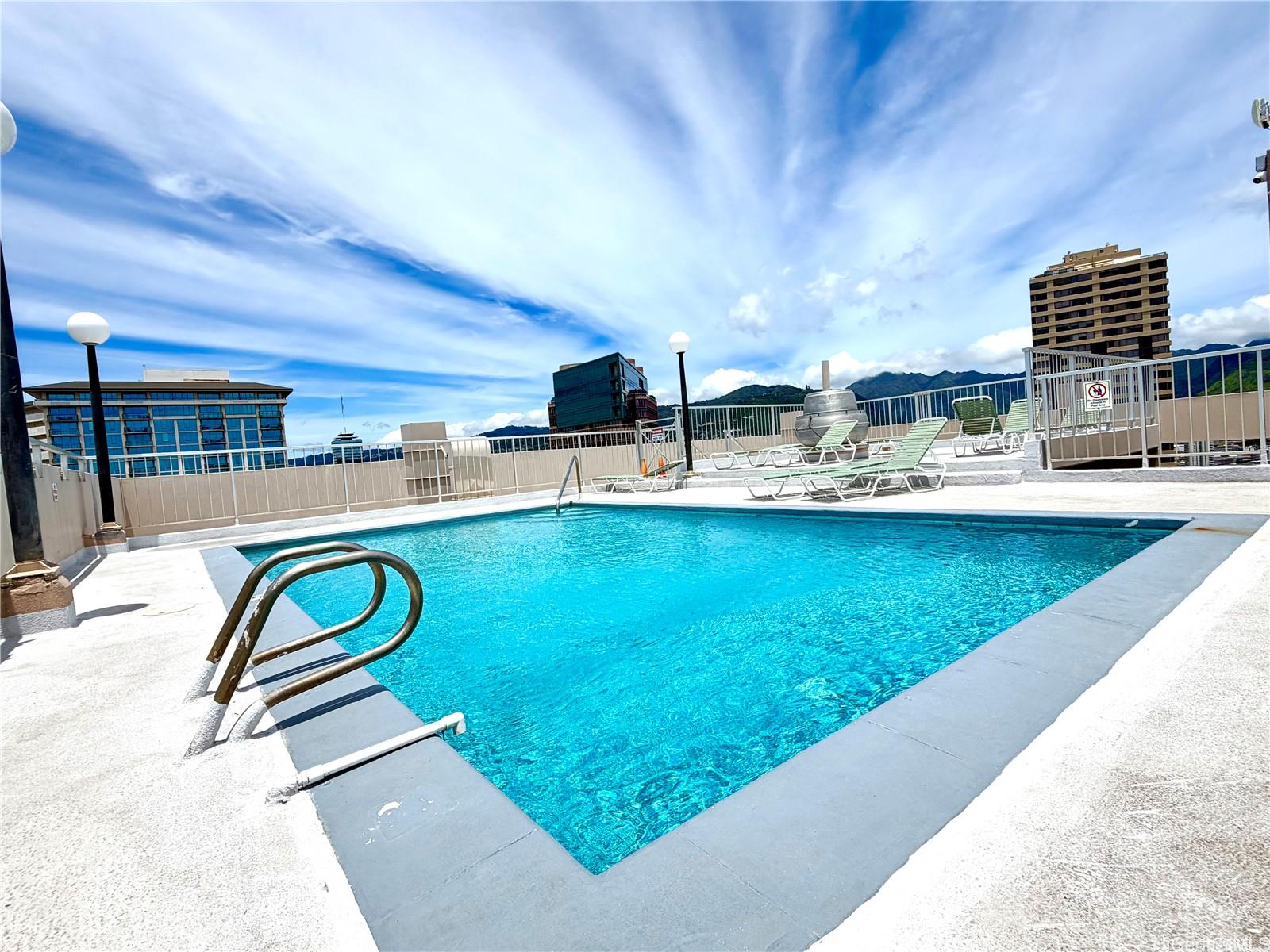 The Pavilion is a boutique building with only seven units per floor, offering a more private residential experience in Waikiki. Amenities include a rooftop pool with ocean and sunset views, BBQ area, sauna, guest parking, and storage for surfboards and bicycles.