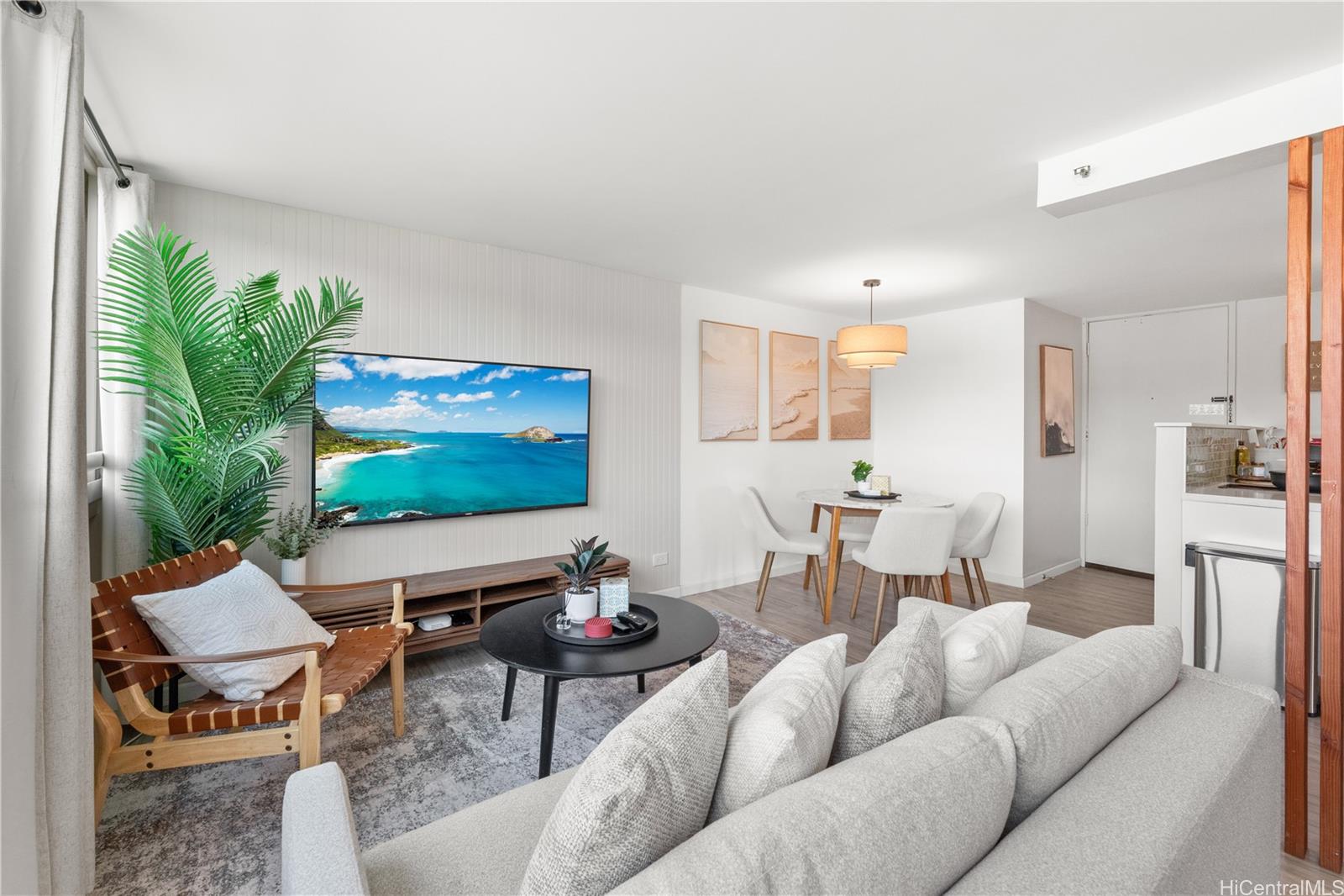 Take in sweeping mountain views from the living space, while the private lanai captures tranquil Ala Wai Canal scenery with a touch of ocean on the horizon—perfect for relaxing or entertaining.
