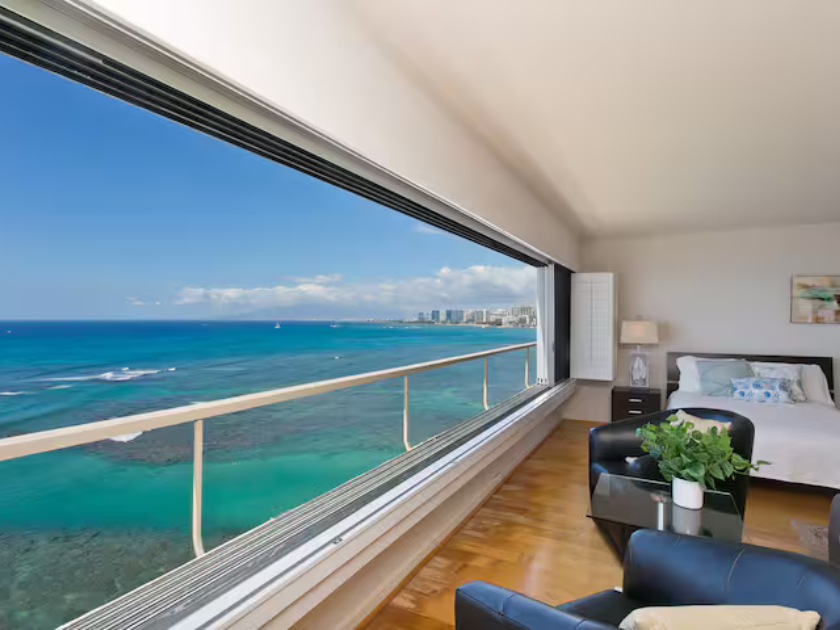 大きな窓から差し込むやわらかな自然光、目の前に広がる真っ青な海とダイヤモンドヘッド。