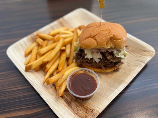 ”ブリスケット” とは、牛肩バラ肉のことで、テキサスで人気の、BBQ定番メニューの1つ。そのブリスケットを使ったサンドイッチやチーズメルト、ロコモコ、マックボウルなどを提供している。