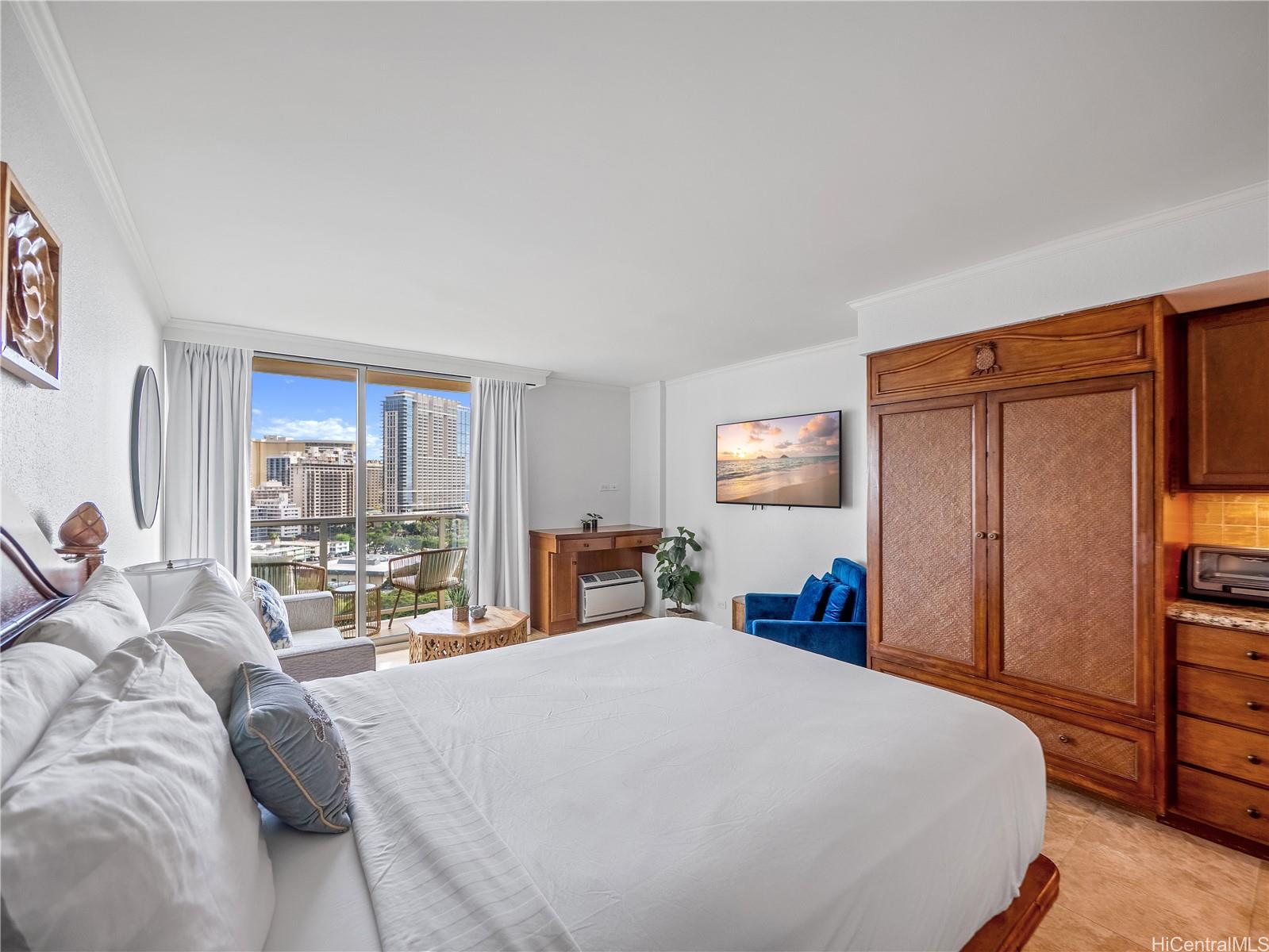 This furnished studio offers a smart layout with a queen bed and sofa sleeper, plus a convenient kitchenette equipped with a cooktop, mini refrigerator, and microwave; ideal for light meals and extended stays. Enjoy hotel-style amenities including a swimming pool, BBQ area, and fitness center/gym, all in a prime Waikiki location near beaches, dining, and shopping. A newly announced luau experience nearby is anticipated to enhance the area’s resort-style appeal. Rare opportunity to own a standout Luana Waikiki ocean-view studio with Fort DeRussy Park views and a lanai.