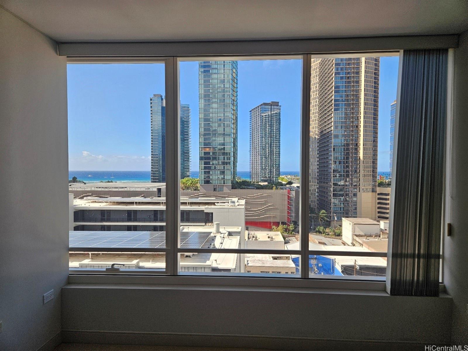 1 bedroom, 1 bath, den and 1 parking unit with city, ocean and sunset views in Pacifica Honolulu in Kakaako. Great location on the bus line, walk to Whole Foods, Ala Moana Center, Blaisdell and many shops and restaurants in the Ward/Kakaako neighborhood. Chai's and Doraku Sushi restaurants are located in the building. Building is pet friendly with a Plaza Park where you can bring your pet. Pet restrictions apply, see House Rules. Numerous amenities including a heated pool and hot tub, BBQ areas, 2 theaters, sauna, party pavilion, secured parking and entry.
