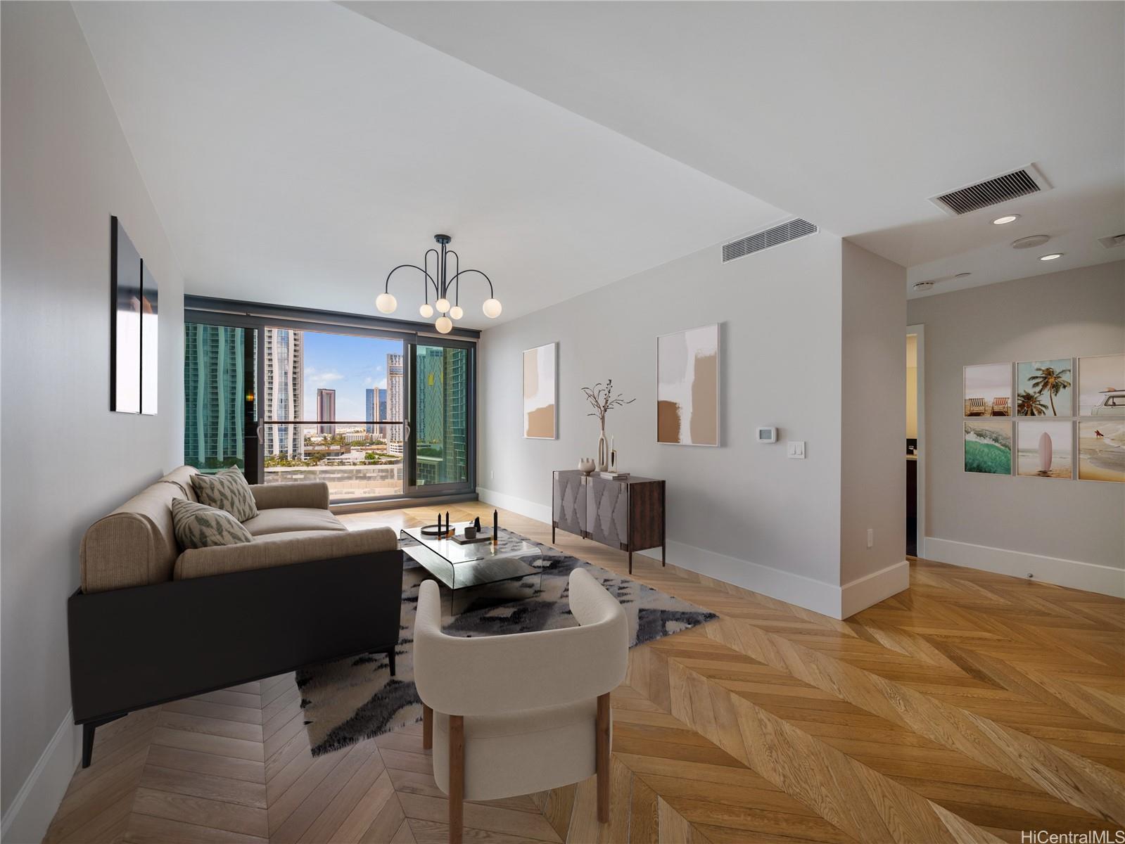Experience elevated island living at Anaha in the heart of Ward Village. This beautifully designed 1-bedroom, 1-bath residence at 1108 Auahi St #1305 offers approximately 726 sq ft of interior living space with floor-to-ceiling windows showcasing stunning city, coastline, and ocean views. The open-concept layout features 9-foot ceilings, central AC, and modern finishes throughout. The sleek gourmet kitchen includes premium appliances, custom cabinetry, and elegant countertops, perfect for everyday living and entertaining. The spacious bedroom offers generous closet space, while the spa-inspired bathroom provides a relaxing retreat.