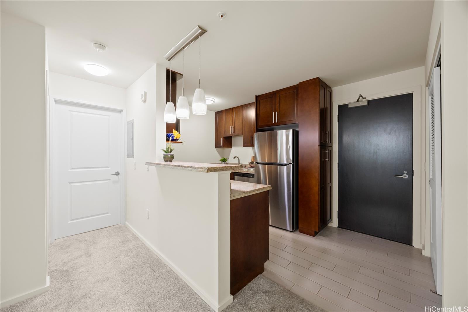 ワイキキの新しいコンドミニアムビルにある、美しく手入れされた1ベッドルーム、1バスルームの住居です。屋根付きの専用駐車場が1台分付いています。室内は壁や天井を含め、最近全面塗装され、フルサイズの洗濯機と乾燥機、GE製のステンレス製家電、窓用エアコン、リビングルームとベッドルームにはシーリングファンが備え付けられており、快適性と効率性を兼ね備えています。居住者は、スイミングプール、バーベキュー設備、屋外ダイニングエリア、常駐管理人、ゲスト用駐車場、自転車とサーフボードの保管場所など、充実したアメニティをご利用いただけます。月々の管理費もリーズナブルで、この物件は住宅所有者にも投資家にも最適です。アラモアナ大通りからわずか1ブロックの場所に位置し、日常の利便性と交通量の多い道路から離れた静かな環境を両立しています。美しく整備された敷地に囲まれ、心地よく温かい雰囲気を醸し出しています。アラモアナセンター、世界的に有名なビーチ、そして数多くのレストランやショップまで徒歩圏内という理想的なロケーションです。