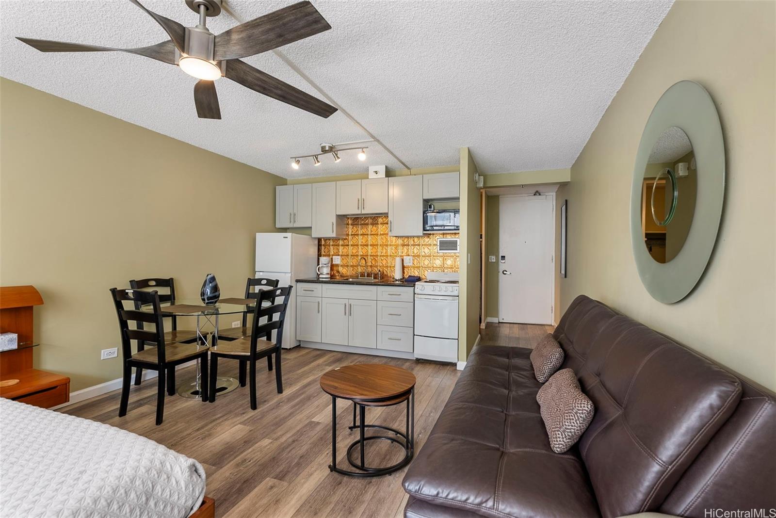 合法的な短期賃貸物件としては驚くほどお手頃な価格です。すぐにでも入居できる絶好の機会で、ワイキキの中心部に位置しています。この物件は、世界クラスのロケーションで休暇の雰囲気を満喫したい方に最適です。有名なワイキキビーチ、多様なショッピング体験、そしてあらゆるアメニティがすぐ手の届くところにあります。このアップグレードされた洗練されたモダンなスタジオユニットは、居心地が良く、使い勝手の良いレイアウトです。キッチンは最近改装され、新しいキャビネットとカウンタートップ、そしてエレガントな雰囲気を添えるゴールドの模様のバックスプラッシュが特徴です。ゆったりとしたサイズのラナイでリラックスして周囲の景色をお楽しみください。このユニットには、セキュリティ付きの専用駐車場、各階に共用ランドリー、そして建物内のプールが備わっています。