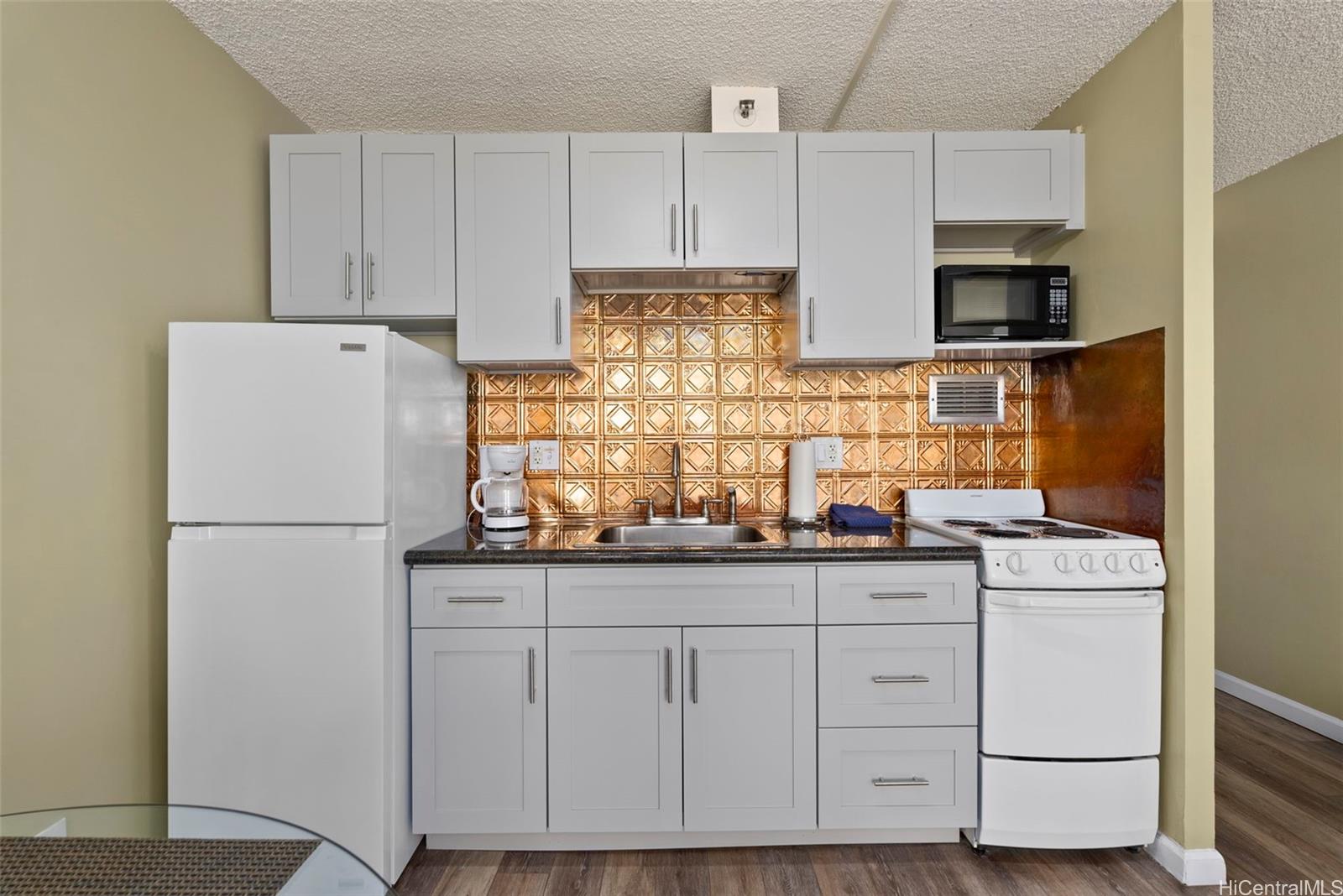 Amazing price for this legal short-term rental. A turn-key opportunity, ideally located right in the heart of Waikiki. This property is a gem for those looking to soak in the ambiance of a vacation stay at a world-class location, with renowned Waikiki Beach, diverse shopping experiences, and an array of amenities all within easy reach. This upgraded sleek and modern studio unit has both a cozy and versatile layout. The kitchen is a standout with its recent enhancements, featuring new cabinets and countertops along with the kitchen’s gold-patterned backsplash that injects a dose of elegance. Relax and take in the sights around you on the comfortably sized lanai. The unit comes with a secured, assigned parking stall, community laundry on each floor, and a building pool.