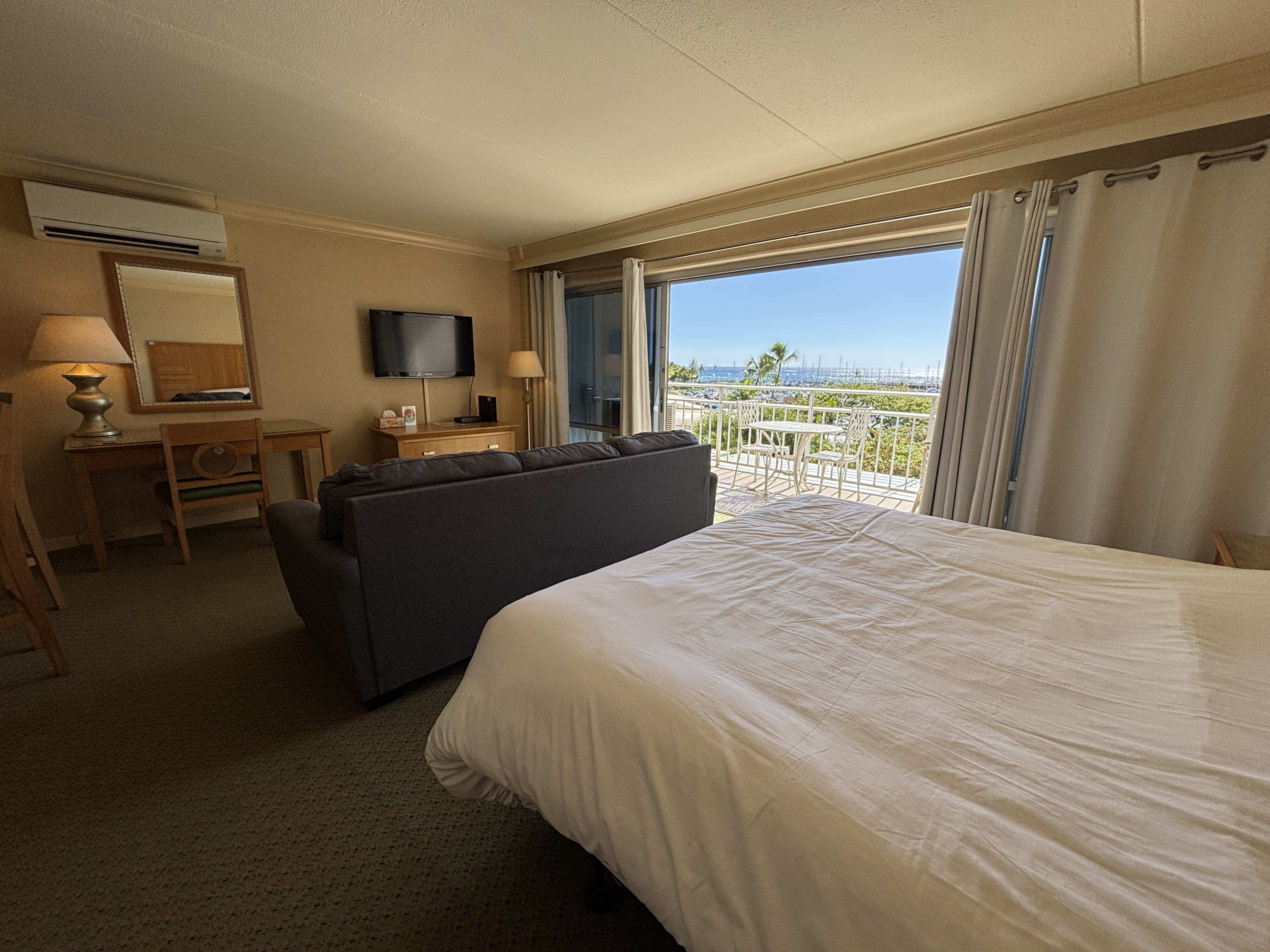 広々としたスタジオタイプ。素晴らしいオーシャン&ハーバービュー。ベッドルーム1室、バスルーム1室、広々としたラナイ付き。
