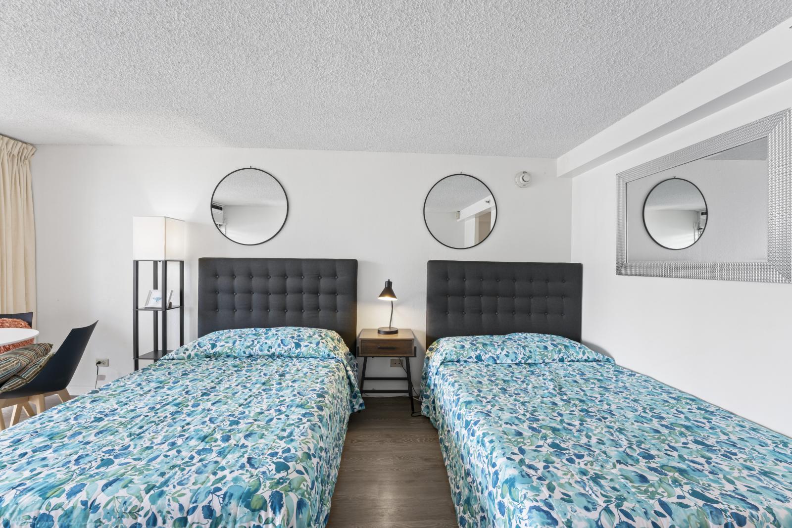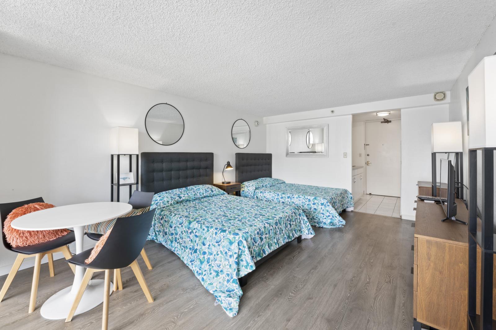 アイランドコロニーの家具付きスタジオ/バスルーム1室。ラミネート床、タイル床、家具付き。設備:プール、BBQエリア、洗濯施設、フィットネスセンター(フィットネスセンター利用は別途料金)。24時間警備付きセキュリティビル。駐車場は含まれませんが、プロパーク経由で利用可能。家賃にケーブルテレビ、インターネット、水道代が含まれます。電気代およびその他光熱費は入居者負担。禁煙・ペット不可。申込手数料と信用調査が必要です。