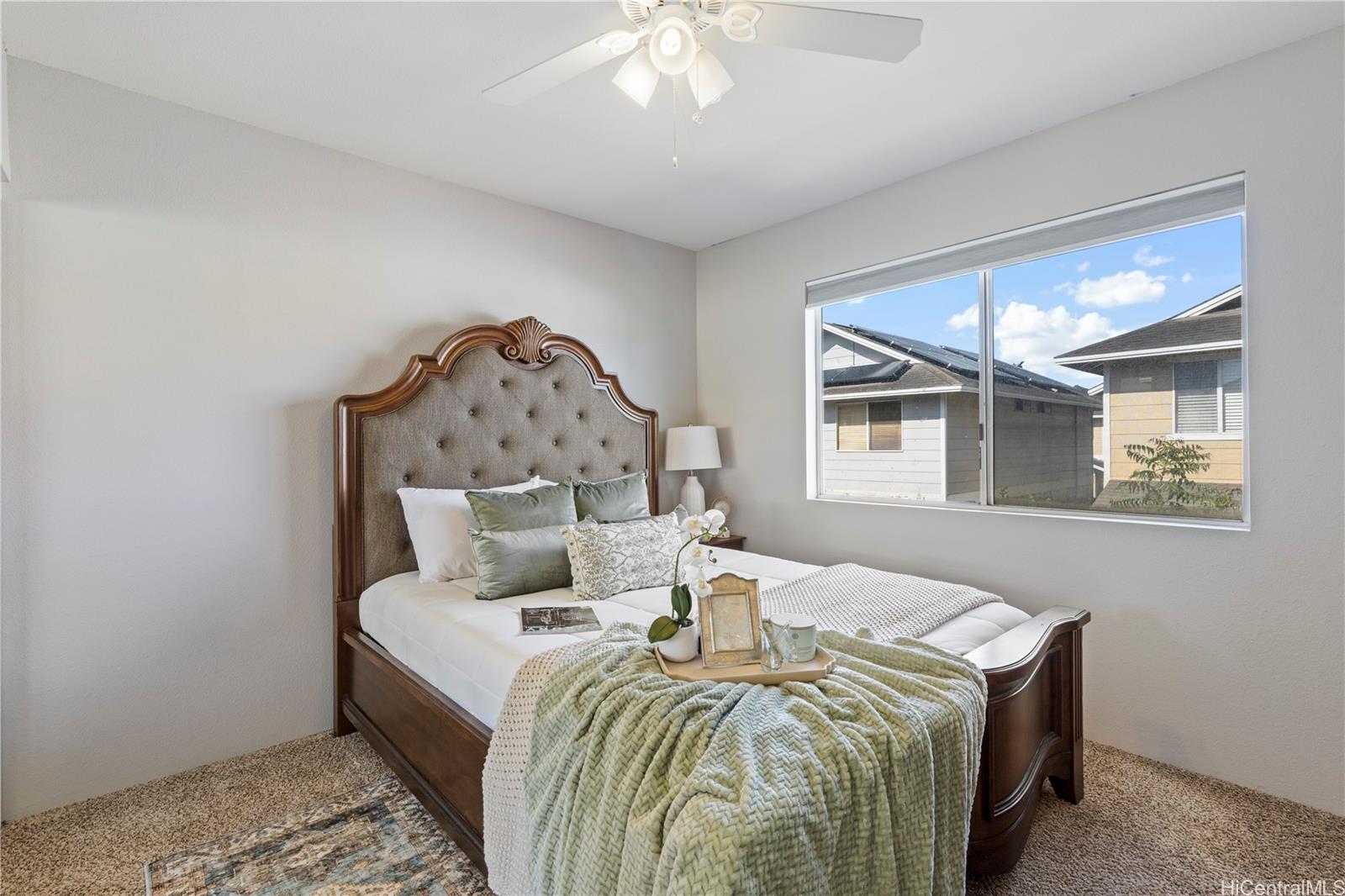 Centrally located in the heart of Ewa Beach sites this 3 bedroom 2.5 bath Terraza home with a patio made for entertaining. Enjoy the owned (financed) solar panels that take the "heat" off the energy costs when using the central air! Spacious primary room, with 2-car garage with a new garage door opener and a driveway that will accommodate 2 additional vehicles. Renovated Kitchen and brand-new dryer.