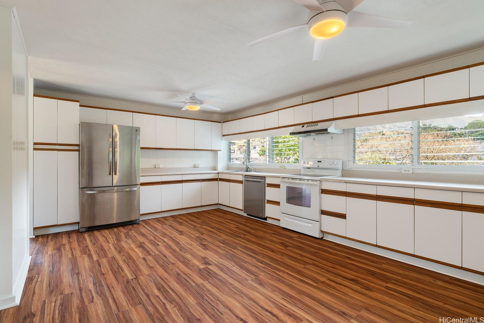 Nuuanu Valley kama'aina home owned by the same family since it was built in 1968. Quiet and cool location near the mountain with relaxing views. Three bedrooms and two bathrooms upstairs plus the large kitchen! Freshly painted inside and out, new vinyl plank flooring upstairs. Another bedroom and bathroom downstairs. Two car garage plus driveway space.