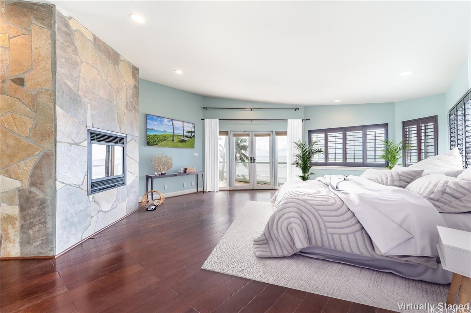 Hidden Beachfront Gem located at end of a cul-de-sac, enter through beautiful brass shared security gate, long driveway into a secluded, tropical landscaped, oasis. Partial wrap around deck, on the lower level, leads to gated pool and space to entertain. Double glass etched entry doors, open floor plan surrounded by windows, allowing natural light in, sliding doors leading to the exterior bring the outside in. Center of living space, is a double sided fireplace adjacent to the large gourmet kitchen with granite counters, deep wooden cabinetry, canned lighting and open feeling! Bedroom and full bath on ground floor, wooden stairwell leading to another open family area with 2 w/ en suites and laundry room, then stairs to the Prime Bed/Bath retreat with separate balcony, walk in closet and fireplace. Throughout the home are both ceiling fans and split ac systems to help maintain temperature control. 44-Owned PV solar panels and solar water heater help with energy costs. A 1,284 sq foot garage for parking with 2 storage areas has endless possibilities and the open driveway leading to the garage can accommodate guest parking!