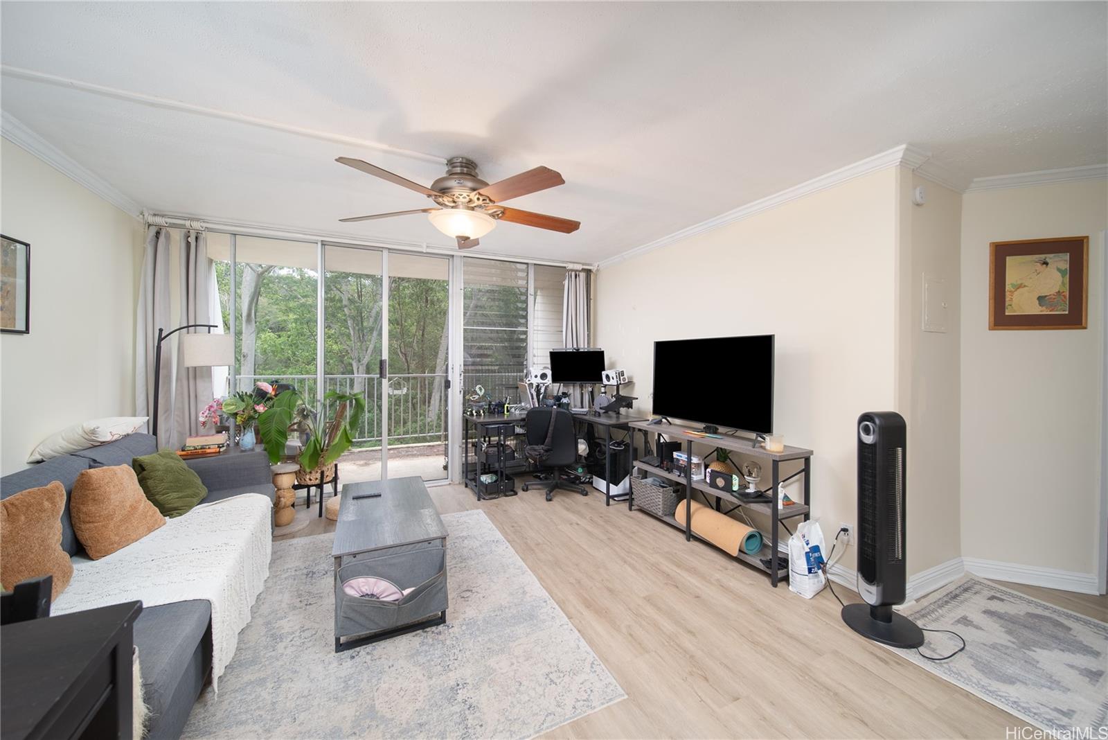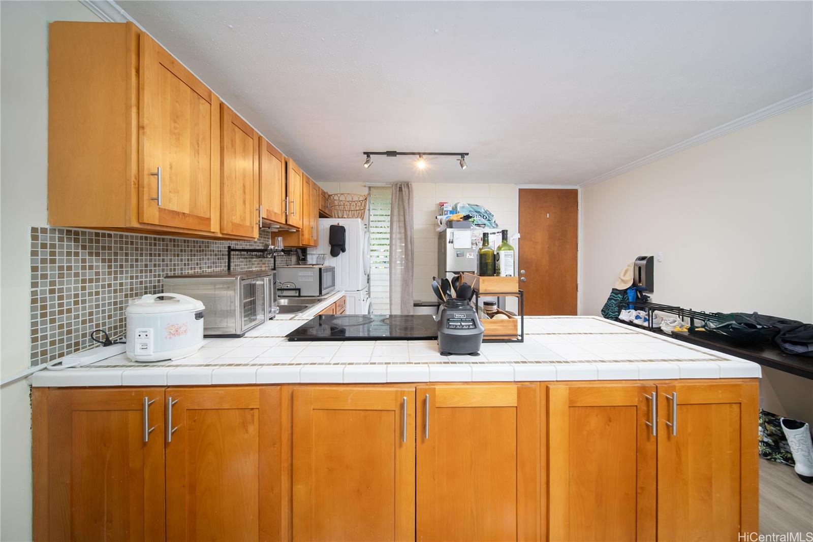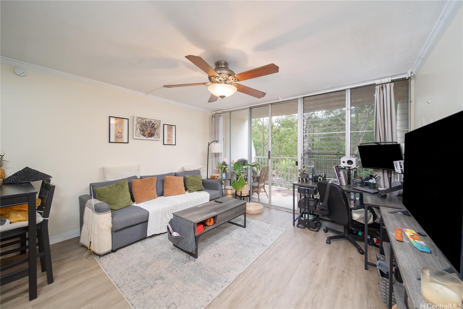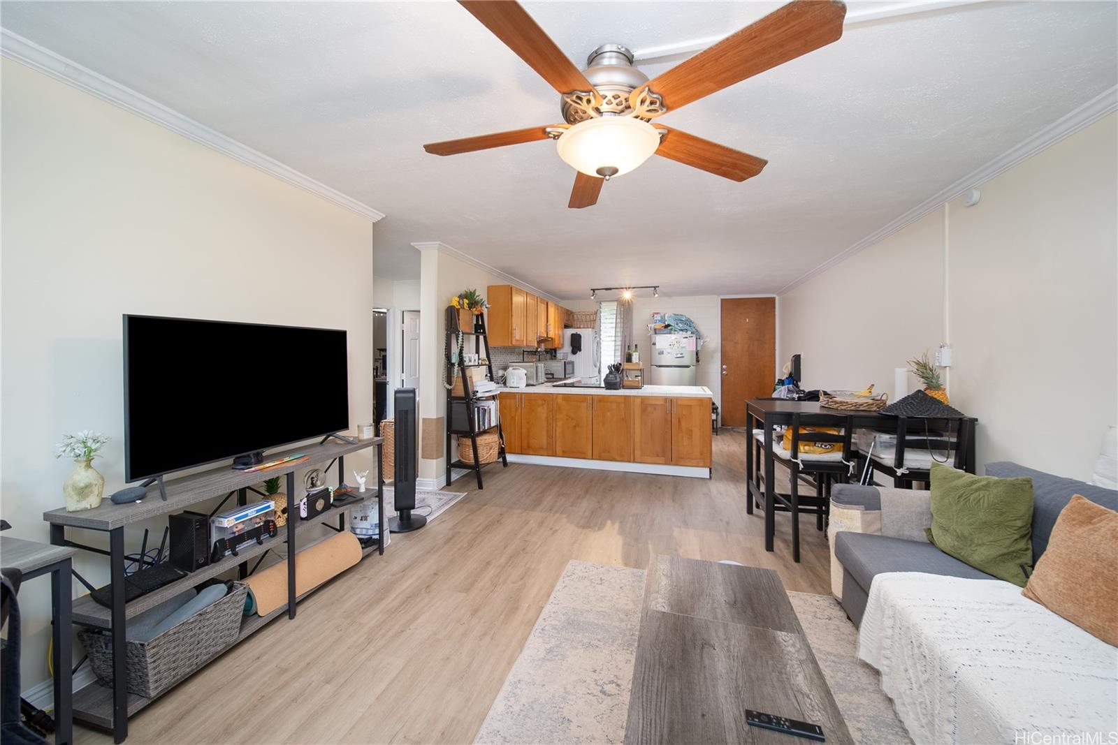 Stylish 2BR/1BA in desirable Mililani, featuring an airy open layout, sleek ceramic tile floors and luxury vinyl plank flooring, and a private lanai with tranquil tropical views. Two covered stalls plus guest parking. Resort-style amenities include pool, playground, basketball court, and rec area. Prime location near shopping, dining, top schools, Wheeler & Schofield.