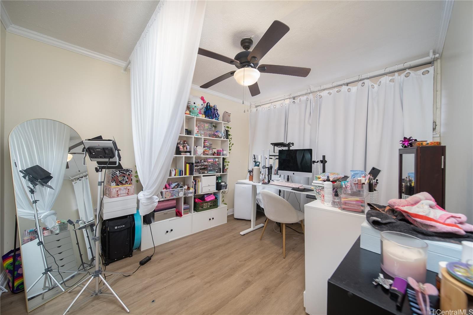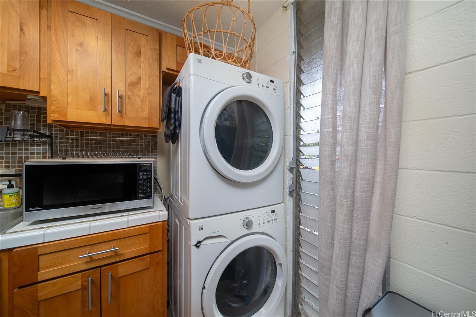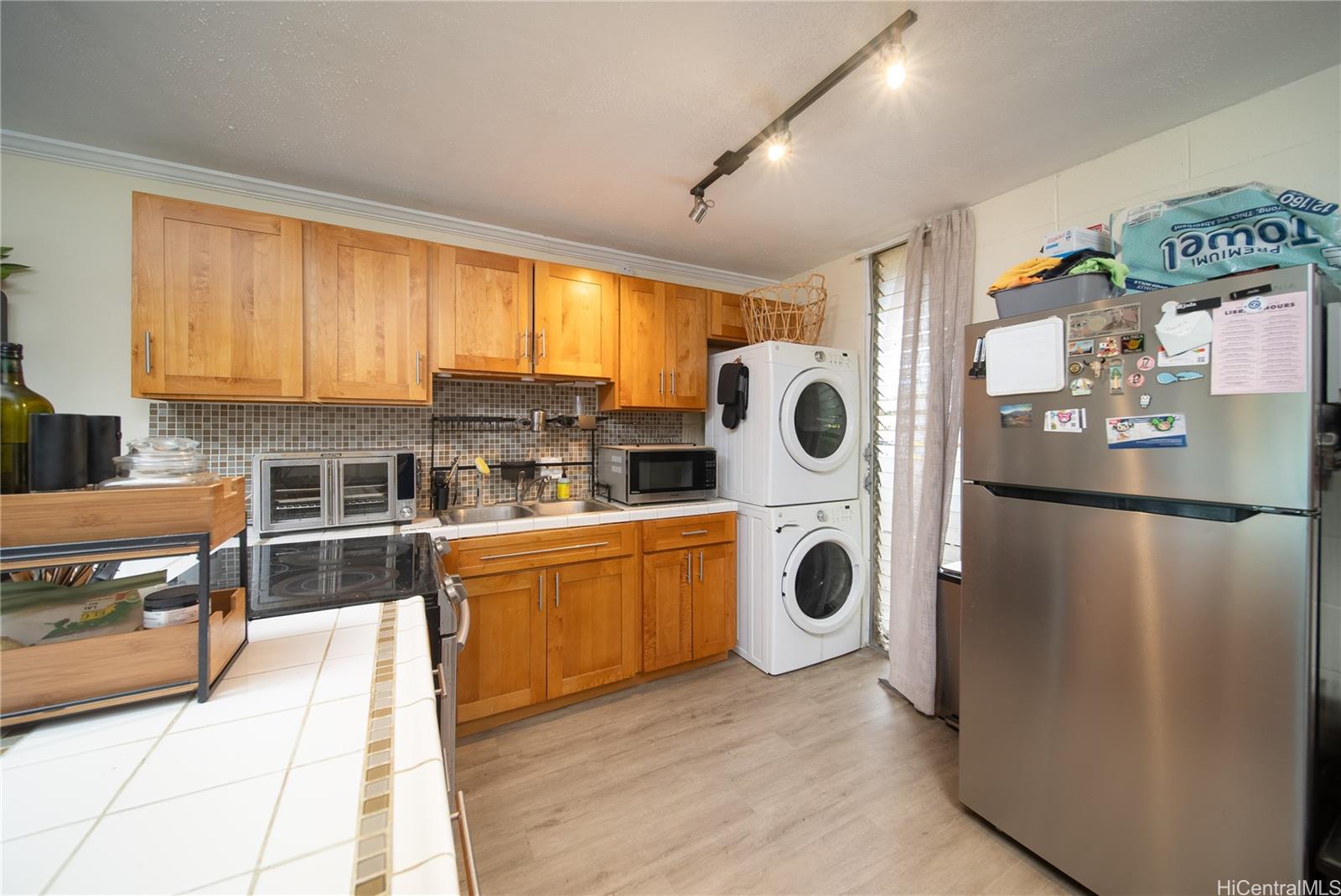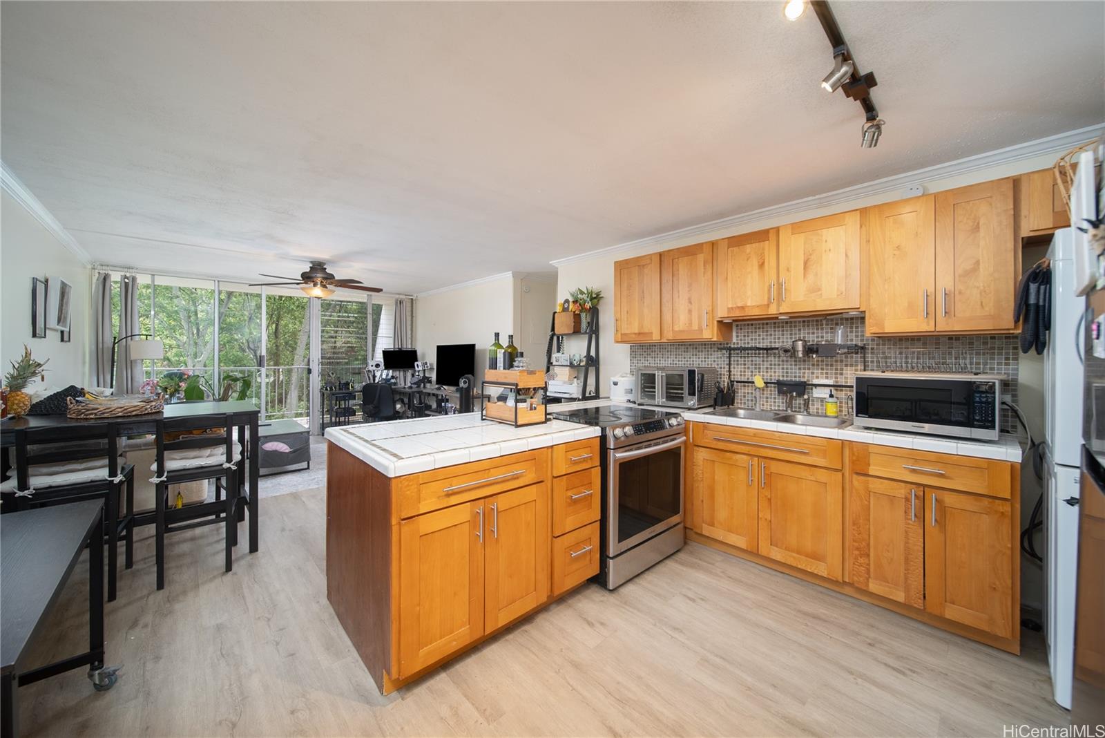 Stylish 2BR/1BA in desirable Mililani, featuring an airy open layout, sleek ceramic tile floors and luxury vinyl plank flooring, and a private lanai with tranquil tropical views. Two covered stalls plus guest parking. Resort-style amenities include pool, playground, basketball court, and rec area. Prime location near shopping, dining, top schools, Wheeler & Schofield.