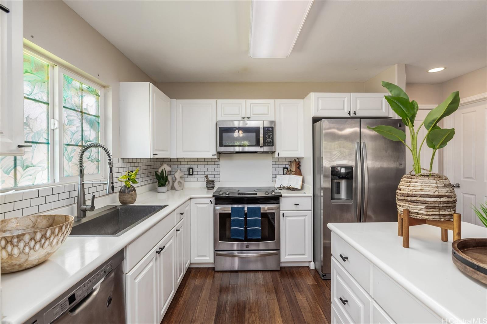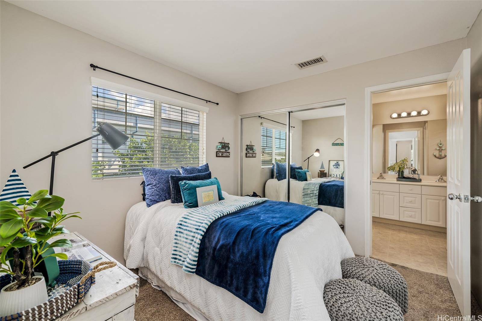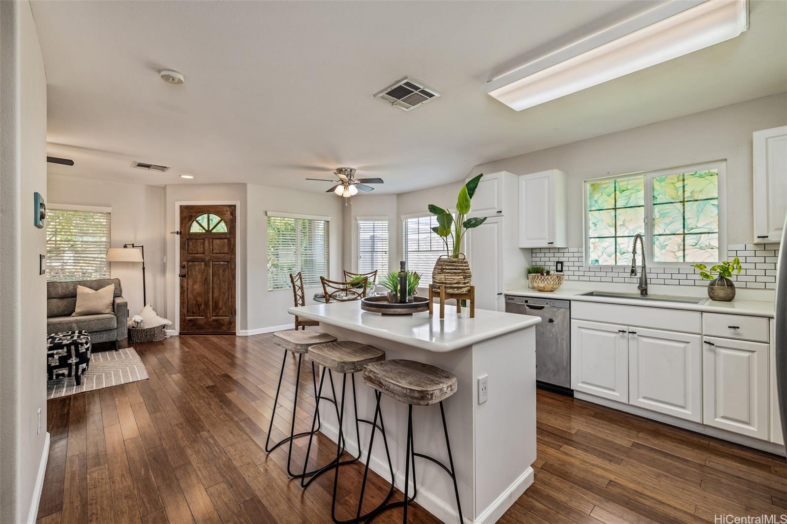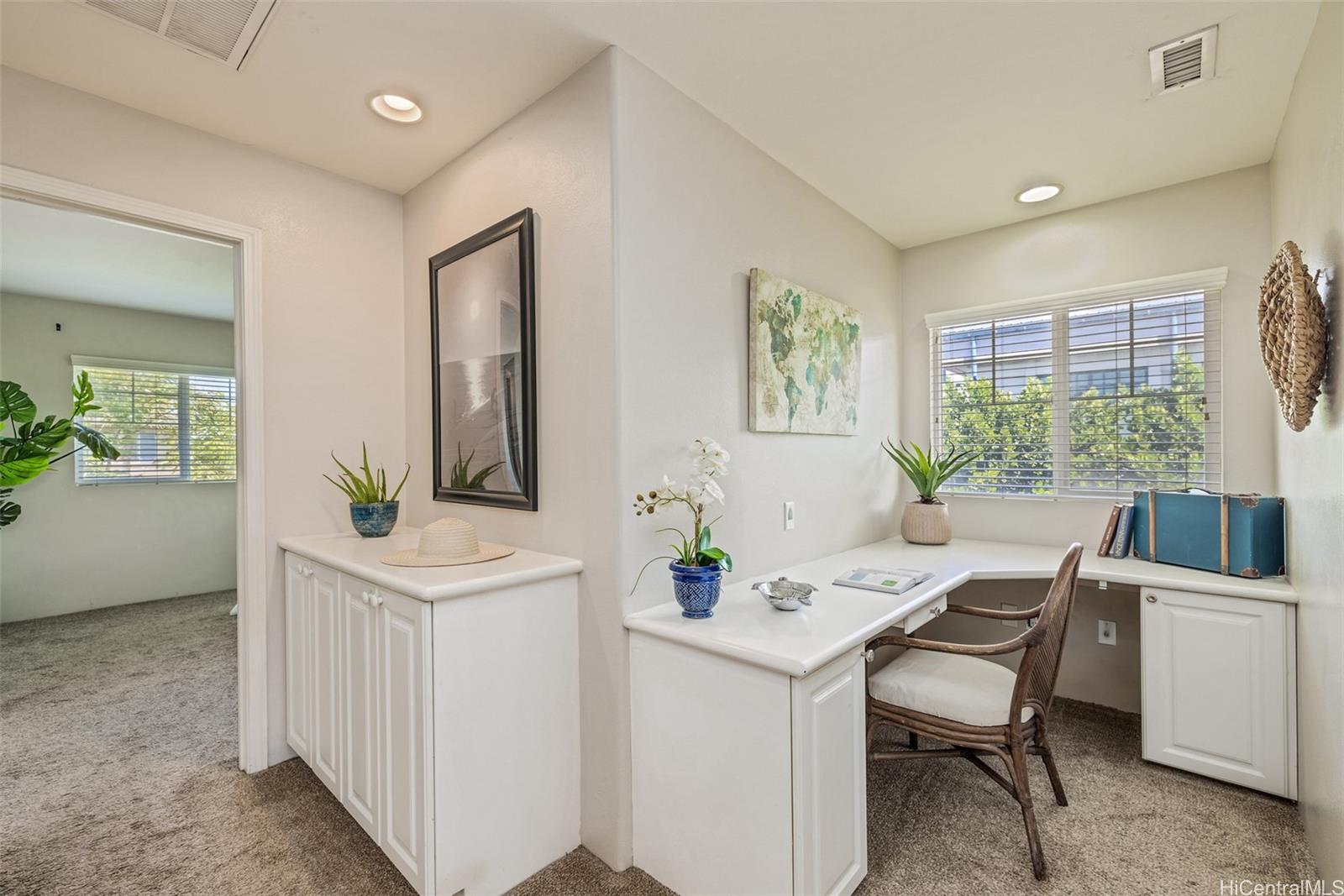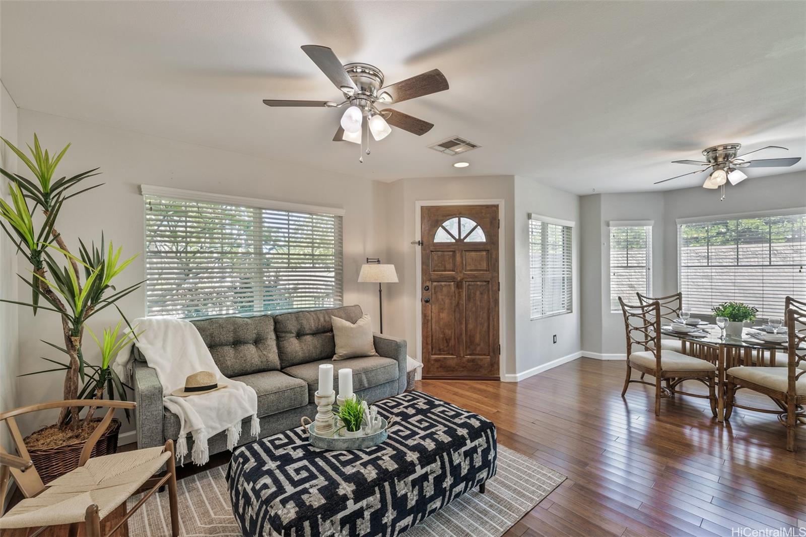 Welcome to this beautifully maintained corner-unit townhome in the sought-after Town Homes at Fairway’s Edge. Tucked away in a quiet, private location on the outer edge of the neighborhood, this 3-bedroom, 2.5-bath home offers added privacy, less traffic noise, and a thoughtfully designed layout. A spacious, fenced front yard leads to your private two-car garage with extra storage. Inside, the open living area features warm wood flooring, a recessed entertainment nook, and a dining space that flows seamlessly into the modern kitchen; complete with stainless steel appliances, farmhouse sink, and subway tile backsplash. A convenient half bath is located downstairs, along with the washer and dryer just off the kitchen. Upstairs, the expansive primary suite boasts an ensuite bath and walk-in closet, while the second and third bedrooms are connected by a Jack-and-Jill bathroom. A built-in desk on the upstairs landing provides the perfect spot for remote work or homework. Enjoy easy access to guest parking, the community pool, and BBQ area, all within minutes drive from shopping, dining, schools, and Ewa Beach Park. This home blends comfort, convenience, and location!