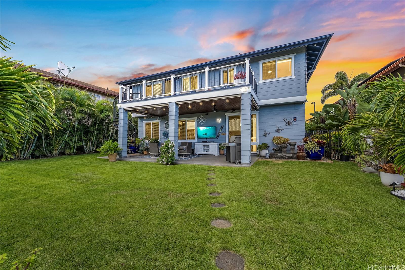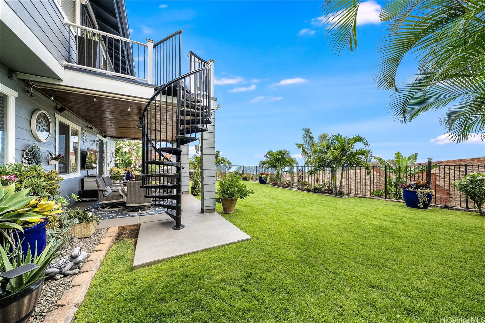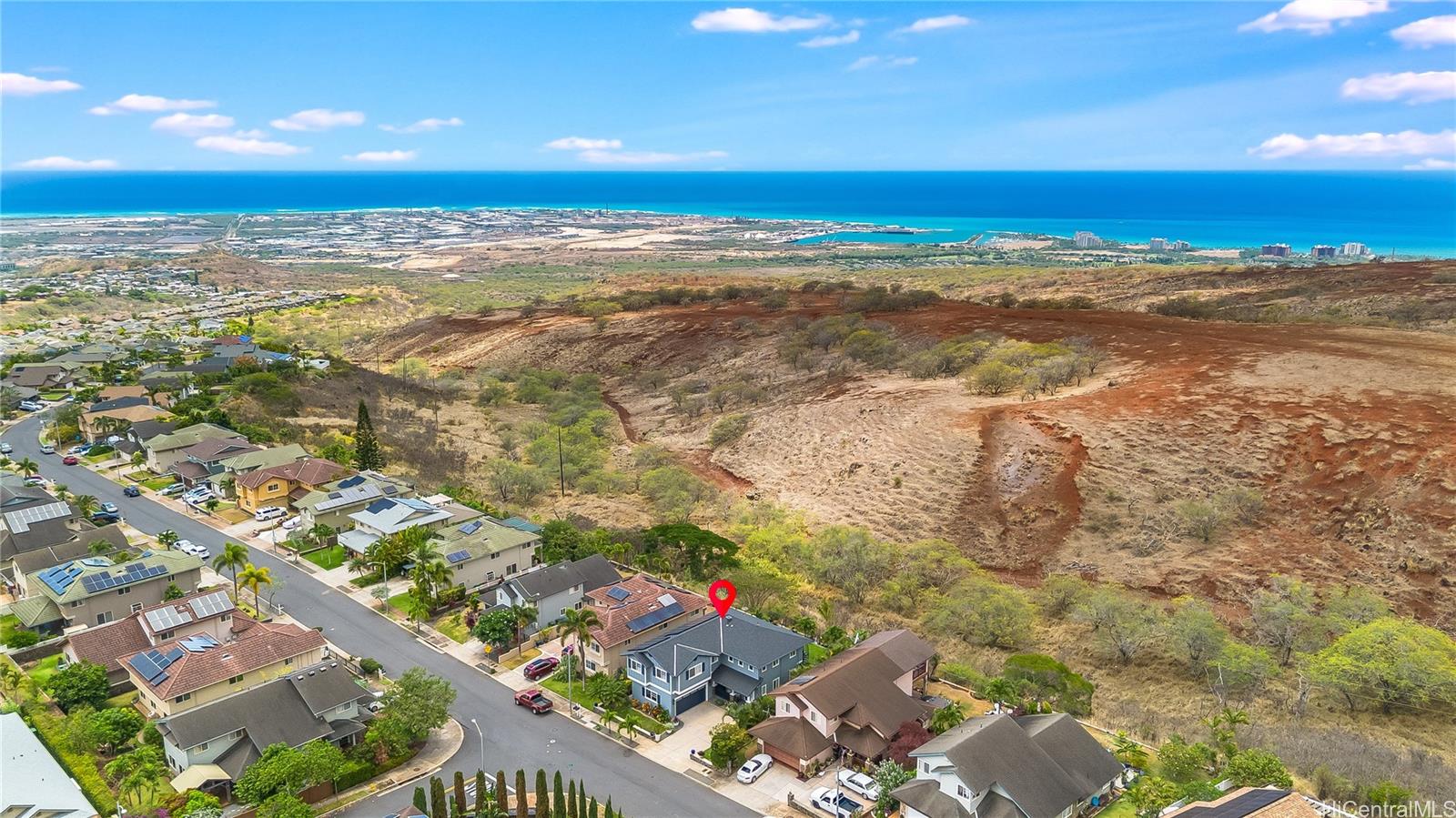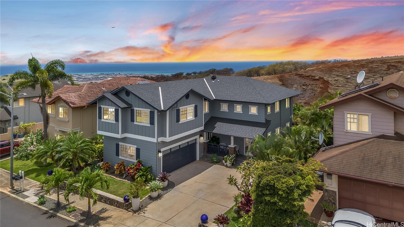 Your paradise awaits in this move-in ready rim-lot home offering rare privacy and stunning ocean, mountain, city, and sunset views. This spacious, upgraded home features an open layout with luxury vinyl plank flooring, crown molding, fresh interior/exterior paint, and a new roof (2024). Stay cool with split AC in every room, 26 owned PV panels, and 2 Tesla Powerwalls for low energy costs. Enjoy a remodeled kitchen with quartz counters and smart appliances, updated baths, new washer, newer water heater, upgraded lighting, outlets, and more. The primary suite opens to a private deck with ocean and mountain vistas. A landscaped yard with no rear neighbors features a spiral staircase to an upper deck, wood-paneled lanai, smart sprinklers, and solar deck lights—perfect for gatherings. A smart-access garage and reinforced front door add security. Located on a quiet, family-friendly street near schools, parks, shopping, dining, freeway, and Ko Olina beaches.