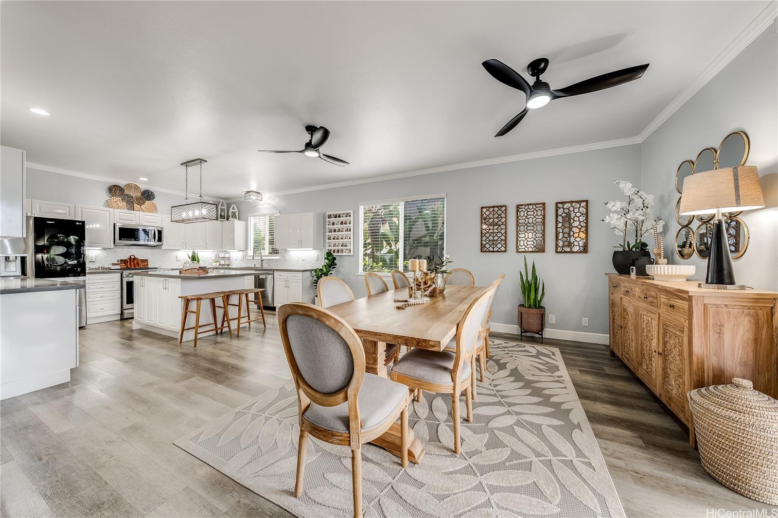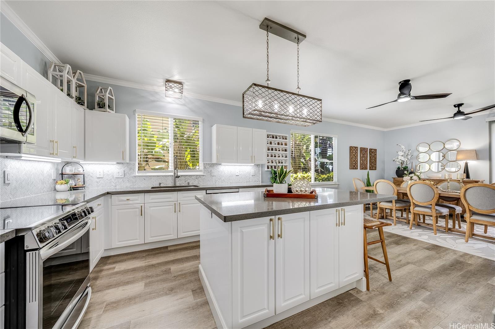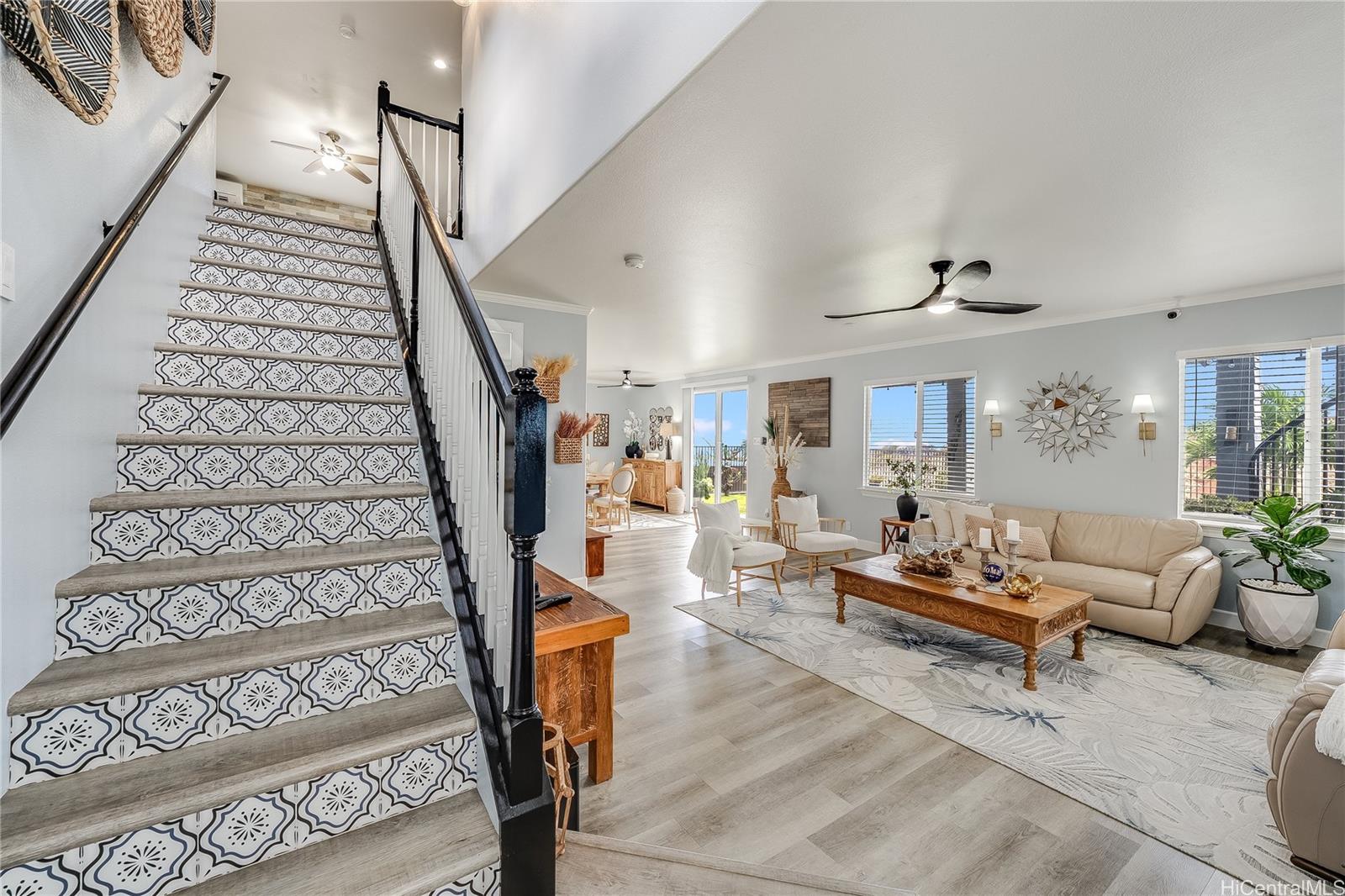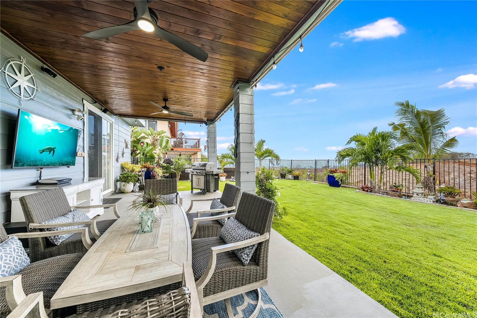 Your paradise awaits in this move-in ready rim-lot home offering rare privacy and stunning ocean, mountain, city, and sunset views. This spacious, upgraded home features an open layout with luxury vinyl plank flooring, crown molding, fresh interior/exterior paint, and a new roof (2024). Stay cool with split AC in every room, 26 owned PV panels, and 2 Tesla Powerwalls for low energy costs. Enjoy a remodeled kitchen with quartz counters and smart appliances, updated baths, new washer, newer water heater, upgraded lighting, outlets, and more. The primary suite opens to a private deck with ocean and mountain vistas. A landscaped yard with no rear neighbors features a spiral staircase to an upper deck, wood-paneled lanai, smart sprinklers, and solar deck lights—perfect for gatherings. A smart-access garage and reinforced front door add security. Located on a quiet, family-friendly street near schools, parks, shopping, dining, freeway, and Ko Olina beaches.