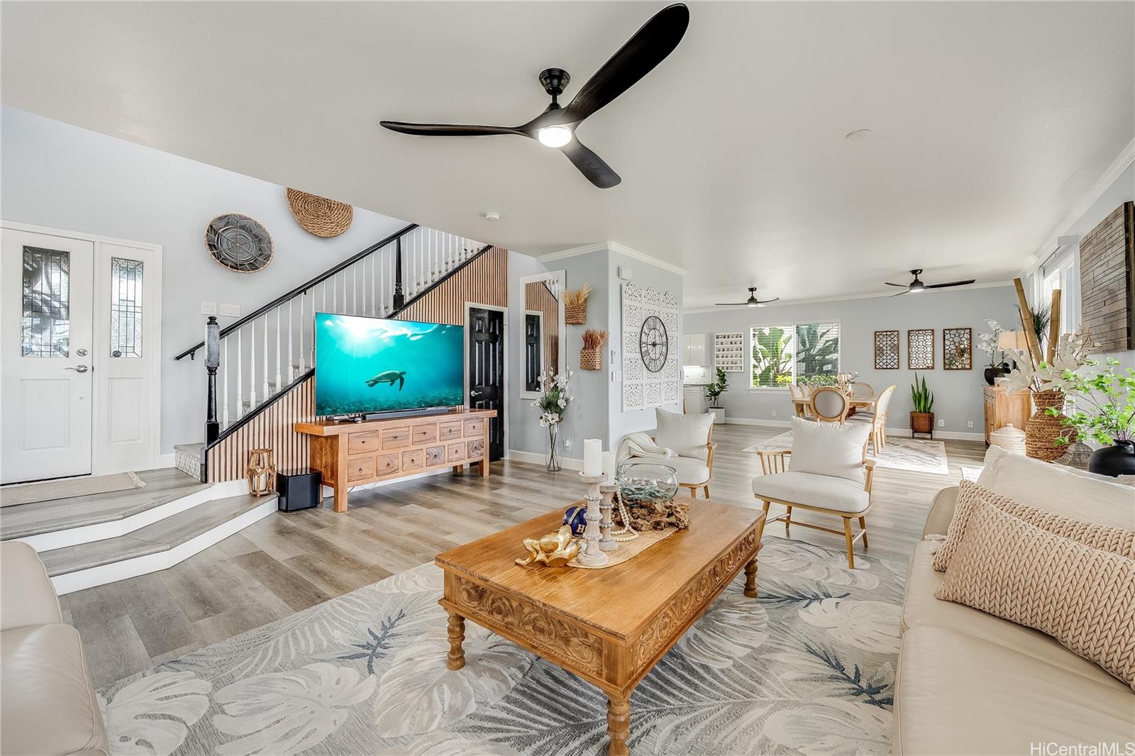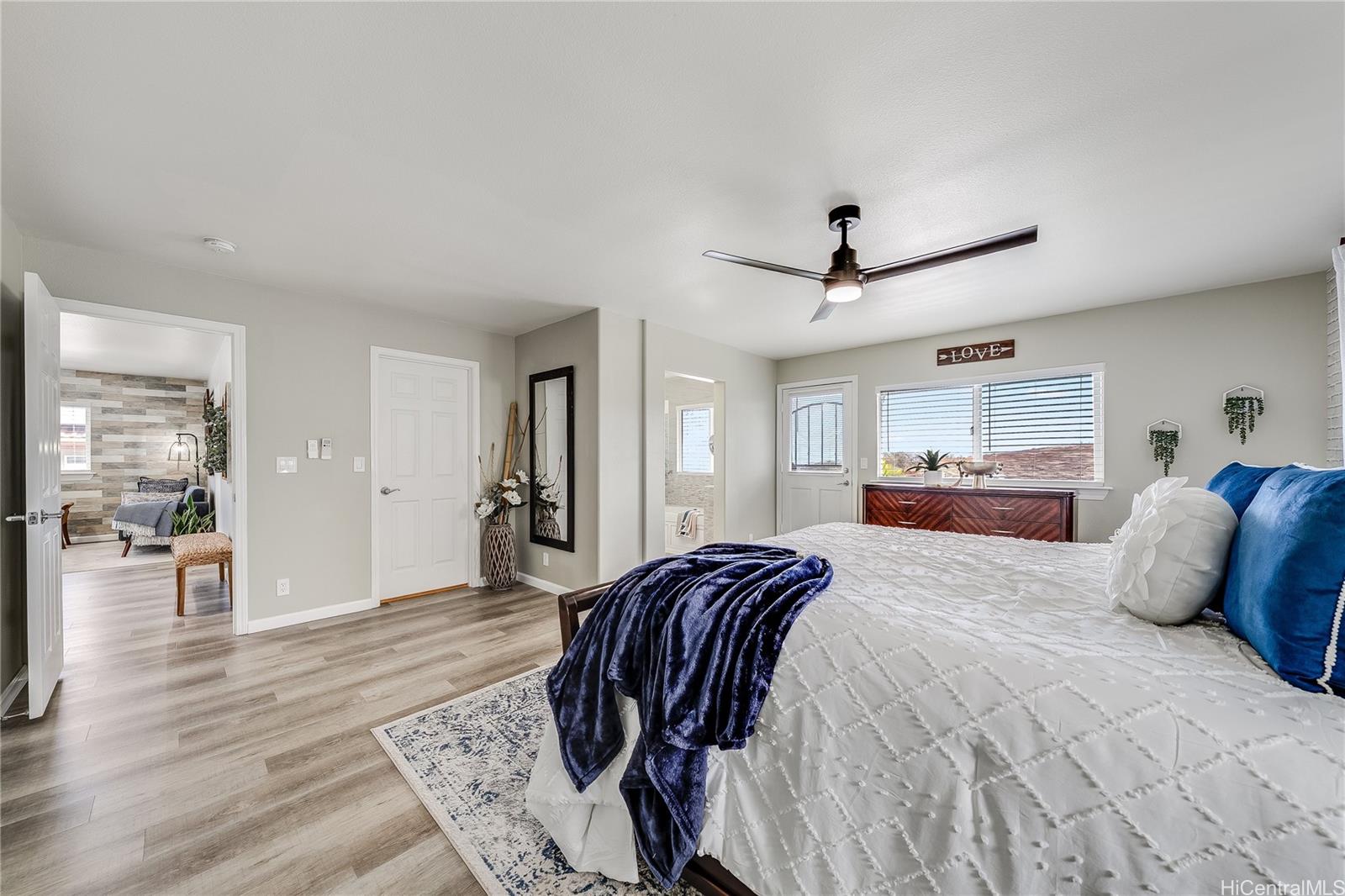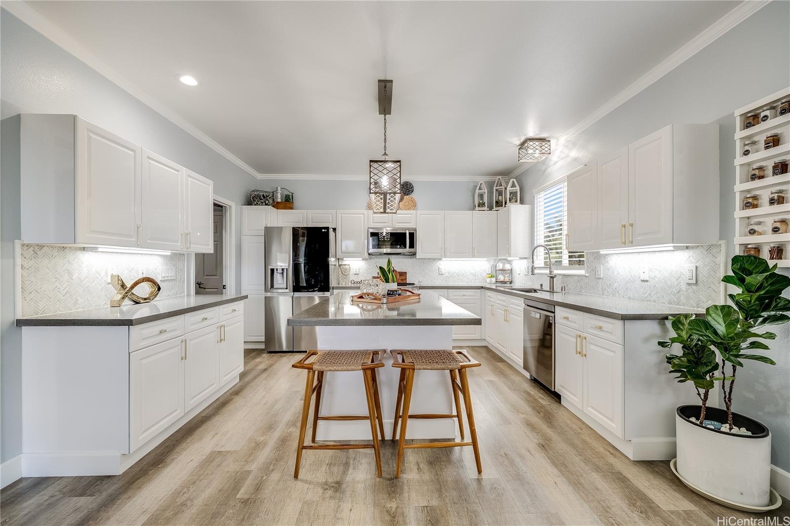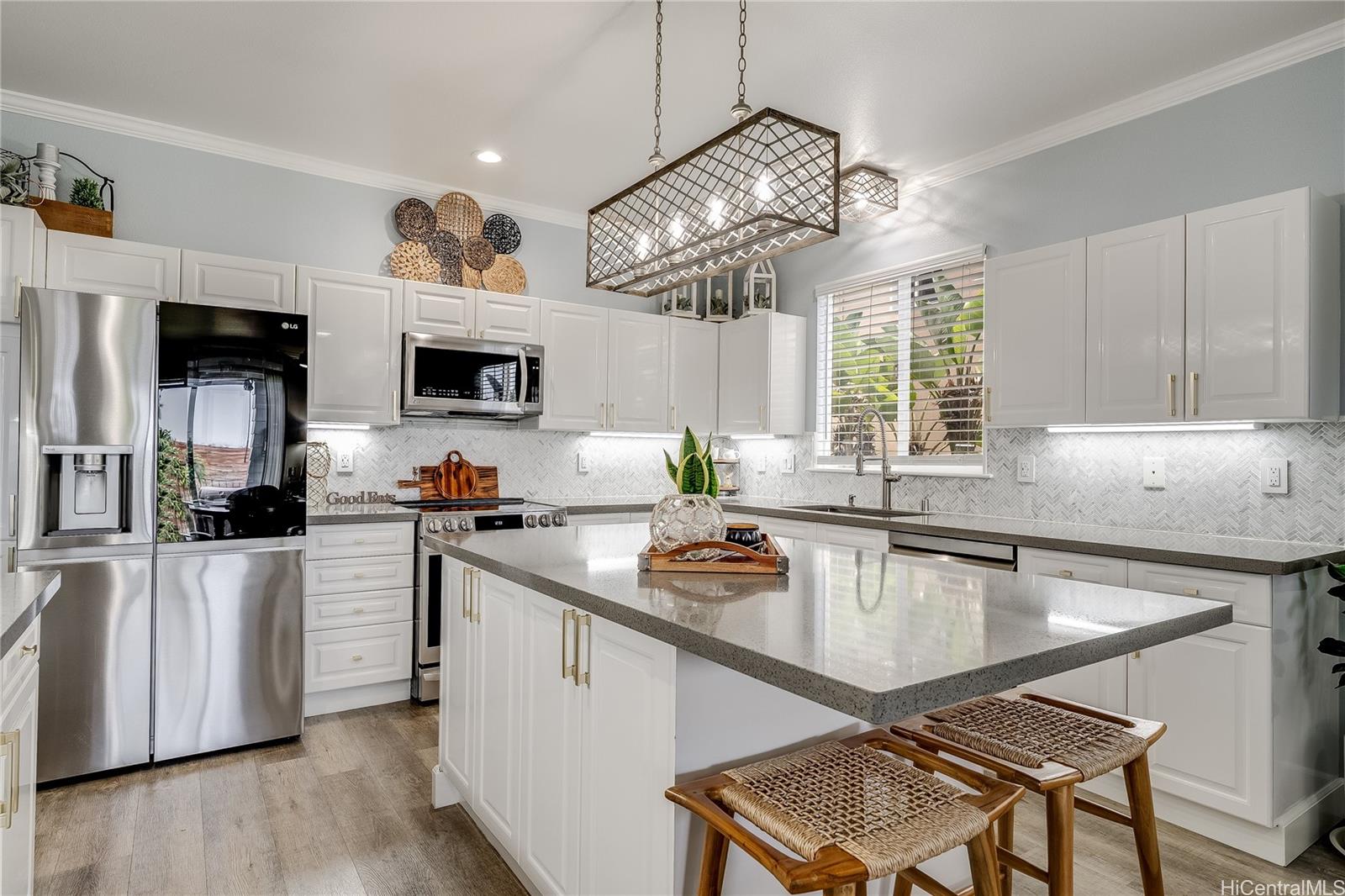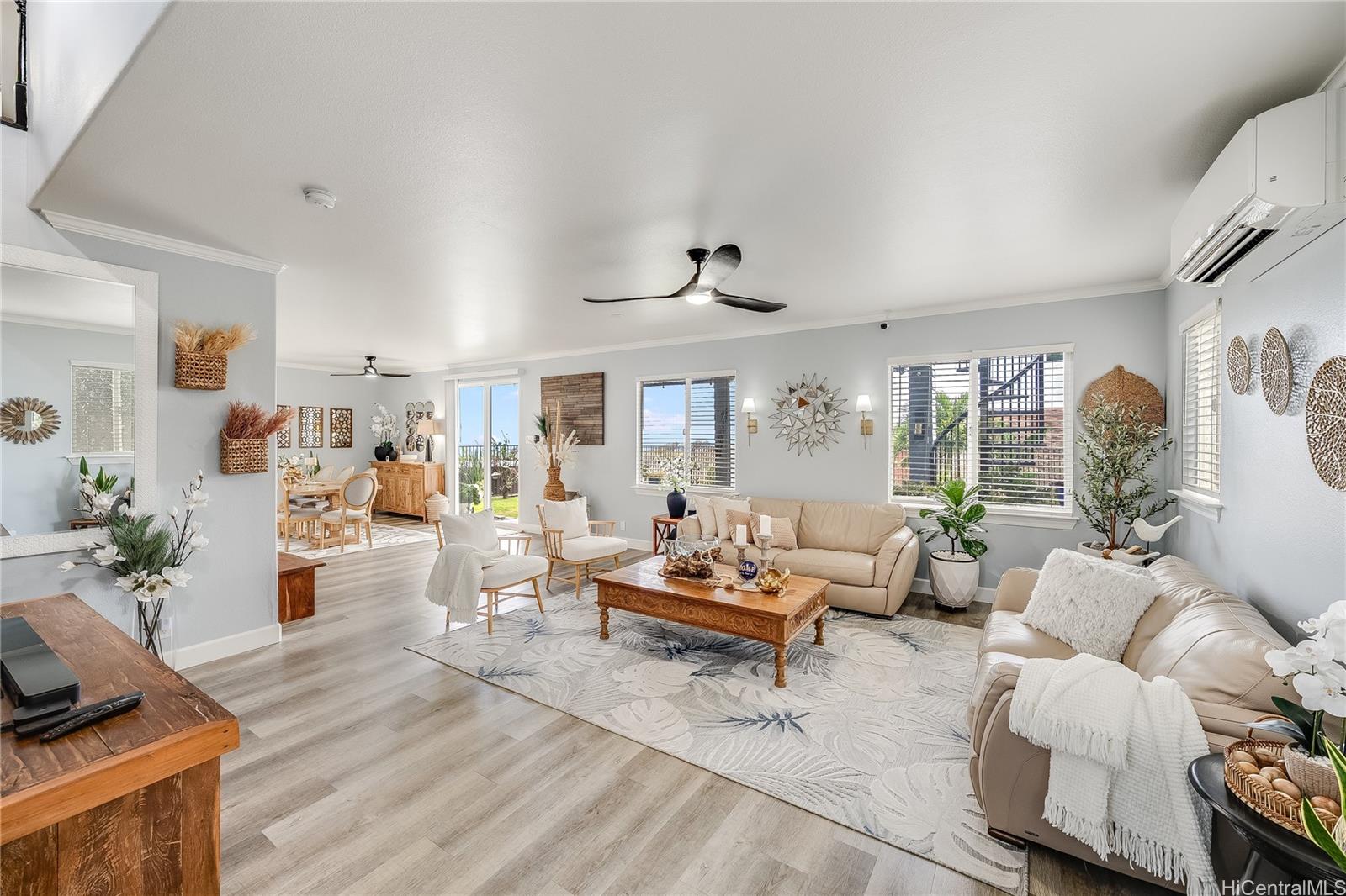 Your paradise awaits in this move-in ready rim-lot home offering rare privacy and stunning ocean, mountain, city, and sunset views. This spacious, upgraded home features an open layout with luxury vinyl plank flooring, crown molding, fresh interior/exterior paint, and a new roof (2024). Stay cool with split AC in every room, 26 owned PV panels, and 2 Tesla Powerwalls for low energy costs. Enjoy a remodeled kitchen with quartz counters and smart appliances, updated baths, new washer, newer water heater, upgraded lighting, outlets, and more. The primary suite opens to a private deck with ocean and mountain vistas. A landscaped yard with no rear neighbors features a spiral staircase to an upper deck, wood-paneled lanai, smart sprinklers, and solar deck lights—perfect for gatherings. A smart-access garage and reinforced front door add security. Located on a quiet, family-friendly street near schools, parks, shopping, dining, freeway, and Ko Olina beaches.