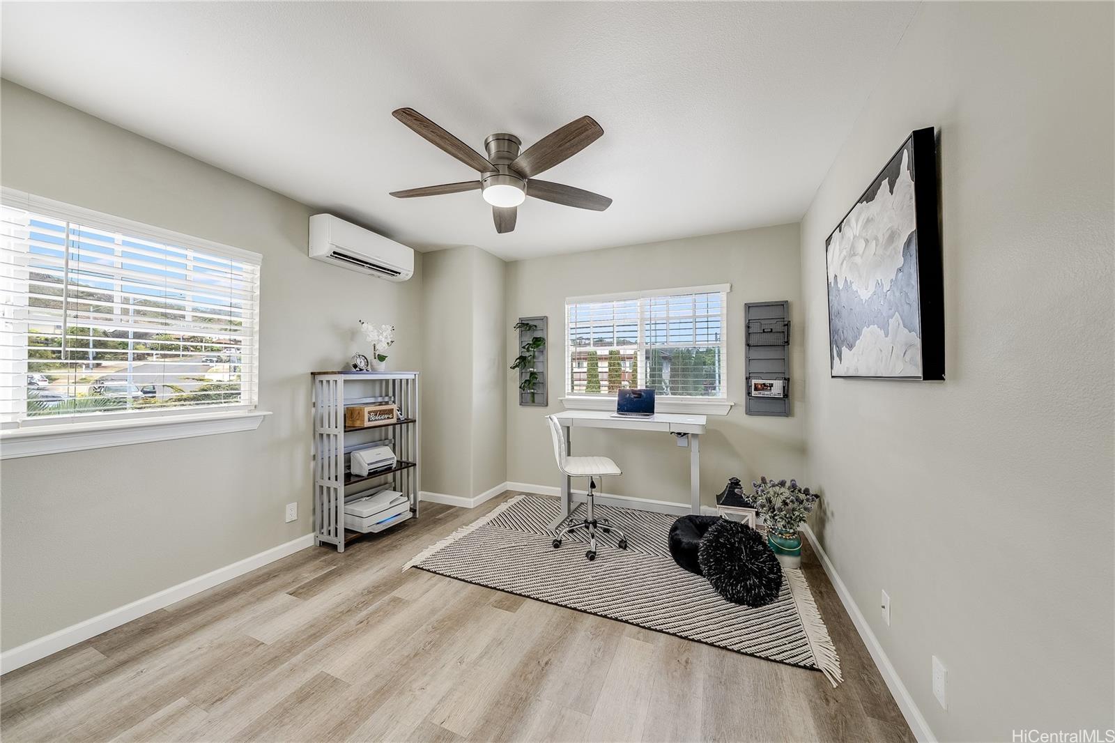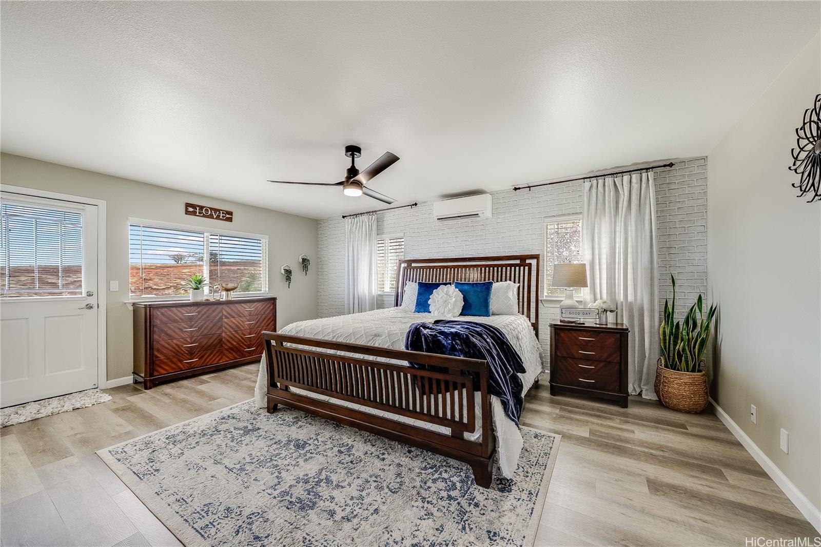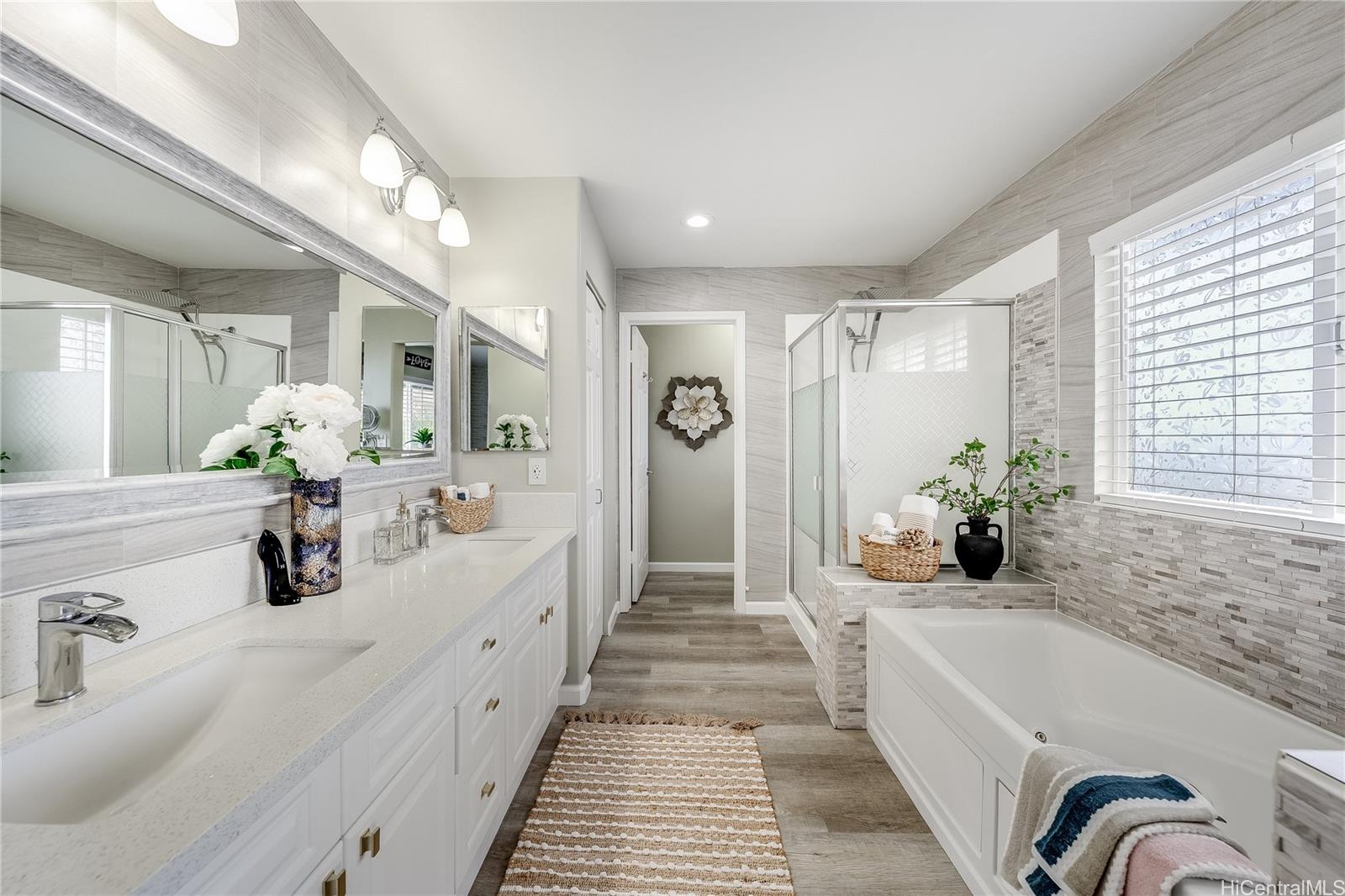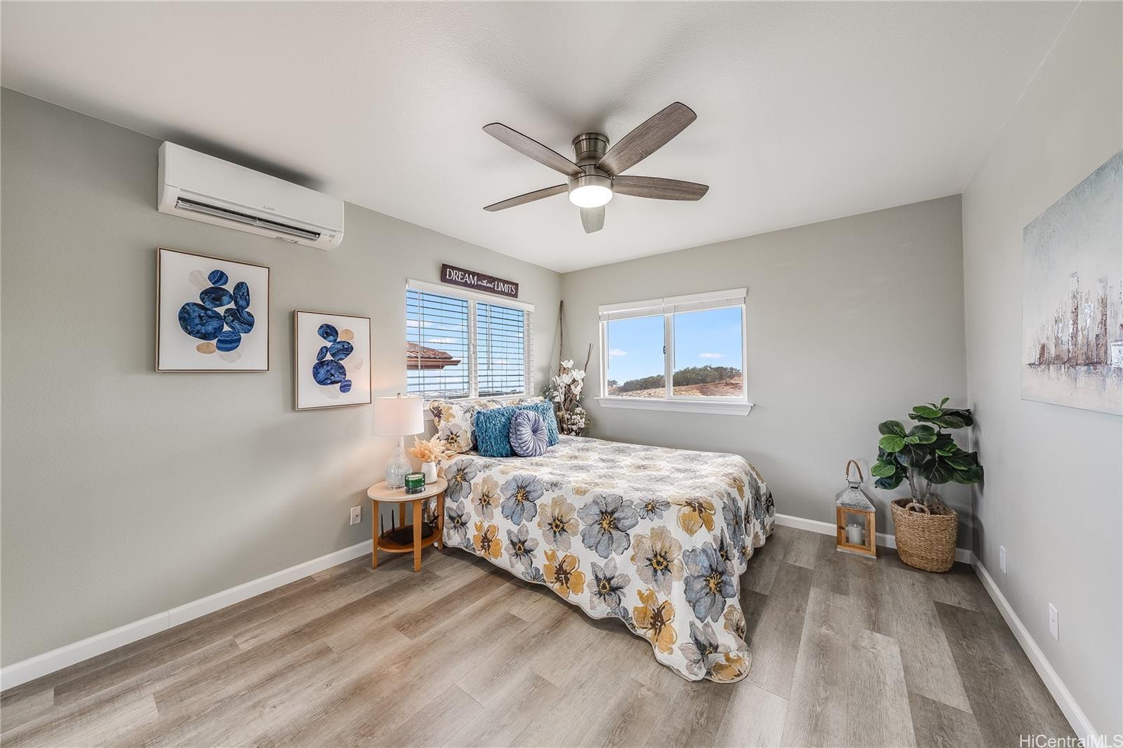 Your paradise awaits in this move-in ready rim-lot home offering rare privacy and stunning ocean, mountain, city, and sunset views. This spacious, upgraded home features an open layout with luxury vinyl plank flooring, crown molding, fresh interior/exterior paint, and a new roof (2024). Stay cool with split AC in every room, 26 owned PV panels, and 2 Tesla Powerwalls for low energy costs. Enjoy a remodeled kitchen with quartz counters and smart appliances, updated baths, new washer, newer water heater, upgraded lighting, outlets, and more. The primary suite opens to a private deck with ocean and mountain vistas. A landscaped yard with no rear neighbors features a spiral staircase to an upper deck, wood-paneled lanai, smart sprinklers, and solar deck lights—perfect for gatherings. A smart-access garage and reinforced front door add security. Located on a quiet, family-friendly street near schools, parks, shopping, dining, freeway, and Ko Olina beaches.