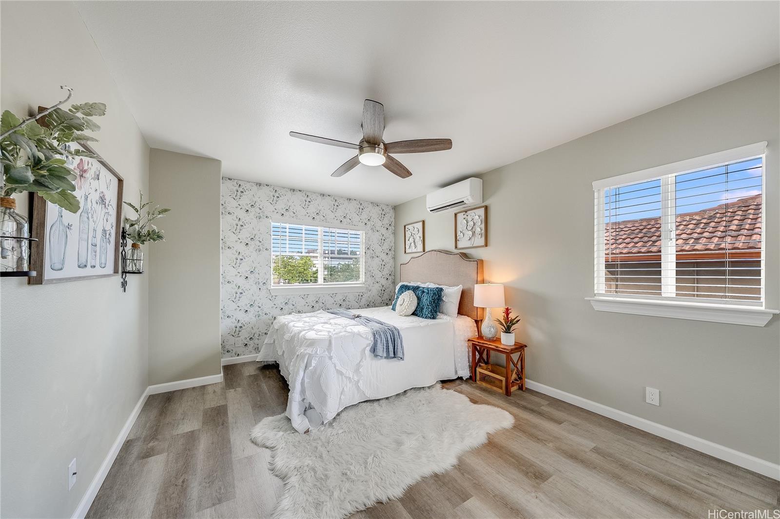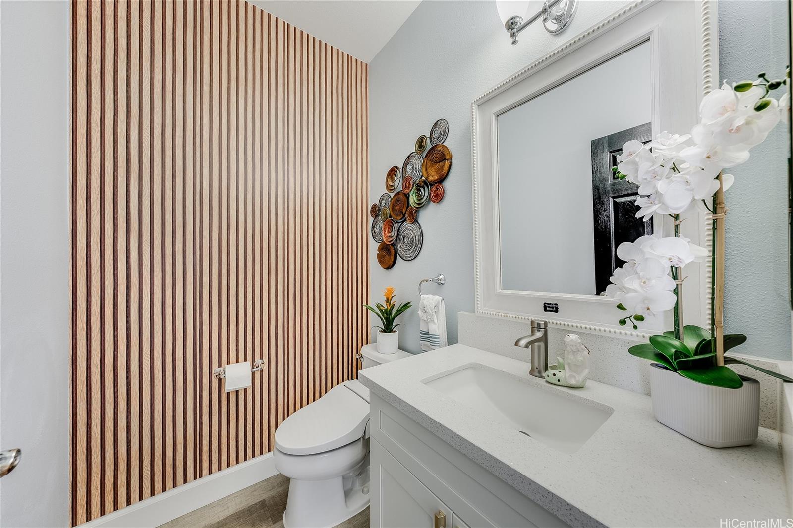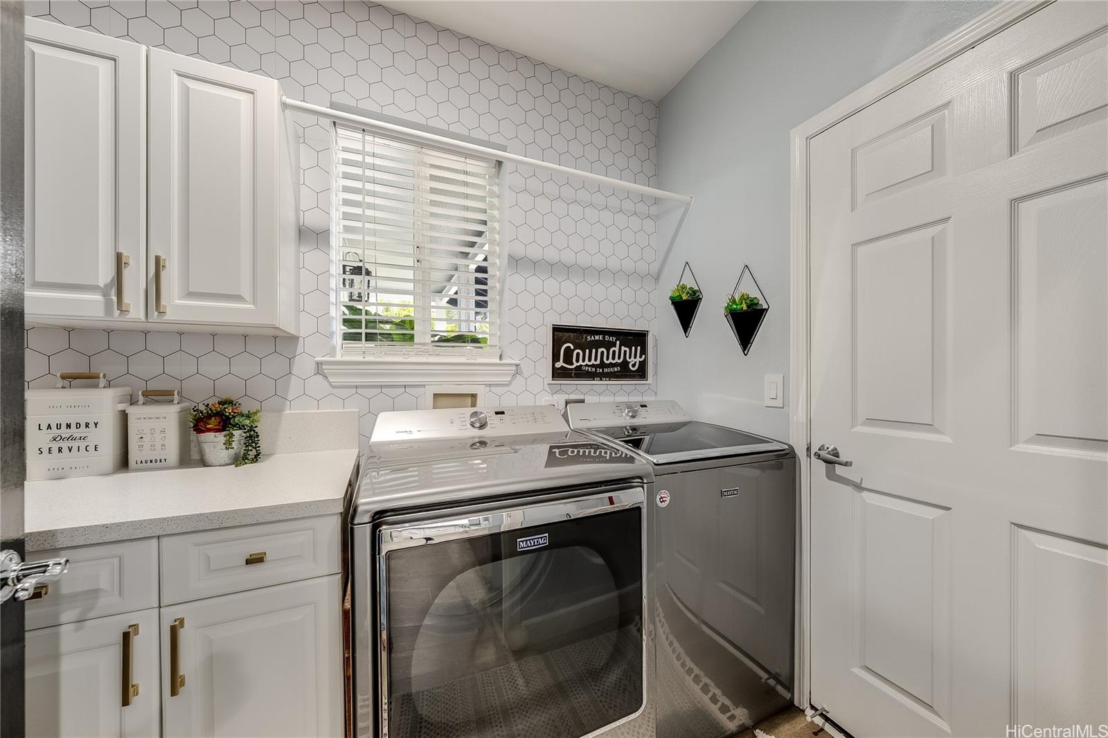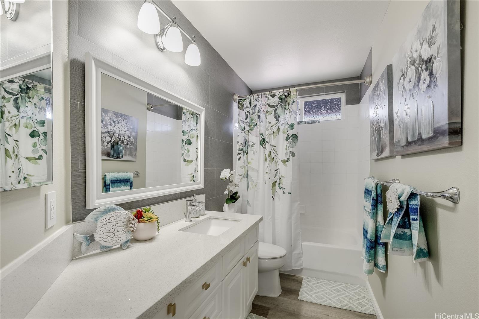 Your paradise awaits in this move-in ready rim-lot home offering rare privacy and stunning ocean, mountain, city, and sunset views. This spacious, upgraded home features an open layout with luxury vinyl plank flooring, crown molding, fresh interior/exterior paint, and a new roof (2024). Stay cool with split AC in every room, 26 owned PV panels, and 2 Tesla Powerwalls for low energy costs. Enjoy a remodeled kitchen with quartz counters and smart appliances, updated baths, new washer, newer water heater, upgraded lighting, outlets, and more. The primary suite opens to a private deck with ocean and mountain vistas. A landscaped yard with no rear neighbors features a spiral staircase to an upper deck, wood-paneled lanai, smart sprinklers, and solar deck lights—perfect for gatherings. A smart-access garage and reinforced front door add security. Located on a quiet, family-friendly street near schools, parks, shopping, dining, freeway, and Ko Olina beaches.