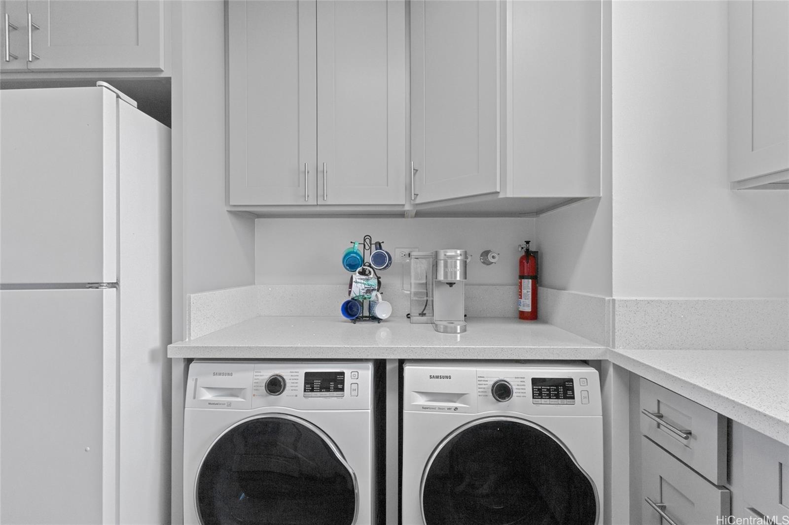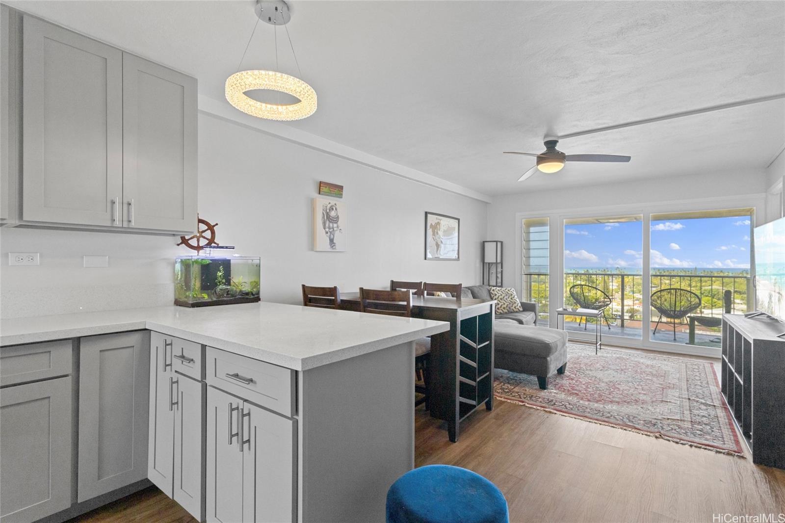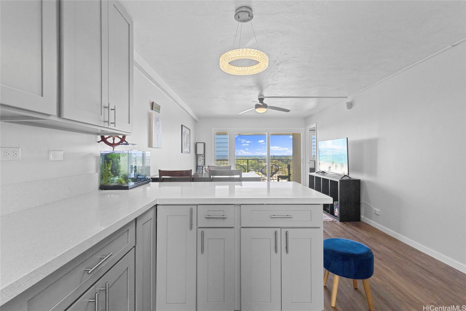 メリディアン・イーストの高層階に位置する、見事に改装された角部屋。広々としたベランダからはカイルア湾を一望できます。この2ベッドルームの住宅は、クォーツのカウンタートップ、上質な木製キャビネット、最新の家電製品、そして高級ビニールとセラミックタイルの床など、モダンな仕上げが施されています。オープンコンセプトのリビングスペースはベランダまでシームレスに続き、海を背景にカイルアの街の景色をお楽しみいただけます。新しいビニール窓とシーリングファンが風通しと自然光を促進します。キッチンにはバーカウンターがあり、メインのリビングエリアと繋がっているため、エンターテイメントに最適です。プールサイドでリラックスしたり、世界的に有名なカイルアビーチへちょっとしたお出かけを楽しんだりできます。人気のショップやレストランに囲まれた、安全でペット同伴可能な建物に、屋根付き駐車スペースが1台分含まれています。わずか2.5%のVA(退役軍人ローン)をご利用ください!今日の市場において、これは素晴らしい機会です。