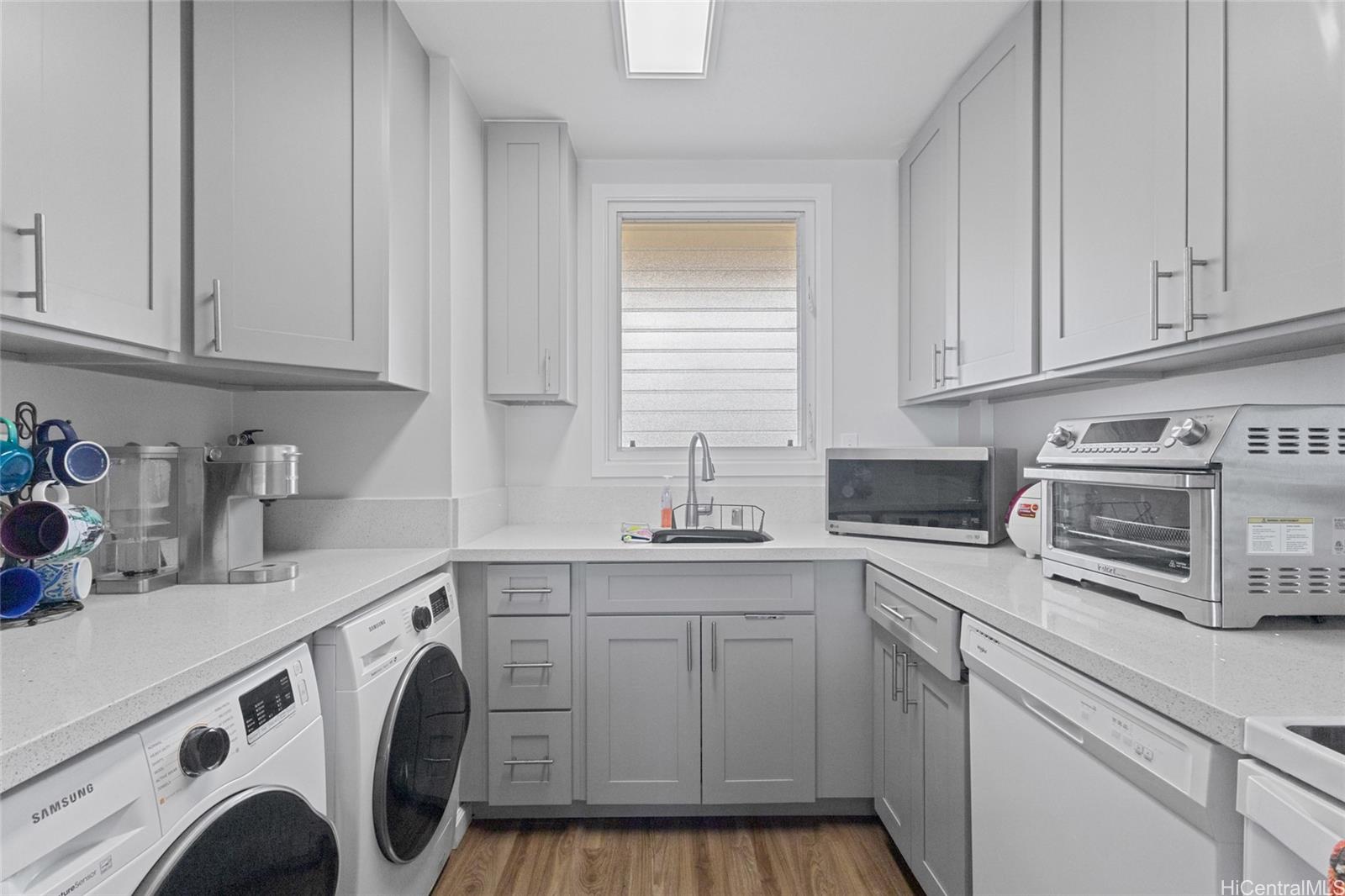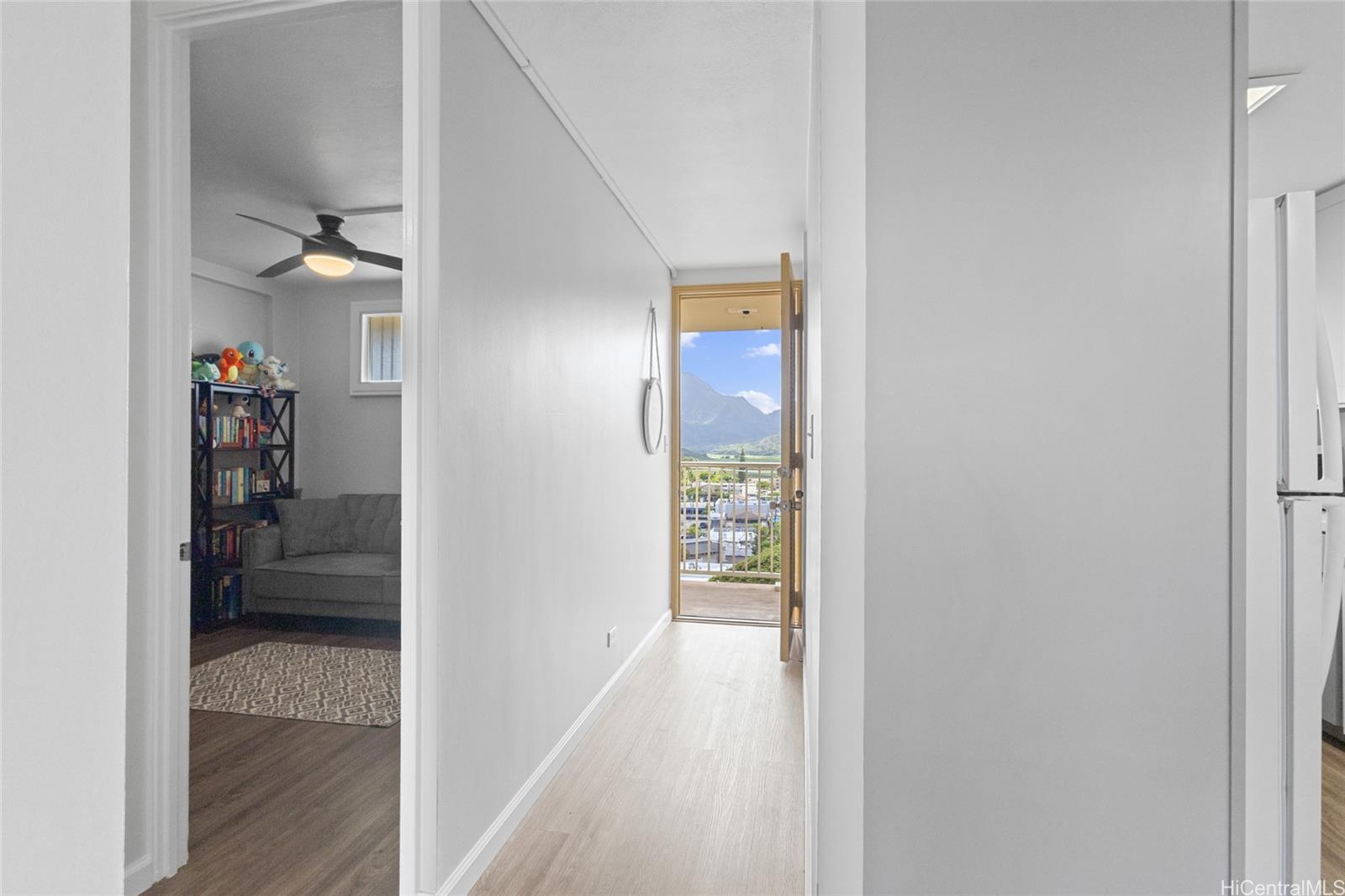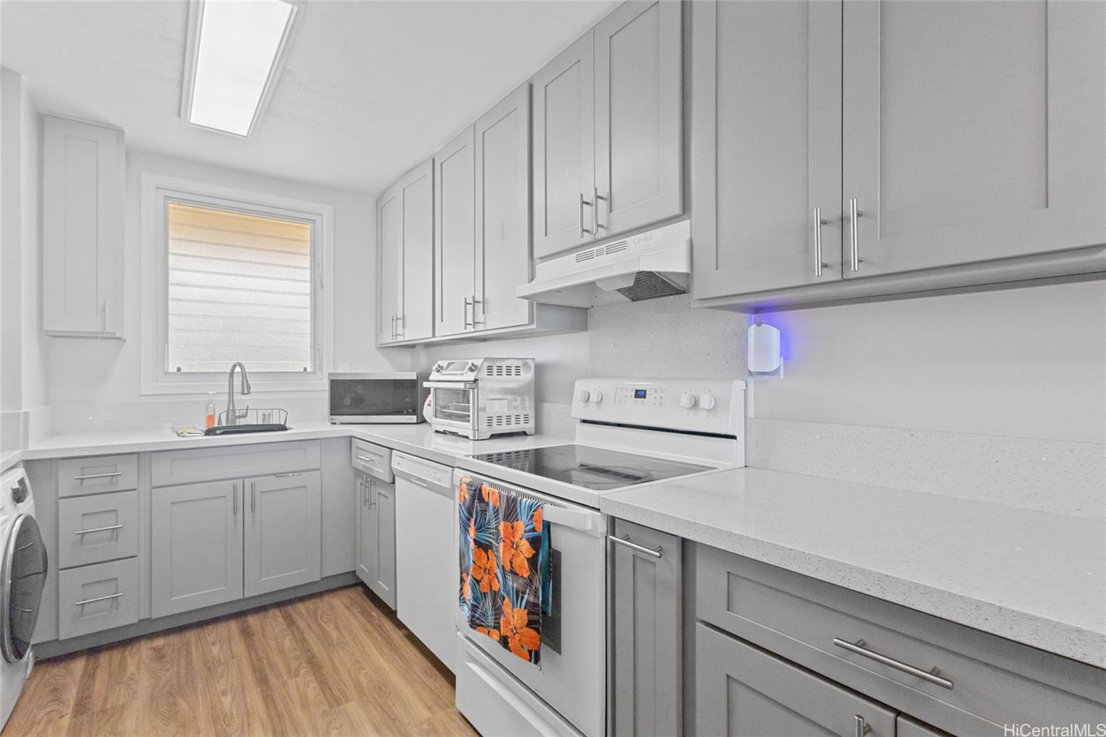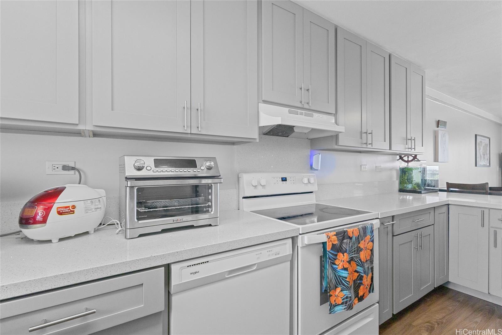 This 2-bedroom home boasts modern finishes, including quartz countertops, rich hardwood cabinetry, updated appliances, and luxury vinyl and ceramic tile flooring throughout. The open-concept living space extends seamlessly to the lanai, where you can enjoy the sights of Kailua town with the ocean as your backdrop. New vinyl windows and ceiling fans enhance airflow and natural light. The kitchen features bar seating andopens up to the main living area—perfect for entertaining. Enjoy relaxing by the pool or take a quick trip to the world-renowned Kailua Beach. Includes one covered parking space in a secure, pet-friendly building surrounded by popular shops and dining options. Take advantage of a VA assumable loan at just 2.5%! An incredible opportunity in today’s market.