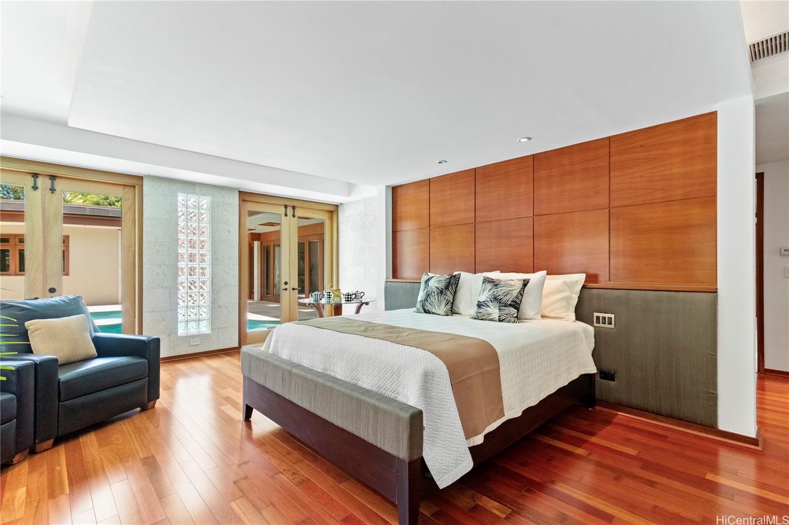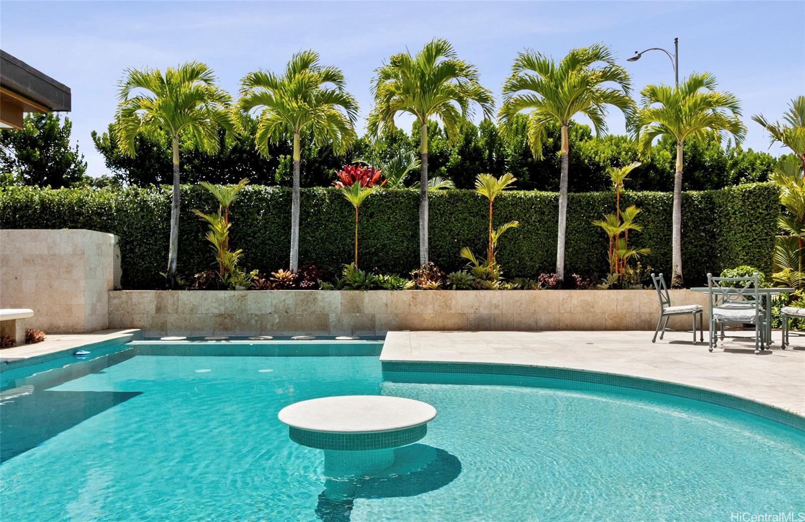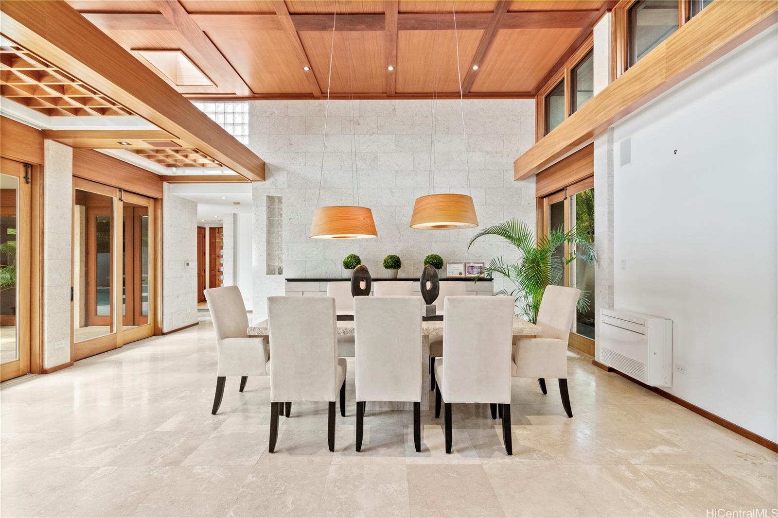 Modern Island Sanctuary in the heart of Kahala...single level home with very open floor plan ..living, dining, kitchen, primary bedrooms all opening out to the swimming pool and lush manicured landscaping .. vaulted ceilings with wood trim, skylights and lots of glass to let in the natural light, exquisite coral stone throughout the home enhance the architecture, sophisticated chef's kitchen with high end appliances ... innovative revolving glass doors from living room looking out to the pool with waterfalls and indoor water feature...seamless indoor/outdoor flow.