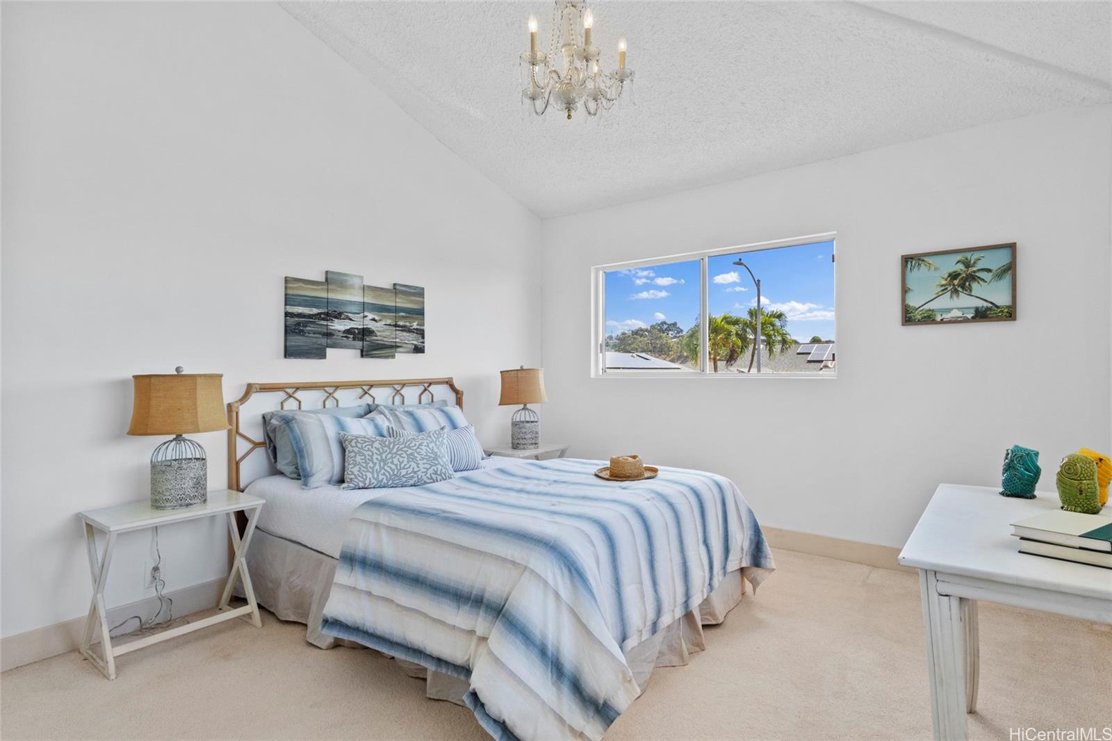Welcome home to this move-in ready in Upper Makakilo! This spacious two-story residence embraces the cool trade winds, abundant natural light, and beautiful mountain views from the second floor bedroom.. The main living area features an enclosed patio and open floor plan that flows seamlessly into the spacious kitchen and dining area. Upstairs, you’ll find the bedrooms, including the primary suite with its own ensuite bathroom and walk-in closet. The lower level offers another large living area with direct access to the covered lanai. Four additional bedrooms and ample closet space provide comfort and flexibility for the entire family. With 2,828 sq. ft. of living space on a 6,271 sq. ft. lot, this home also includes a large side and backyard and an enclosed two-car garage. Conveniently located near H-1 freeway access (East & West), Costco, Home Depot, golf courses, shopping,