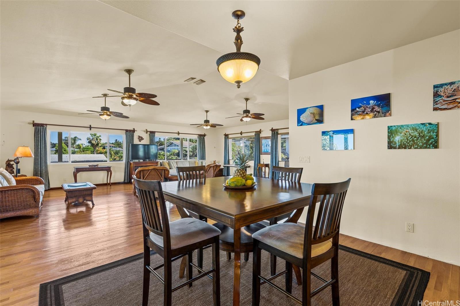 This 3-bedroom, 3-bath home (built 2006) is designed with elevated positioning and high ceilings that capture breezes and blue horizon views. Hardwood floors flow throughout, complemented by custom wood finishes that reflect the craftsmanship of its owner — a shipbuilder and restorer of classic wooden yachts. An expansive wrap-around lanai enhances indoor-outdoor living, while a convenient downstairs bath is perfect for rinsing off after the beach or outdoor activities before heading upstairs.