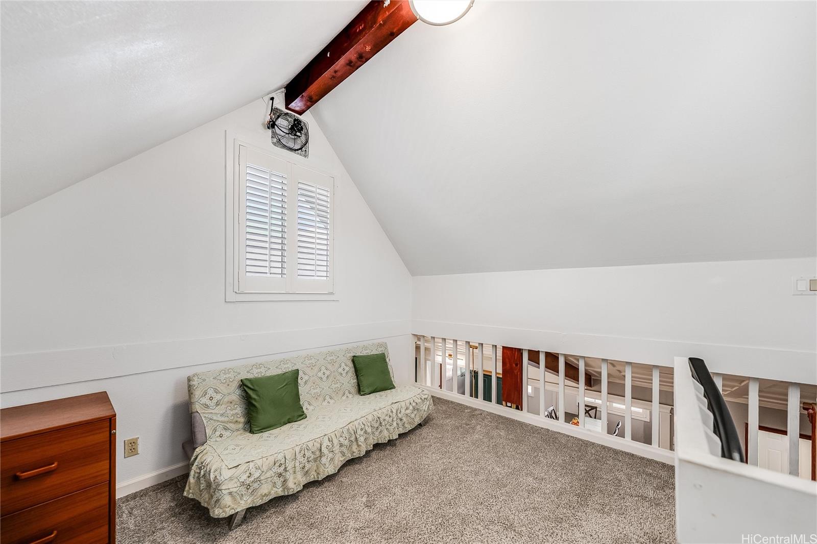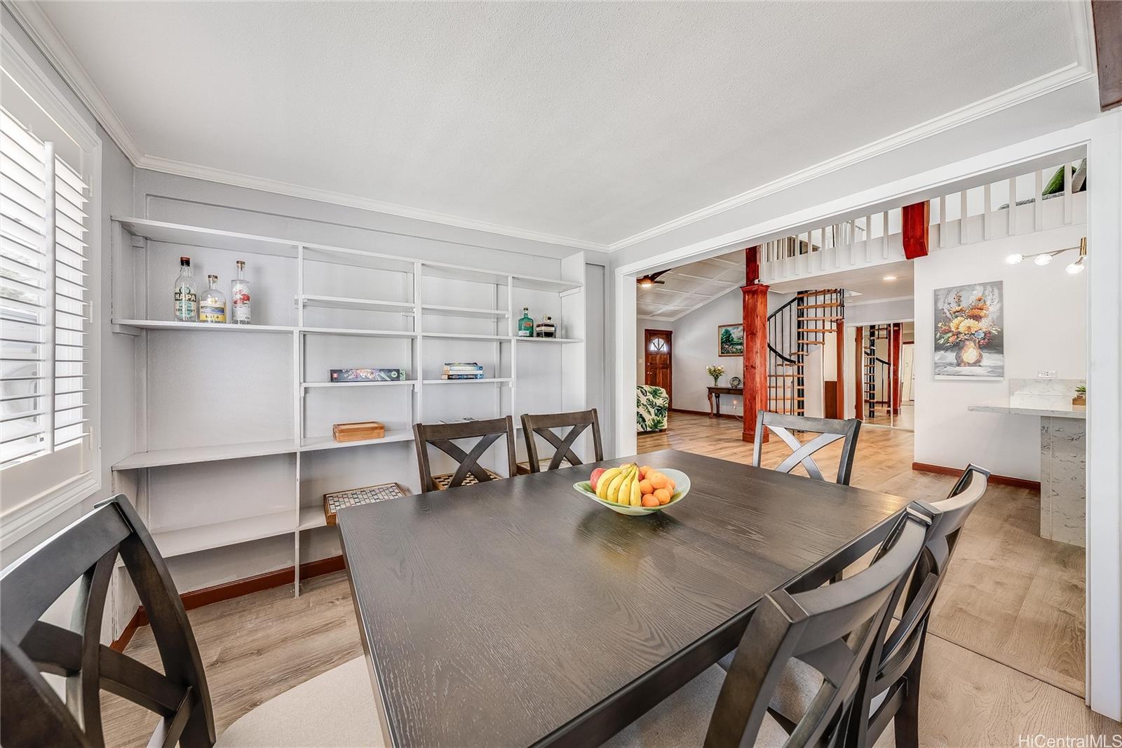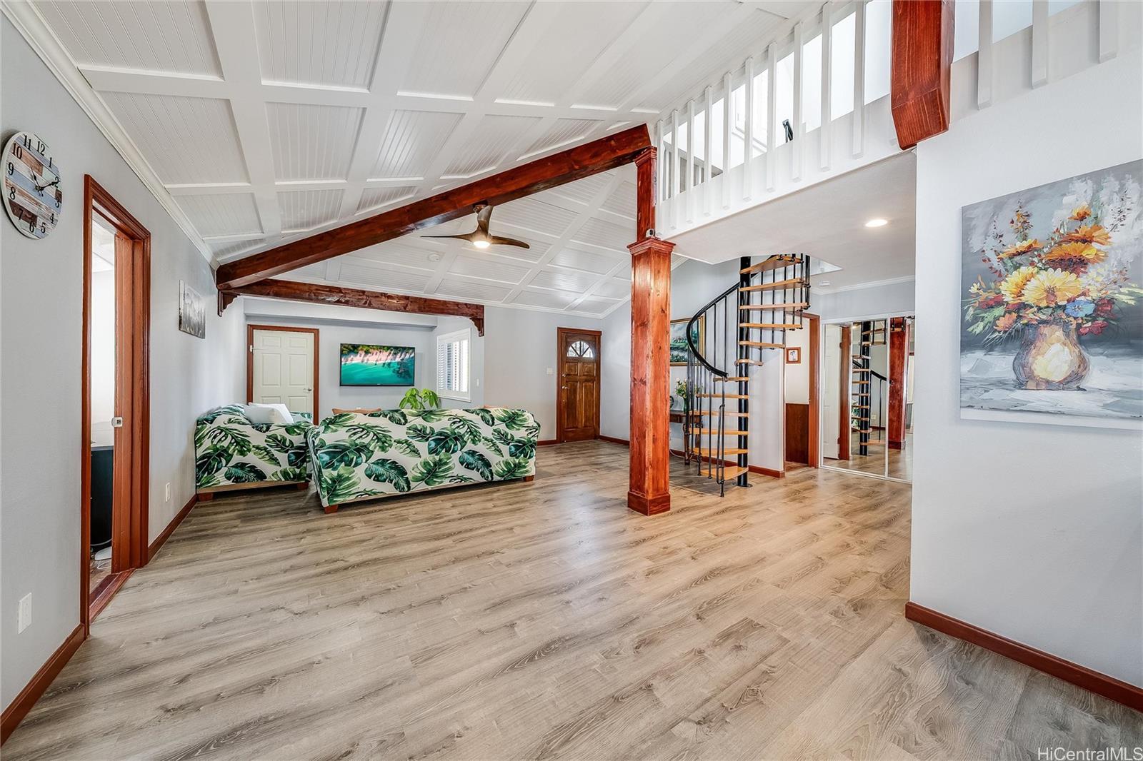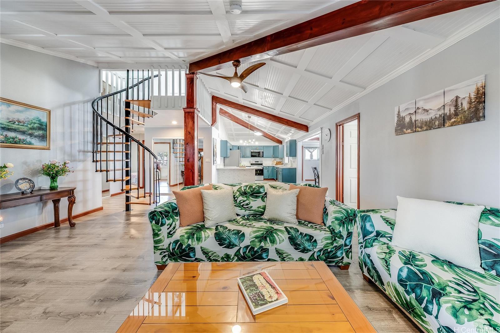 A spiral staircase leads to a versatile loft space, perfect for a home office, creative studio, or cozy reading nook. Bathrooms have been beautifully remodeled with custom tilework. Twenty-four owned PV panels help you save on electricity all year long. A spacious garage, an expansive covered lanai, and front and back yards with fruit trees are just added bonuses to this Mililani gem.