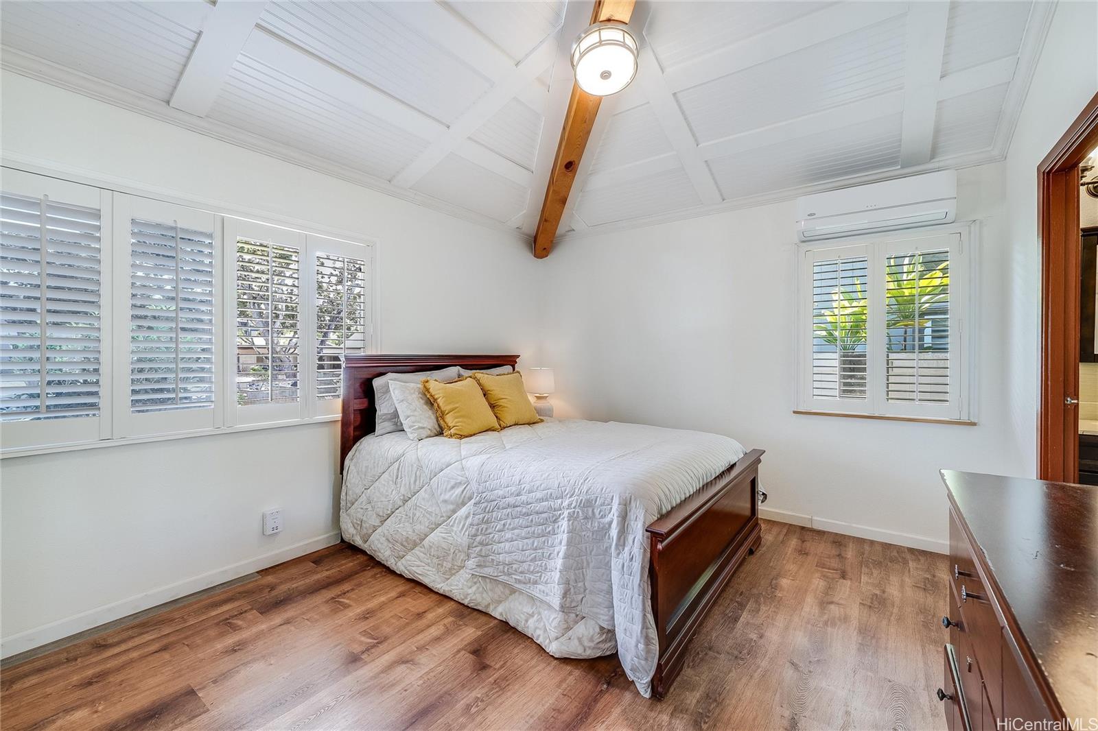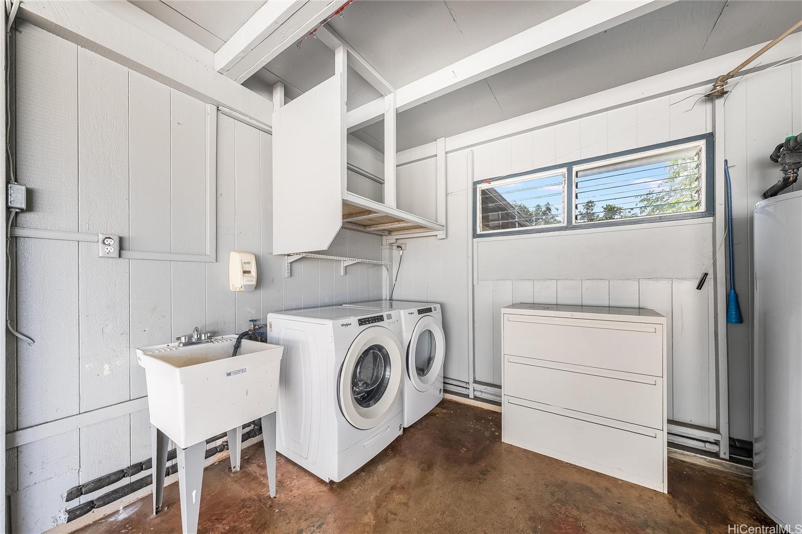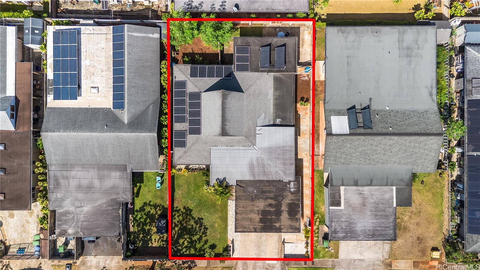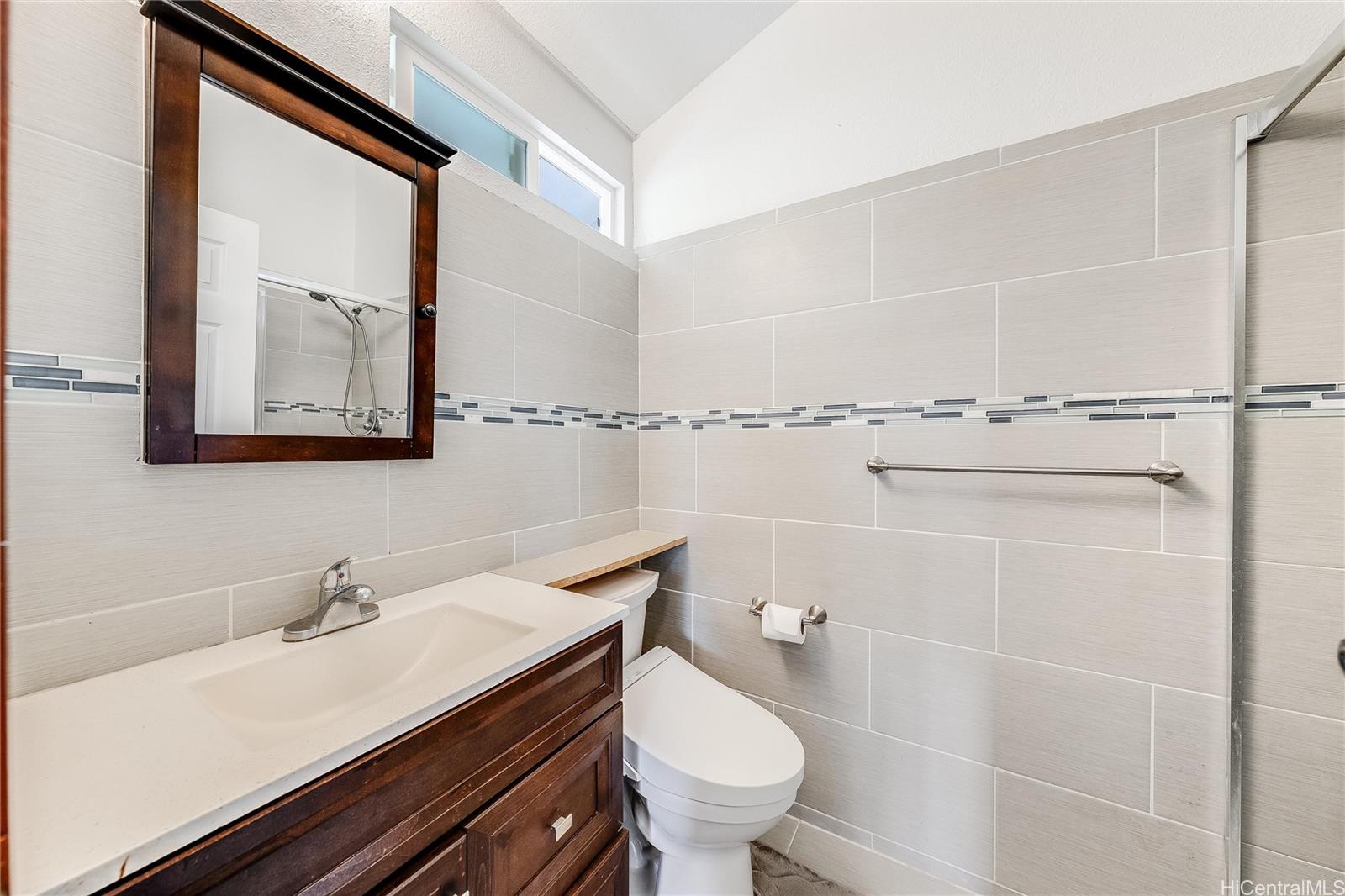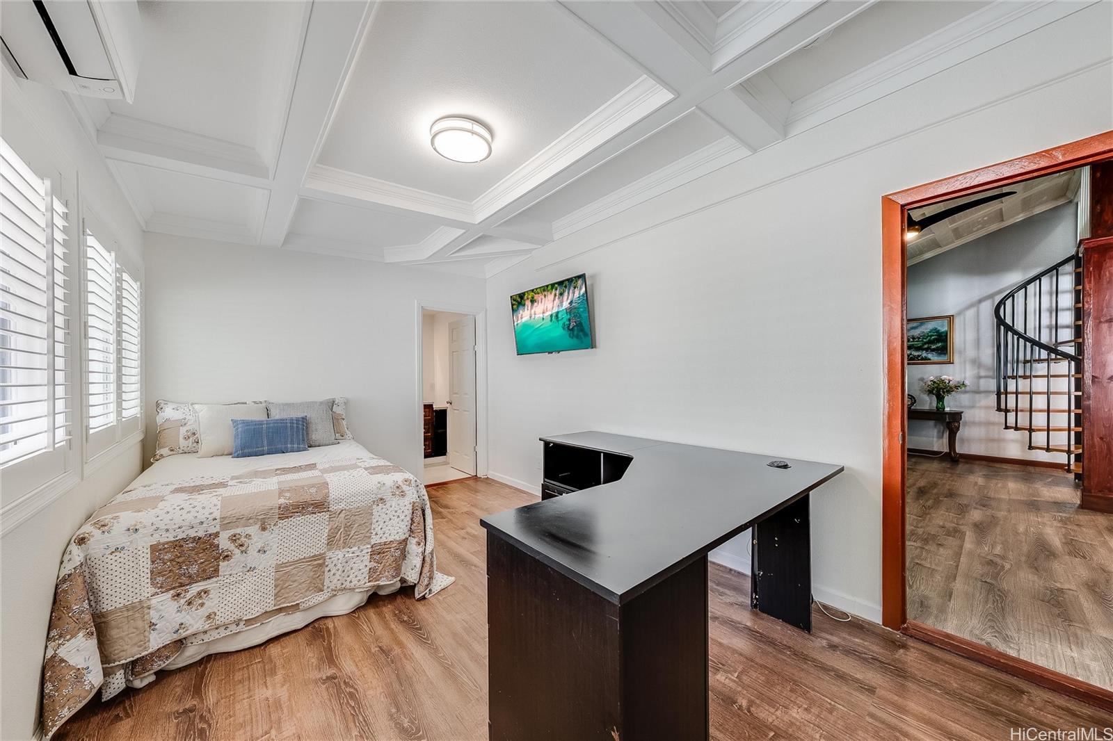A spiral staircase leads to a versatile loft space, perfect for a home office, creative studio, or cozy reading nook. Bathrooms have been beautifully remodeled with custom tilework. Twenty-four owned PV panels help you save on electricity all year long. A spacious garage, an expansive covered lanai, and front and back yards with fruit trees are just added bonuses to this Mililani gem.