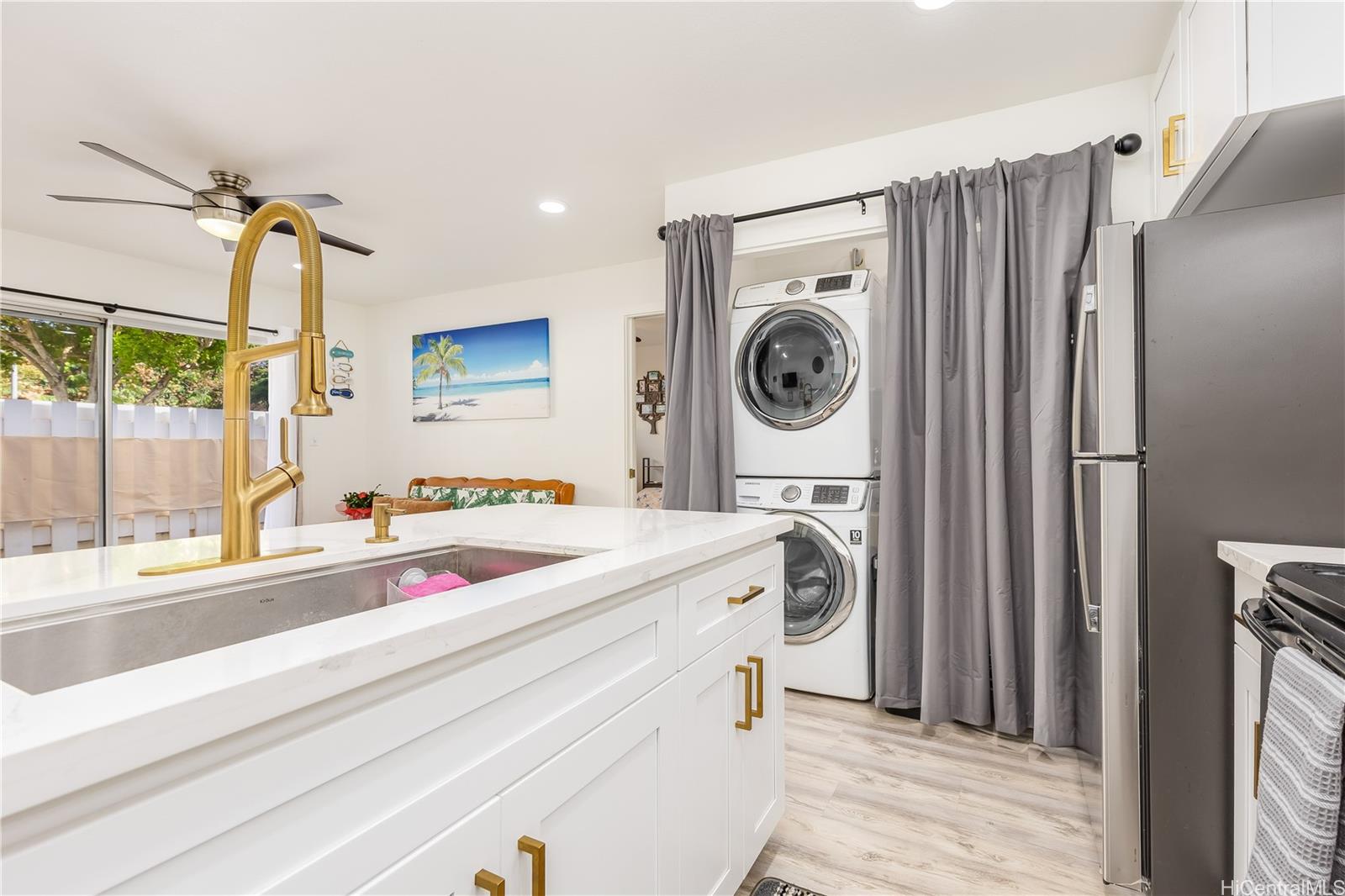 Ground floor 1-bedroom unit in Waipio Gentry featuring two assigned parking stalls plus plenty of nearby street parking. This fully renovated townhome offers an updated kitchen, luxury vinyl plank flooring, a full-size washer and dryer, a spacious walk-in closet, and a beautifully updated bathroom. Step outside to your own private fenced outdoor space perfect for your potted plants or for entertaining! Directly across the street, enjoy Waipio Neighborhood Park and walking paths throughout the community. You'll enjoy the convenience of being located just minutes from shopping, restaurants, banks and freeway on/off ramps.